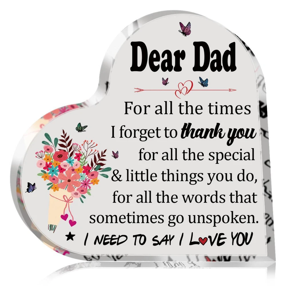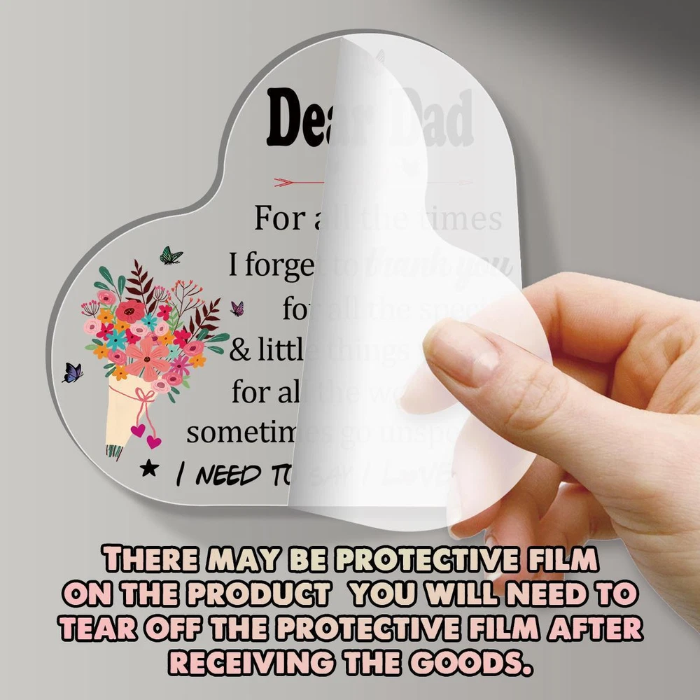 Free and fast shipping , shipping take up 1-7 Business Days 30 Day Return Accepted EASY PAYMENT via PayPal, Credit Card, PayPal Credit, Google Pay... Figurine Gift for Dad Plaque Clear Carved Small Novelty Romantic Home Decor 1PC Heart-shaped Plaque Birthday Gifts for Dad, Acrylic Keepsake Paperweight for Father's Day Thank You Dad Gifts Desk Plaque Sign For Table Decor Material: Acrylic Size: 3.94X3.94inch/ 10x10cm Package: 1PCS Pay attention : 1.There is protective film on product opposite. You need to tear off the film before using. 2. There are difference between the front and back. REVIEWS The product came very well packaged. I'm very happy. thank you for everything. Seller strongly recommended. This is great! I definitely recommend! Product looks amazing Delivery was fast. Excellent seller, great communication. I advise everyone to buy it!