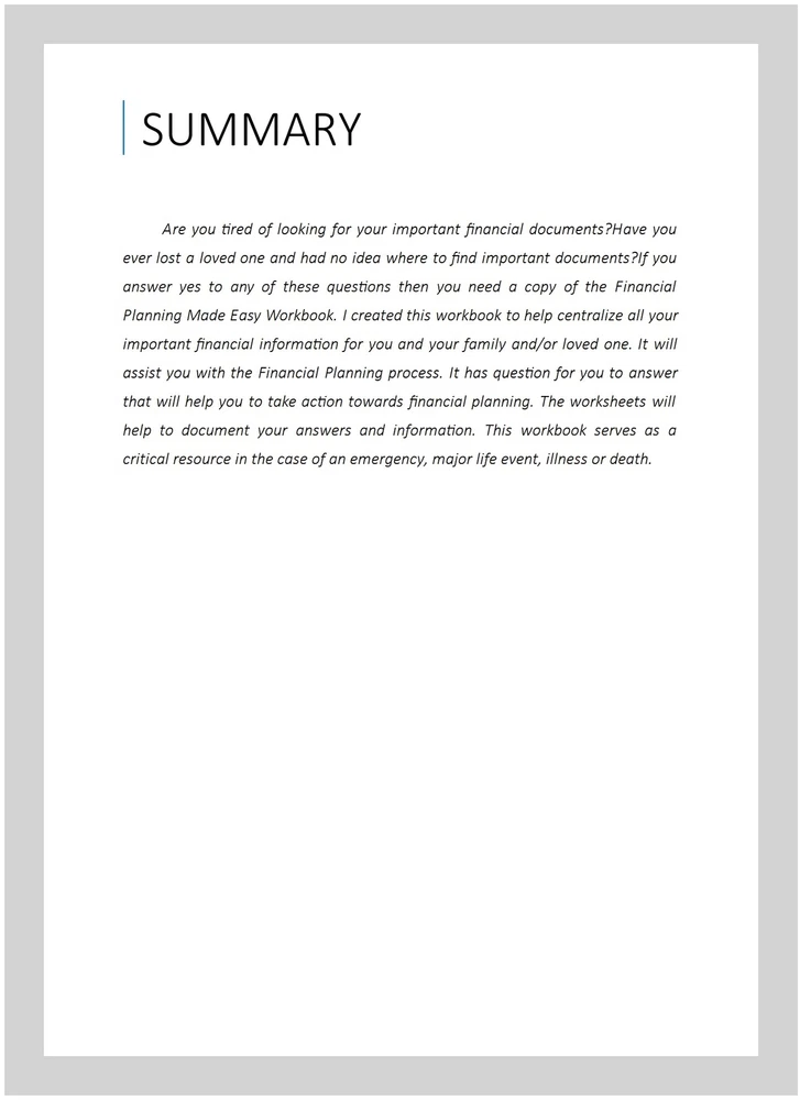 Financial Planning Made Easy, Paperback by Forbes, Elaine F., ISBN 1546618953, ISBN-13 9781546618959, Like New Used, Free shipping in the US Are you tired of looking for your important financial documents?Have you ever lost a loved one and had no idea where to find important documents?If you answer yes to any of these questions then you need a copy of the Financial Planning Made Easy Workbook. I created this workbook to help centralize all your important financial information for you and your family and/or loved one. It will assist you with the Financial Planning process. It has question for you to answer that will help you to take action towards financial planning. The worksheets will help to document your answers and information. This workbook serves as a critical resource in the case of an emergency, major life event, illness or death.