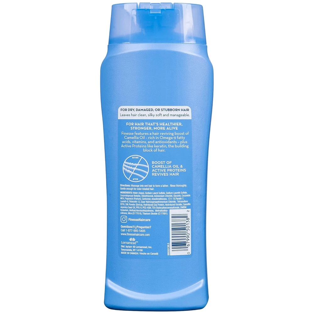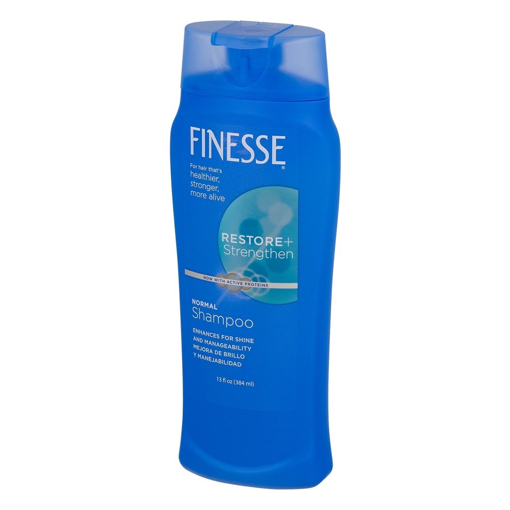 Finesse Self Adjusting Texture Enhancing Shampoo, Restore & Strengthen, Active Proteins, Unisex 13 Ounce (Pack Of 1) Finesse's unique self adjusting formula contains silk and soy proteins that protect the hair shaft with a coat of conditioning and shine. So, no matter how your hair is, the result is consistently beautiful hair. Get hair that’s healthier, stronger, and more alive with Finesse. Finesse Restore + Strengthen Normal Shampoo leaves hair clean, softer, and with an enhanced shine. This shampoo delivers more manageable hair that's easier to brush, comb and style. About this item ENHANCE SHINE AND MANAGEABILITY: Finesse Restore + Strengthen Normal Shampoo leaves your hair clean and looking shinier, softer, and silkier. This shampoo delivers more manageable hair that's easier to brush, comb and style. NOW WITH A HAIR REVIVING BOOST OF HYALURONIC ACID, CAMELLIA OIL & KERATIN: Revives hair with a beauty boost of ultra hydrating Hyaluronic Acid, Camellia Oil plus Keratin, the building block of hair. FOR HAIR THAT'S HEALTHIER, STRONGER, MORE ALIVE: Effectively revitalizes dry hair, damaged hair, dull hair, difficult hair or frizzy hair. Finesse products help transform hair so it looks and feels more alive. FINESSE HAIR CARE FOR WOMEN & MEN: Do you want healthy hair, silky hair, moisturized hair, or soft hair? Finesse products will help you improve the look and feel of your hair, while leaving it smelling fresh and clean with our signature fresh scent. Ingredients Water (Aqua); Ammonium Lauryl Sulfate; Ammonium Laureth Sulfate; Cocamide MEA; Silk Powder (Serica); Hydrolyzed Soy Protein; PEG-5 Cocamide; Fragrance; Ammonium Chloride; Carbomer; Dimethiconol; PPG-9; Guar Hydroxypropyltrimonium Chloride; Tetrasodium EDTA; DMDM Hydantoin; TEA-Dodecylbenzenesulfonate; Methylchloroisothiazolinone; Methylisothiazolinone; Mica (Cl 77019); Titanium Dioxide (Cl 77891)