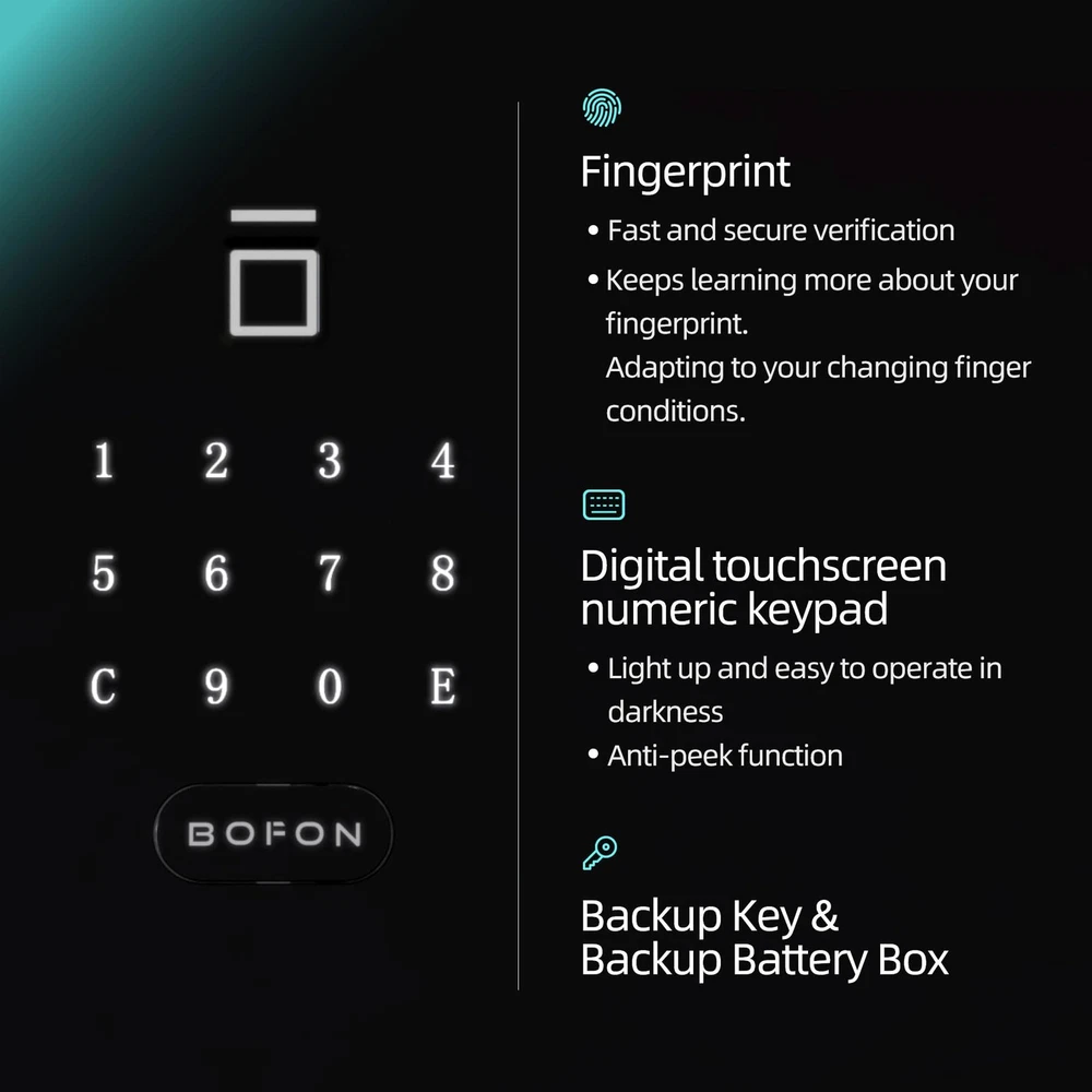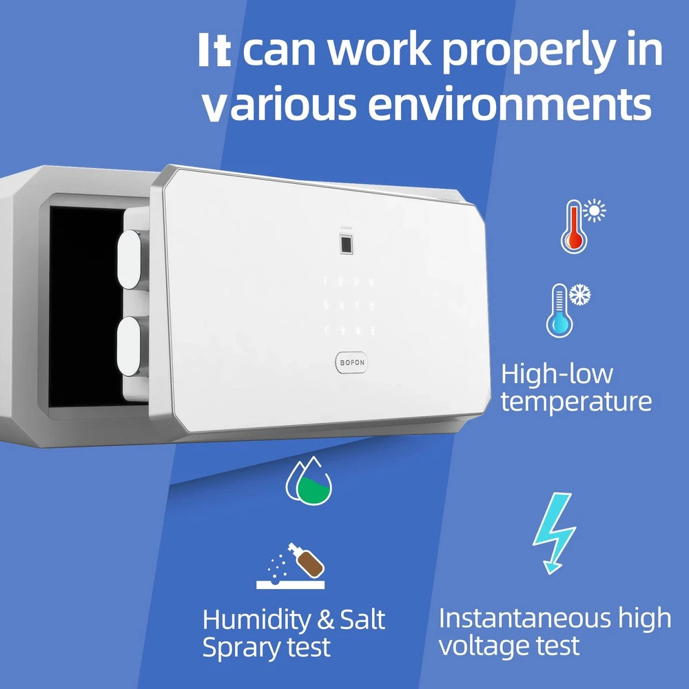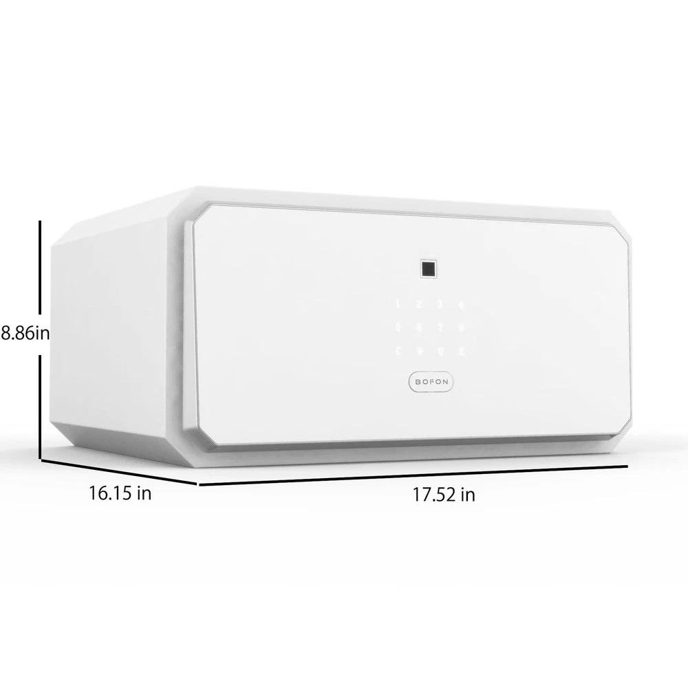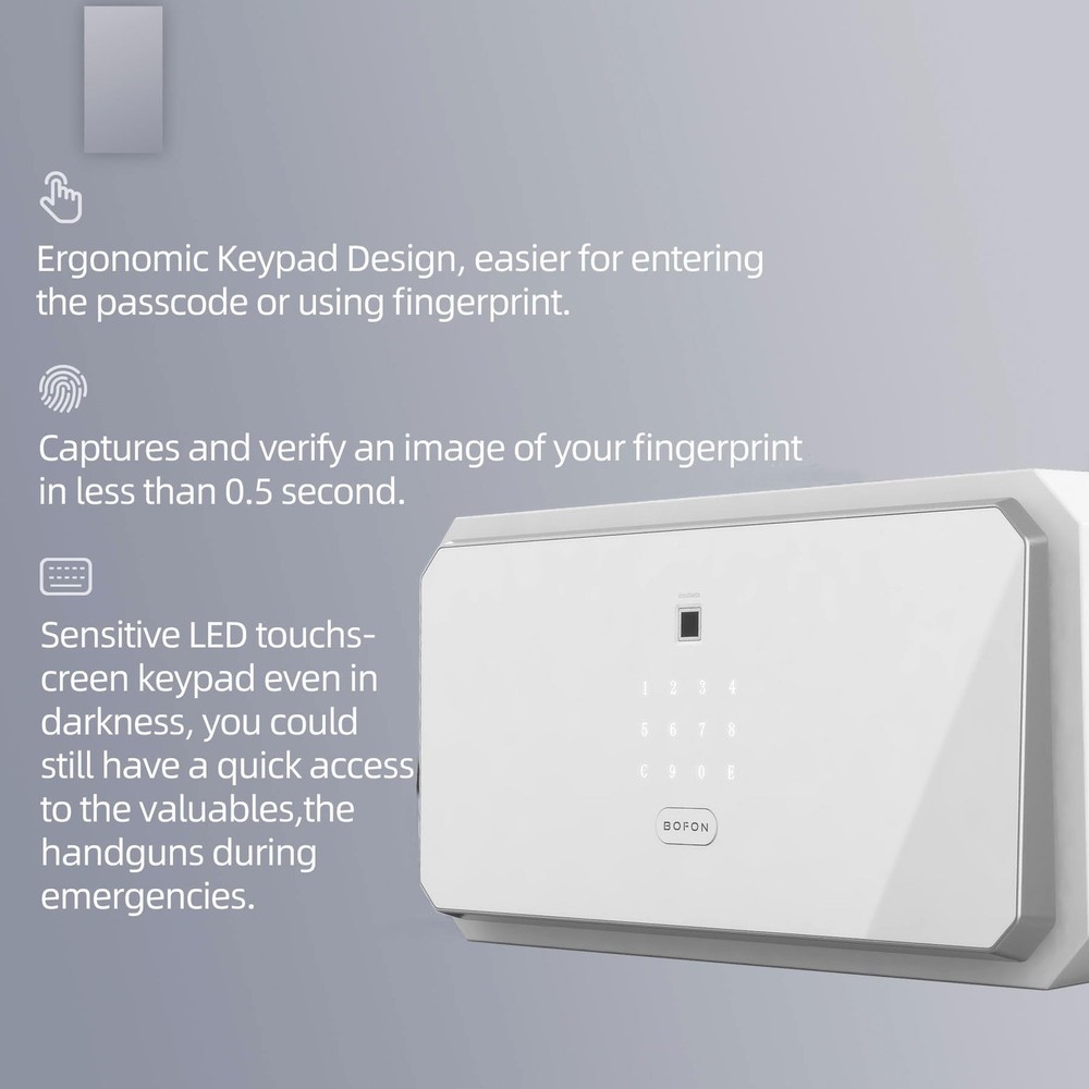 【Biometric Safe】The fingerprint safe box has sensitive biometric lock and automatic opening door gives.It also has ergonomic keypad Design. 【Powerful Functions】The fingerprint safe box has solid & large locking bolts.Enforced door frame part. Fully carpeted interior. Anchoring holes. Fingerprint input. Touchscreen keypad. Automatic opening & locking door. Backup keys. Backup battery port. 【Fingerprint】Fast and secure verification. Keeps learning more about your fingerprint. Adapting to your changing finger conditions. Digital touchscreen numeric keypad: Light up and easy to operate in darkness. Anti-peek function. 【Quick Access】The fingerprint safe just one touch of your finger, door will open automatically with reliable motorized mechanism, it’s simple as that. The home safe offering quick access security solutions for the home and office. 【It can work properly in various environments】The fingerprint safe has been tested for high-low temperature test. Humidity & Salt Spray test. Instantaneous high voltage test.The biometric safe has fully carpeted interior provide protection from scratch. 【Product Dimensions】8.86(H)*17.52(W)*16.15(D) inches 【Interior Dimensions】8.66(H) *17.33(W)*14.37(D) inches 【Item Weight】34 pounds