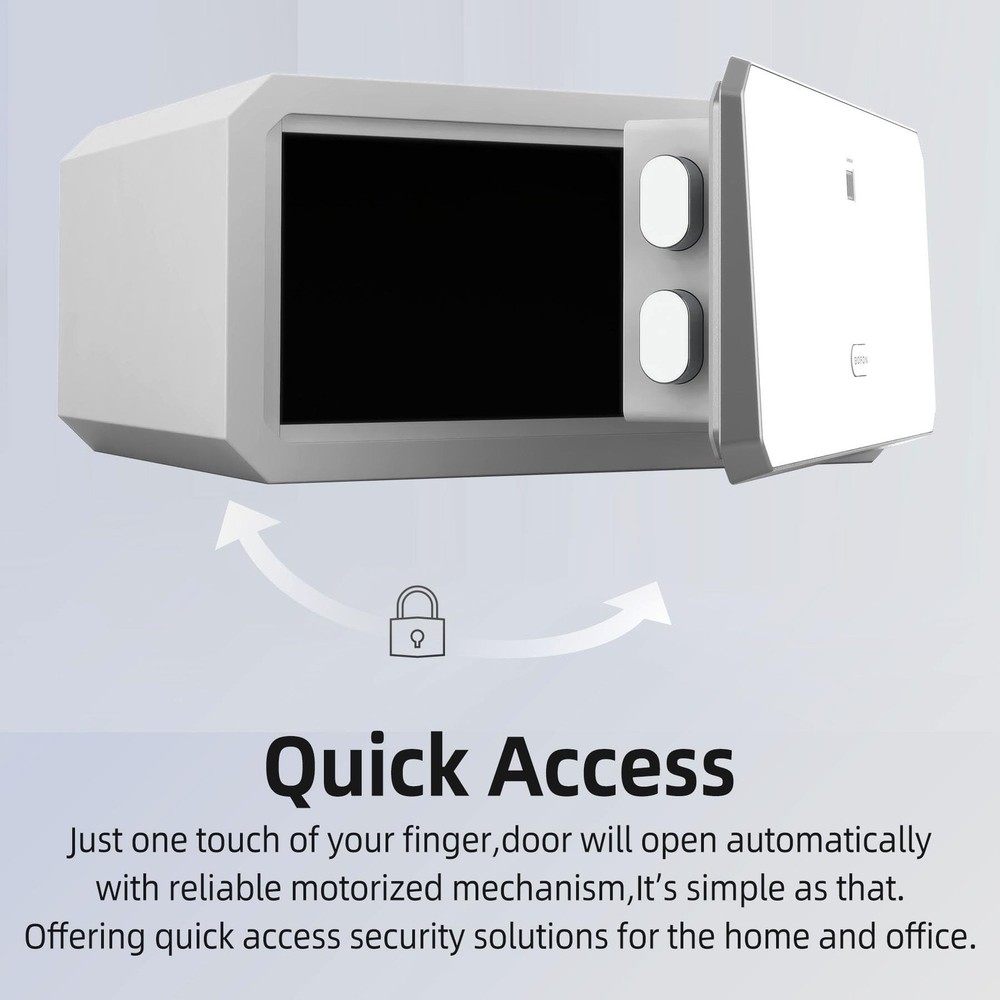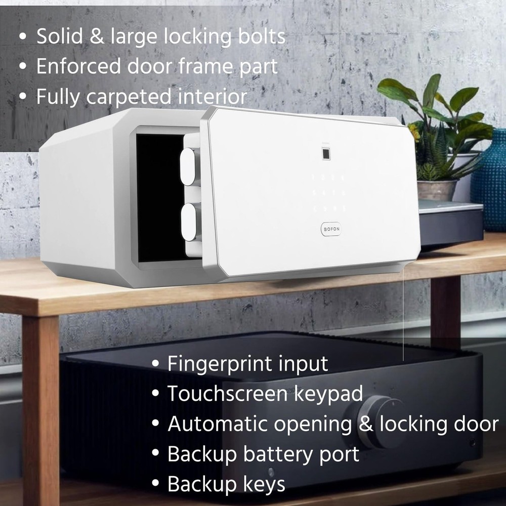 【Biometric Safe】The fingerprint safe box has sensitive biometric lock and automatic opening door gives.It also has ergonomic keypad Design. 【Powerful Functions】The fingerprint safe box has solid & large locking bolts.Enforced door frame part. Fully carpeted interior. Anchoring holes. Fingerprint input. Touchscreen keypad. Automatic opening & locking door. Backup keys. Backup battery port. 【Fingerprint】Fast and secure verification. Keeps learning more about your fingerprint. Adapting to your changing finger conditions. Digital touchscreen numeric keypad: Light up and easy to operate in darkness. Anti-peek function. 【Quick Access】The fingerprint safe just one touch of your finger, door will open automatically with reliable motorized mechanism, it’s simple as that. The home safe offering quick access security solutions for the home and office. 【It can work properly in various environments】The fingerprint safe has been tested for high-low temperature test. Humidity & Salt Spray test. Instantaneous high voltage test.The biometric safe has fully carpeted interior provide protection from scratch. 【Product Dimensions】8.86(H)*17.52(W)*16.15(D) inches 【Interior Dimensions】8.66(H) *17.33(W)*14.37(D) inches 【Item Weight】34 pounds