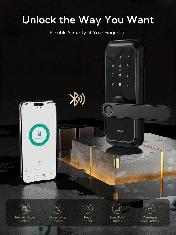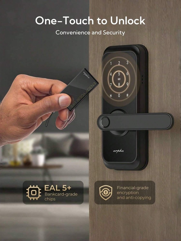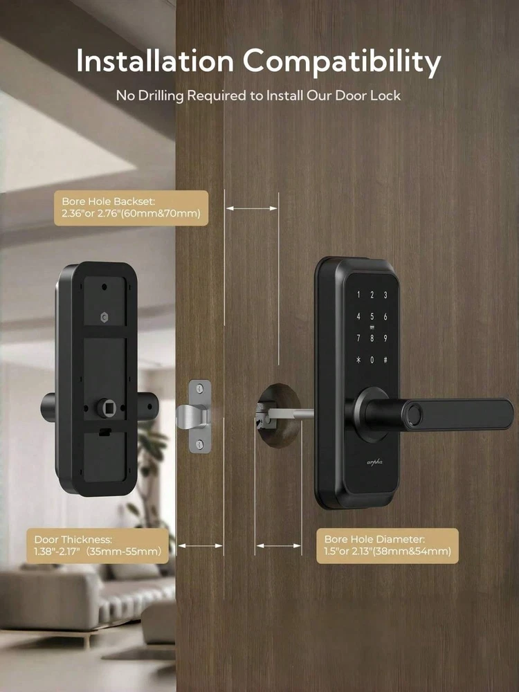 5 Ways to Unlock: Arpha keyless entry door lock could be unlocked via APP Access, Fingerprint Touch ID, Keypad Code, Fob, Traditional Key Unlock. Never get locked out again with multiple secure ways to access your home. APP Control: Keyless entry door lock deadbolt with handle set boasts an intuitive APP control, offering you the convenience of access management, user code editing, and tracking entry records from your smartphone. Arpha Gateway required for remote control this keyless entry door lock. AI Fingerprint door lock: Your Finger is Your Key! Fingerprint door lock recognition gets more precise with every touch, so you don't have to try agian and again to get in. Never be awkward or upset at unlocking the door. Anti-Peeping Password: Our electronic keypad door lock is equipped with an anti-peeping password function, providing enhanced security by masking your access code, deterring potential intruders. the door lock provides virtual password unlocking function. Users could enter 6~10 fixed password + 12~8 virtual password to unlock. Easy Installation: Smart door lock could easily be installed in few minutes with a screwdriver. Keyless entry door lock is suitable for backset scale range of 2-3/8 inches (60mm) and 2-3/4 inches (70mm), with door thickness ranging from 1-3/8 inches to 2-1/8 inches (35mm-55mm). Unlock Methods: Key, Fingerprint Recognition, NFC, APP Control, Fob Unlock, Passcode Unlock Color: Black Power Supply: Battery Powered(Others Battery) Batteries Included: No