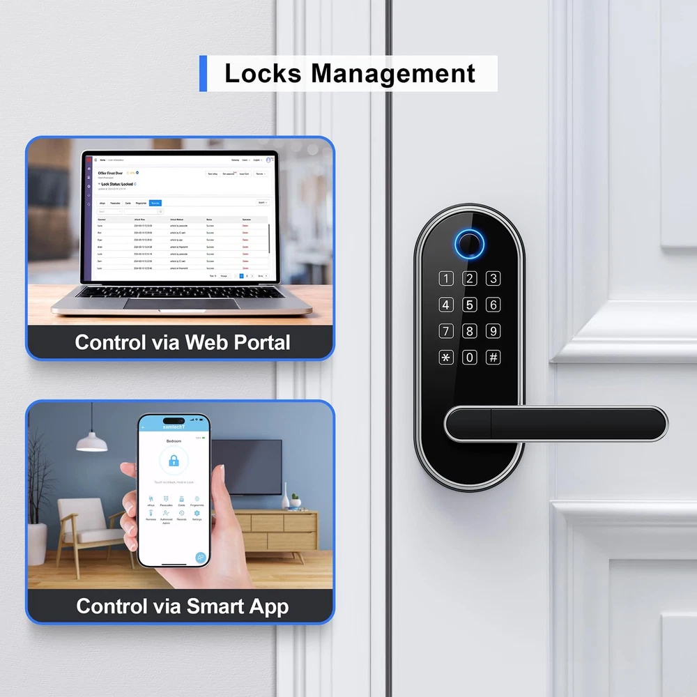[Fingerprint Unlock - Family Friendly] Unlocking with a fingerprint takes just 0.3 seconds, offering quick access for family members; our 508 DPI high-resolution fingerprint sensor ensures up to 99.99% recognition rate; track all unlocking history using the smart app. [Code Unlock - Guest Friendly] Remotely create instant or scheduled door codes for family, visitors, and guests using the smart app, even when you are not at the property; ideal for homeowners, rental hosts, and property managers. [Secure Your Home] Automatic door locking to ensure your door is always locked after you leave; an alarm will trigger if unwanted intruders try to enter; privacy mode disables all access methods from outside when you need it; stay informed about your door's activity with all security alerts pushed to your smart app. [One Card, All Locks] Use one card to unlock all doors, eliminating the need to carry multiple keys and the confusion of which key is for which door; this feature is especially friendly for property managers who manage many properties. [Voice Control] Works with Amazon Alexa and Google Assistant for hands-free control through voice commands like "lock the front door”, "unlock the front door”, "check lock status”, etc. (Gateway Required, Sold Separately) [Locks Management] Manage all the locks via the smart app and web portal; log in web portal with your app credentials. [Easy Installation] Easy to install with just a screwdriver in 20 mins; no extra drilling needed; no hardwiring; door handle is reversible for both right-handed and left-handed doors.