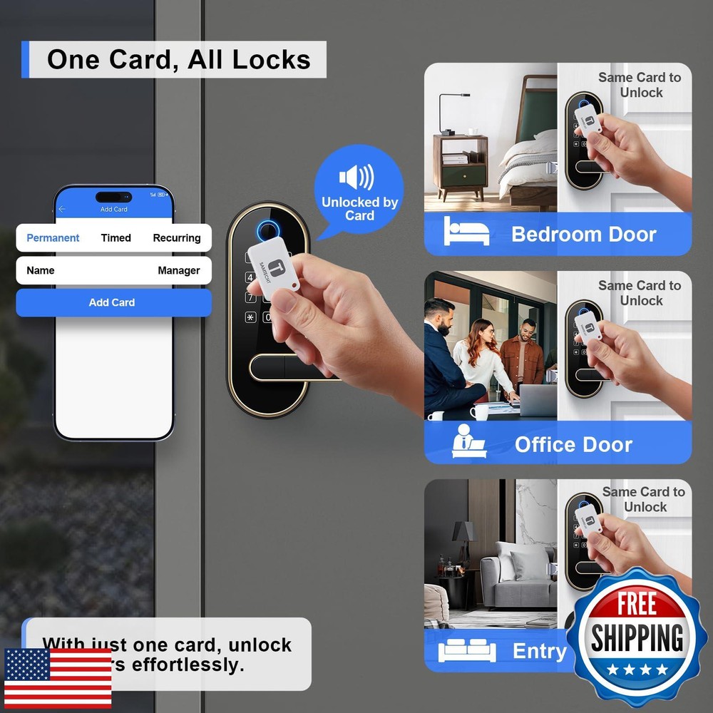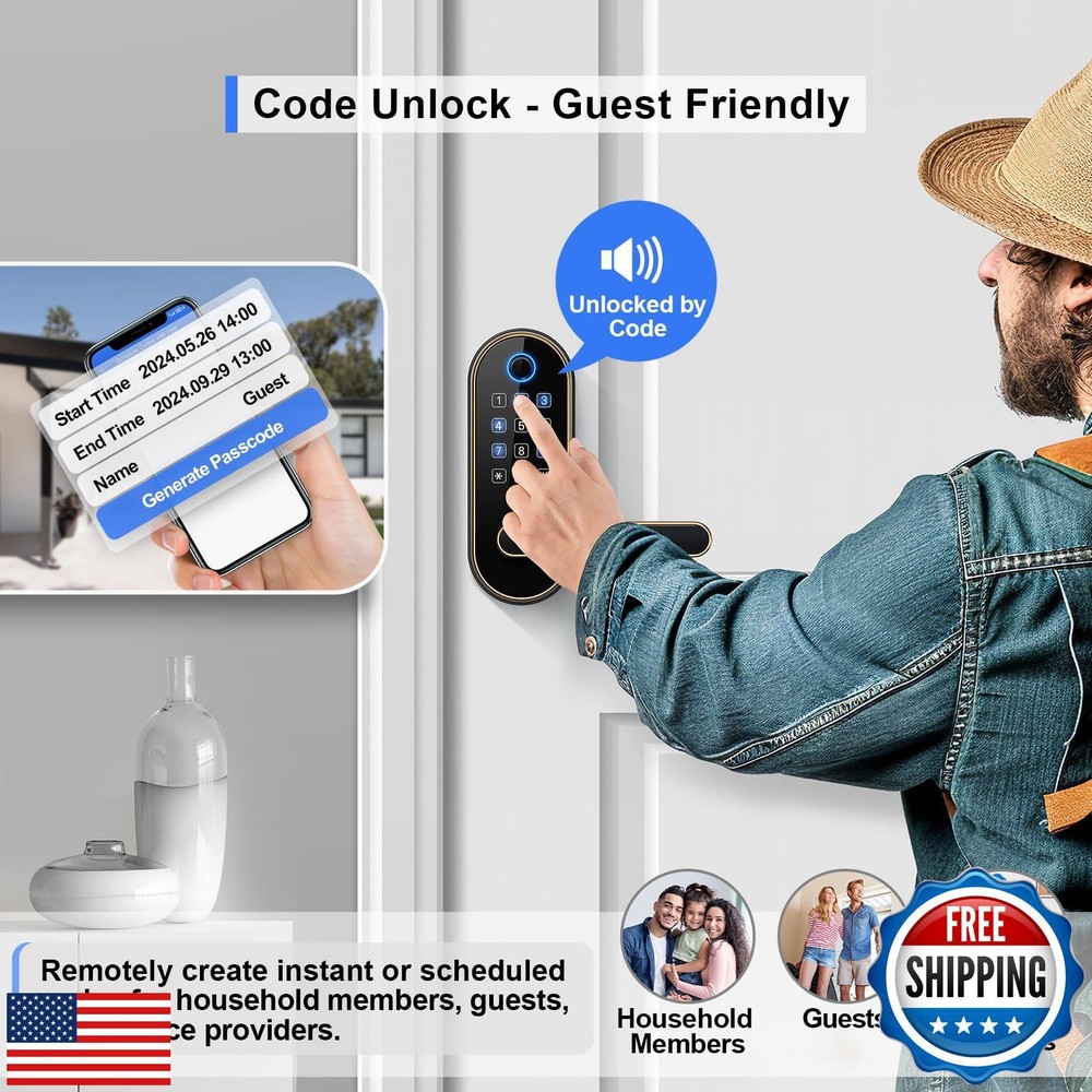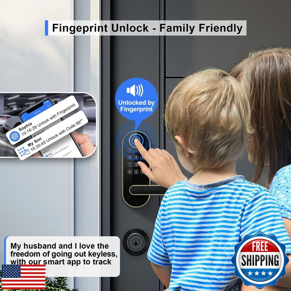 Keyless-Entry Keypad Fingerprint Smart Lock: Digital Door Lock with Code Passcode, Electronic Door Handle, Biometric Door Knob for Entry Door, Bedroom Door (Gold) Features [Fingerprint Unlock - Family Friendly] Unlocking with a fingerprint takes just 0.3 seconds, offering quick access for family members; our 508 DPI high-resolution fingerprint sensor ensures up to 99.99% recognition rate; track all unlocking history using the smart app. [Code Unlock - Guest Friendly] Remotely create instant or scheduled door codes for family, visitors, and guests using the smart app, even when you are not at the property; ideal for homeowners, rental hosts, and property managers. [Secure Your Home] Automatic door locking to ensure your door is always locked after you leave; an alarm will trigger if unwanted intruders try to enter; privacy mode disables all access methods from outside when you need it; stay informed about your door's activity with all security alerts pushed to your smart app. [One Card, All Locks] Use one card to unlock all doors, eliminating the need to carry multiple keys and the confusion of which key is for which door; this feature is especially friendly for property managers who manage many properties. [Voice Control] Works with Amazon Alexa and Google Assistant for hands-free control through voice commands like "lock the front door”, "unlock the front door”, "check lock status”, etc. (Gateway Required, Sold Separately) [Locks Management] Manage all the locks via the smart app and web portal; log in web portal with your app credentials. [Easy Installation] Easy to install with just a screwdriver in 20 mins; no extra drilling needed; no hardwiring; door handle is reversible for both right-handed and left-handed doors. Shipping Free & Fast Shipping: We offer free shipping to most of the USA with a normal delivery time of 3-7 days. However, due to the current situation, additional delivery time (up to 3 weeks) may be required for some items. Alternative Carriers: We may use alternative carriers (e.g., USPS, FedEx, UPS) to ensure your package arrives safely and on time. Due to the use of multiple carriers, we are unable to provide a tracking number automatically. Handling Time: Orders are processed and shipped within 1-2 business days of receiving cleared payment. Shipping Restrictions: Shipping to Alaska, Hawaii, Puerto Rico, Guam, and other US territories may incur shipping charges or delivery restrictions. Please contact us before ordering, or your order can be refunded/cancelled. State Restrictions: Certain items may not be shipped to California due to state regulations. Contact for Tracking Updates: If you require tracking updates or have any concerns about the delivery of your order, please feel free to contact us, and we will be happy to assist you. Return Policy 30-Day Hassle-Free Returns: If you are not completely satisfied with your purchase, you can return the item for free within 30 days of receiving it for a full refund or exchange. Easy Return Process: Contact us, and we will provide you with a prepaid return shipping label and detailed instructions. No Restocking Fee: There are no restocking fees for returns. However, the buyer is responsible for return shipping costs if the return is not due to a seller's error. Refund Processing: Refunds will be processed within 1 business day of receiving the returned item in its original condition. Payment We accept all major credit cards, PayPal, and Apple Pay for your convenience. Your payment information is secure and encrypted to ensure a safe and seamless transaction. Please complete your payment within 3 days of purchase to avoid any delays in shipping. Feedback Your feedback is extremely important to us. We strive to provide the best products and customer service possible. If you are satisfied with your purchase, please take a moment to leave us a positive review. If you have any concerns or issues with your order, please contact us before leaving negative feedback. We are committed to resolving any problems and ensuring your satisfaction. Contact Us If you have any questions or concerns, please feel free to reach out to our customer support team. You can contact us through the eBay messaging system. We are available Monday to Friday, 9:00 am to 5:00 pm EST, and we will do our best to respond to your inquiry within 24 hours. Thank you for supporting our small family business!