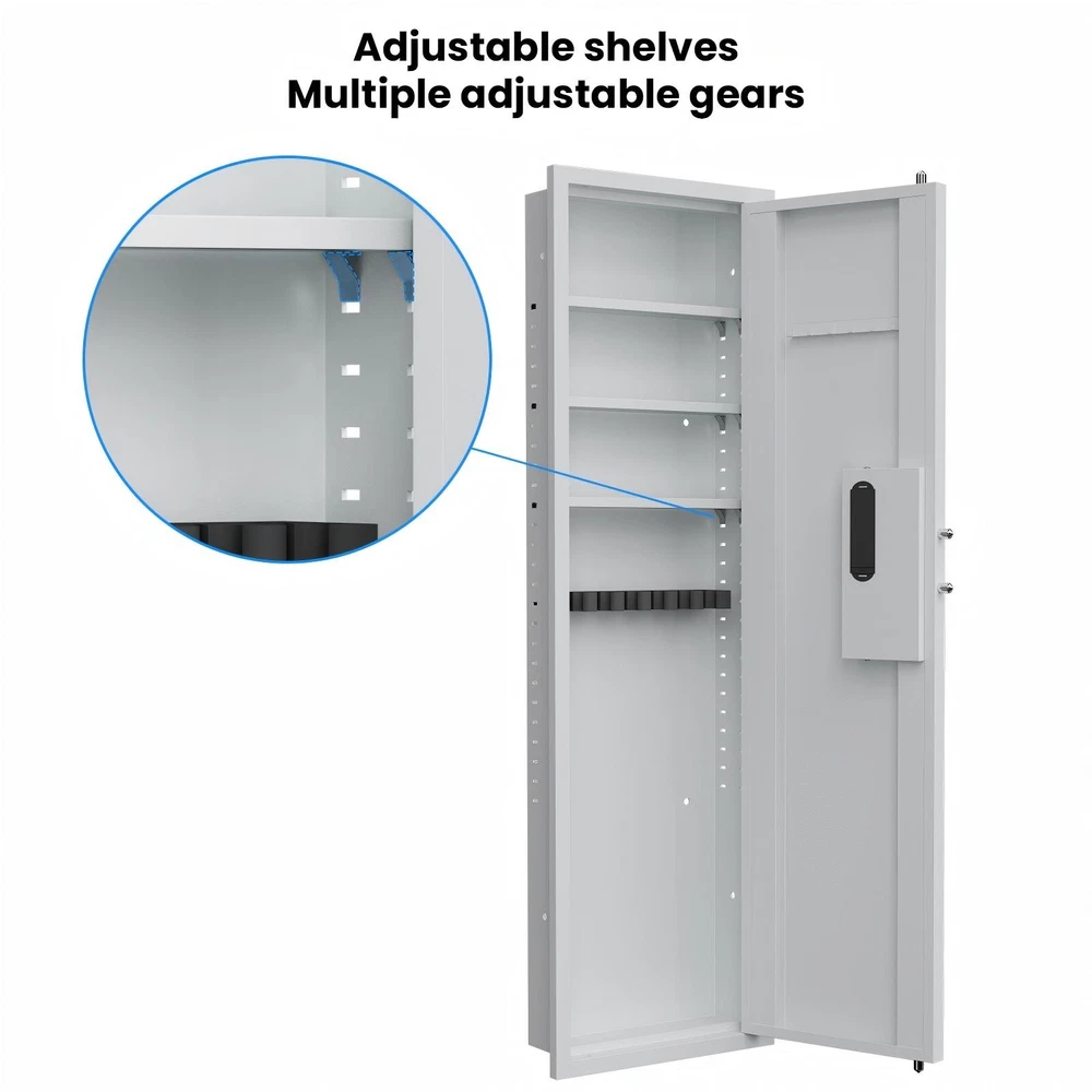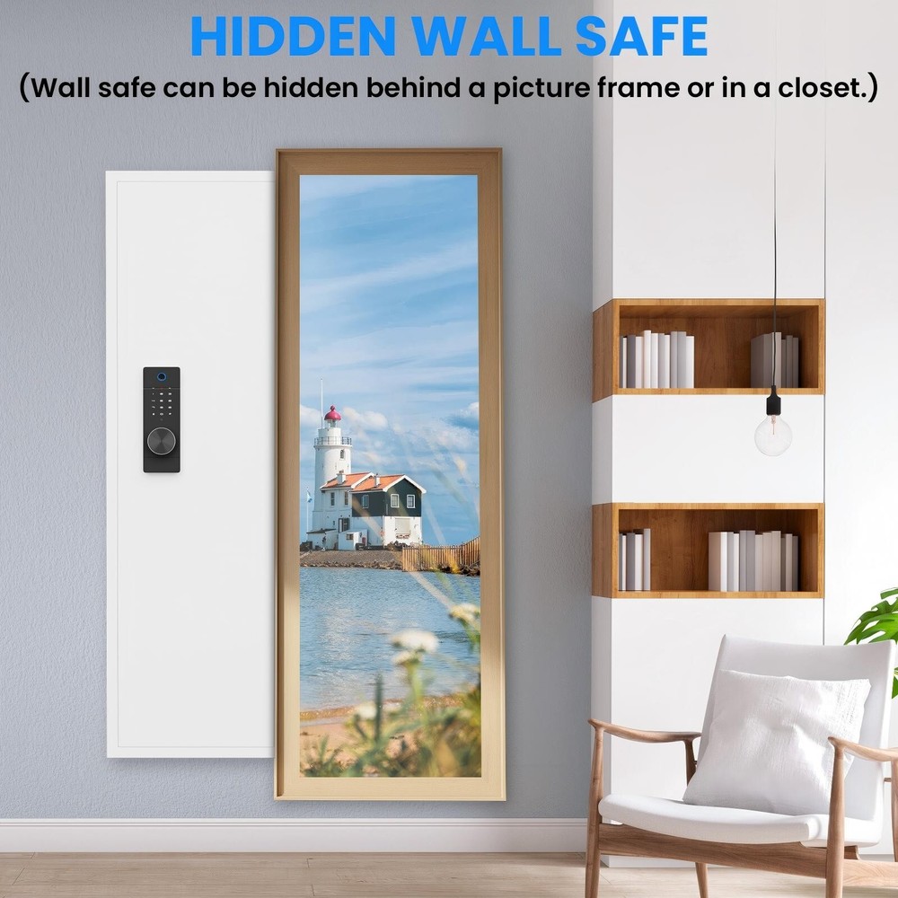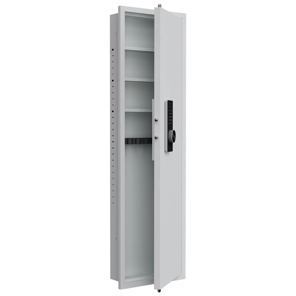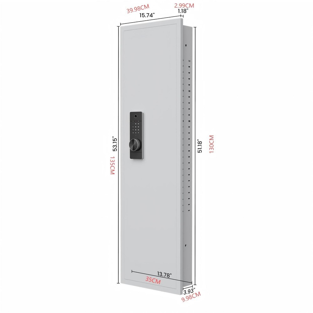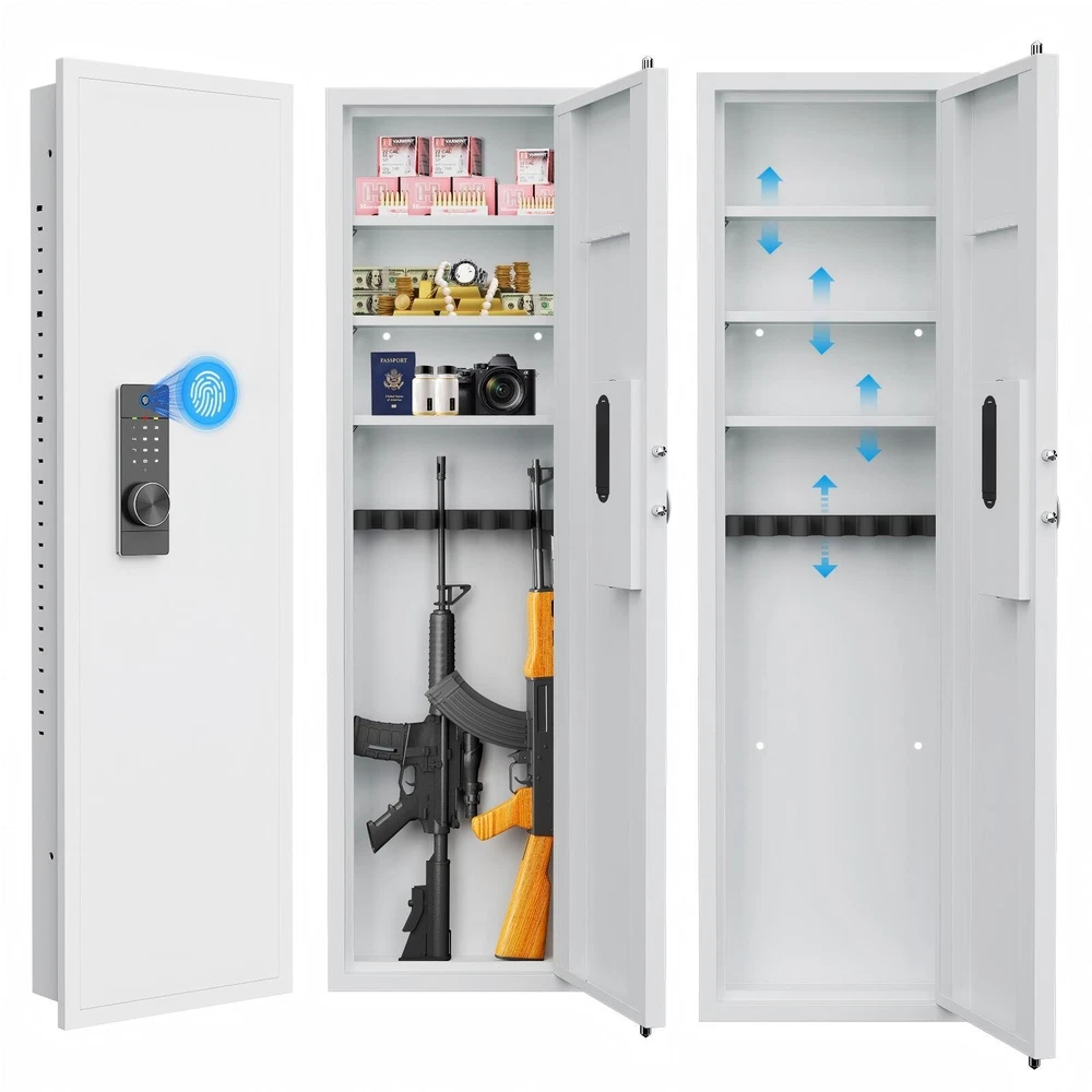 Dear customers, to celebrate the opening of our new store, we are offering the following promotional activities: 1. Customers can enjoy a 5% discount on purchases over $50 for all products in the store; 2. Each person can enjoy the right to use the coupon three times; 3. In addition, our store supports a 30 day return and exchange policy; 4. Some products are free of shipping. Wishing you a pleasant shopping experience~ Specification Product Information Item Code: W1779P207551 Product Type: General Item Product Name: 53" Fingerprint Touch Panel In-Wall Safe,Hidden Wall Gun Safe for Rifles with Adjustable Shelves,Assembled Storage Multifunctional Wall Safe for Firearm and Valuables (Black-Fingerprint) Main Color: White + Fingerprint Main Material: Steel Product Dimensions Assembled Length (in.): 15.70 Assembled Width (in.): 5.00 Assembled Height (in.): 53.00 Weight (lbs.): 41.00 Package Size Length (in.): 20.65 Width (in.): 7.87 Height (in.): 57.65 Weight (lbs.): 49.50 Product Features Our wall safe can perfectly protect documents, passports, jewelry, cash, firearms, medicines, and other valuable items. Its spacious interior space and concealed dimensions provide protection. Our heavy-duty steel wall mounted safe features 4 solid bolts on three sides, all metal doors, and a scratch resistant powder coating for long-lasting protection. Its design is to resist forced entry and deter thieves. Our wall safe has ultimate durability and safety, with anti-theft and anti pry defense functions. Adopting biometric fingerprint technology, its advanced security measures ensure maximum prevention of unauthorized access. The wall safe is equipped with a highly recognizable touch screen panel, which responds quickly and is easy to operate. Advanced touch technology provides a seamless user experience and enables easy access.