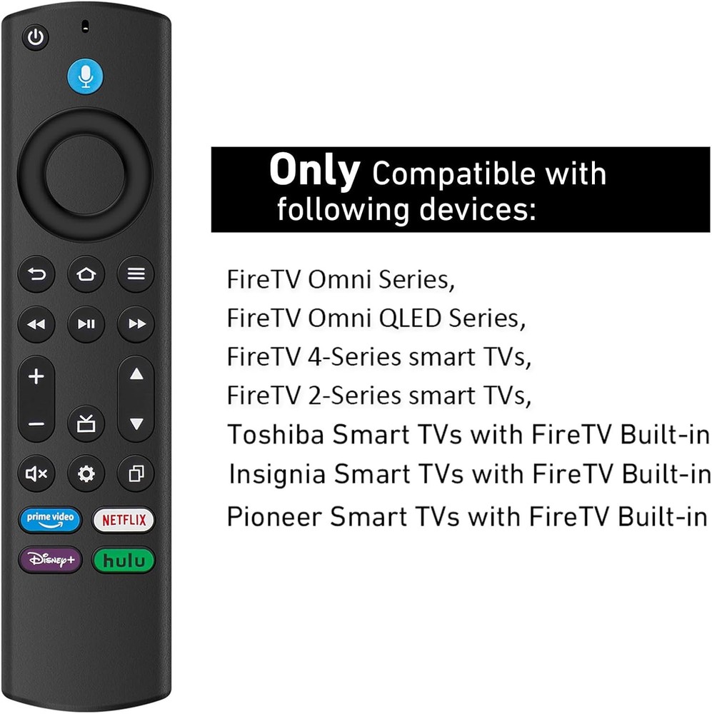 Replacement Remote Control Compatible with FireTV and Toshiba, Pioneer Black Product Details Package Dimensions: 6.34 x 1.69 x 0.94 inches Item Weight: 2.08 ounces Manufacturer: Gotellx Brand: Gotellx Special Feature: Voice Search, Please remember to follow the instructions to pairing and set up your remote before using it, or it may not work. Voice Search, Please remember to follow the instructions to pairing and set up your remote before using it, or it may not work.Voice Search, Please remember to follow the instructions to pairing and set up your remote before using it, or it may not work. See more Color: Black Max Number of Supported Devices: 1 Compatible Devices: ONLY compatible with FireTV Omni Series, FireTV Omni QLED Series, FireTV 4-Series, and FireTV 2-Series smart TVs and Toshiba, Pioneer or Insignia Smart TVs with Fire's Smart TV Built-in., Not compatible with fire stick. ONLY compatible with FireTV Omni Series, FireTV Omni QLED Series, FireTV 4-Series, and FireTV 2-Series smart TVs and Toshiba, Pioneer or Insignia Smart TVs with Fire's Smart TV Built-in., Not compatible with fire stick.ONLY compatible with FireTV Omni Series, FireTV Omni QLED Series, FireTV 4-Series, and FireTV 2-Series smart TVs and Toshiba, Pioneer or Insignia Smart TVs with Fire's Smart TV Built-in., Not compatible with fire stick. See more ONLY compatible with FireTV Omni Series, FireTV Omni QLED Series, FireTV 4-Series, and FireTV 2-Series smart TVs and Toshiba, Pioneer or Insignia Smart TVs with Fire's Smart TV Built-in. Can NOT for other streaming media devices or smart TVs. Get to your favorite content quickly and easily with preset app buttons. Subscriptions may be required. 【 Voice Control Function 】Use your voice to find your shows, open apps, manage volume just as your original remote control. Requires 2 AAA batteries, not included. Please remember to follow the instructions to pairing and set up your remote before using it, or it may not work.