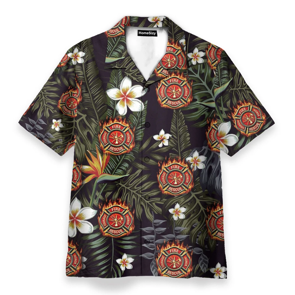 Firefighter Tropical Leaves Pattern Hawaiian Shirt Beach Shorts