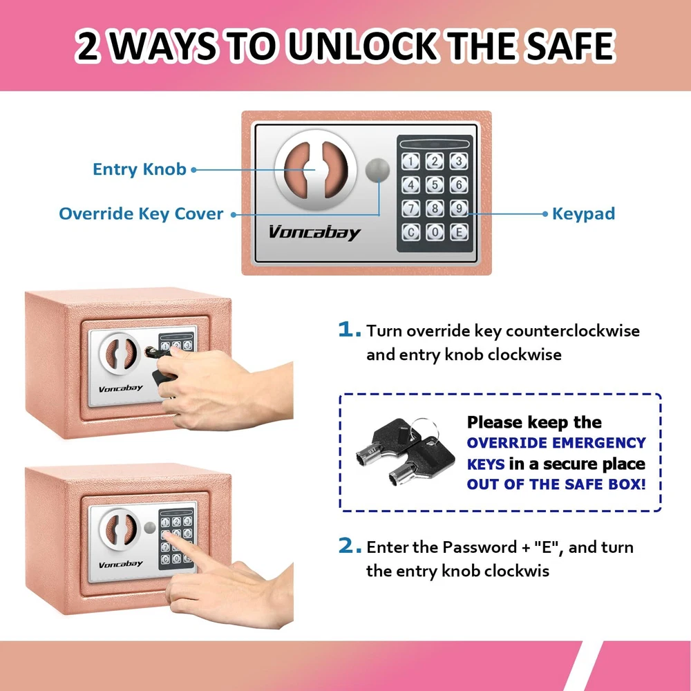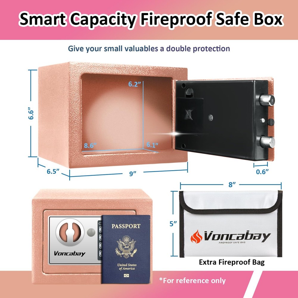 Money Safe Box for Home with Sensor Light & Fireproof Security Safe Box for Money Safe with Keys & Pass Code, Lock Box Fireproof Safe with Digital Keypad Gold Khaki [Security Safe Box with Intelligent Sensor Light]: Small Safe Box for Home automatically turns on the light after you open the safety box by Using Keypad, soft light makes it easy for you to get the items you need without hurting your eyes and it will turn off after 30 seconds. Additionally, our numeric keypad of Security Safe Box will remind you whether the password is correct with an indicator light and remind you battery is about to run out by lighting up a red light. [Cash Safe Box & Fireproof Bag - Excellent Safety Performance]: Made of reinforced alloy steel, our Lock Box Fireproof Safe without holes has two enhanced steel bolts, pry-resistant concealed hinges and a tamper-proof doors, which provides physical protection against forced entry. It also comes with a Waterproof and Fireproof Document Bag which is perfect to protect your small valuables. The combination of Steel Safes and Fireproof Waterproof Bags can give your valuables a double protection. [Easy to Set Up]: Only 4 STEPS to set a password for the Fireproof Box. Step 1, Remove the Override Key Cover and use the Override Key to open the safe; Step 2, Remove battery compartment cover of lock safe box and install the 4 x "AA" batteries in the correct directions; Step 3, Press the reset button; Step 4, Enter the new password in 15 seconds and end with "E". Press "C" to clear entry if wrong digit is entered. Please keep override keys in a safe place outside the safe with keypad. [2 Ways to Unlock the Money Safe Box]: Small Money Safe has 2 unlock ways: 1) insert the Emergency Backup Keys into the mini safe and turn left, then turn entry knob clockwise to open the personal safe box; 2) use the Numeric Keyboard to enter the password followed by "E", then turn the knob clockwise to open. Our security box offers Security Lockout System: if an incorrect password is entered three times in a row, the digital keypad will begin a five-minute security lockout period. [Smart Capacity Fireproof Safe Box ]: Exterior: 9 x 6.6 x 6.5 inches; Interior: 8.6 x 6.2 x 6.1 inches; Thickness of the latches are 0.6 inch. With only 0.23 Cubic Feet, our Mini Hidden Safe Box can be used as a hotel safe, a closet safe, a wall safe, a floor safe and a fireproof cash box, which can be placed in wardrobes, drawers, and bedside tables. Please Pay Attention to the Size of the Safe Before Purchasing. Shipping We offer FREE shipping on all orders! We ship within Three business days of payment, usually sooner. We use a selection of shipping services such as UPS, FedEx, USPS etc. We only ship to the lower 48 states, no APO/FPO addresses or PO Boxes allowed. Local pickups and combined shipping options are not provided at this time. Return You can return a product for up to 30 days from the date you purchased it. Any product you return must be in the same condition you received it and in the original packaging. Please keep the receipt. Payment We accept payment by any of the following methods: PayPal Please pay as soon as possible after winning an auction, as that will allow us to post your item to you sooner! Feedback Customer satisfaction is very important to us. If you have any problem with your order, please contact us and we will do our best to make you satisfied. Contact Us If you have any queries, please contact us via ebay. We usually respond within 24 hours on weekdays. Please visit our eBay store to check out other items for sale! Thank you for shopping at our store.