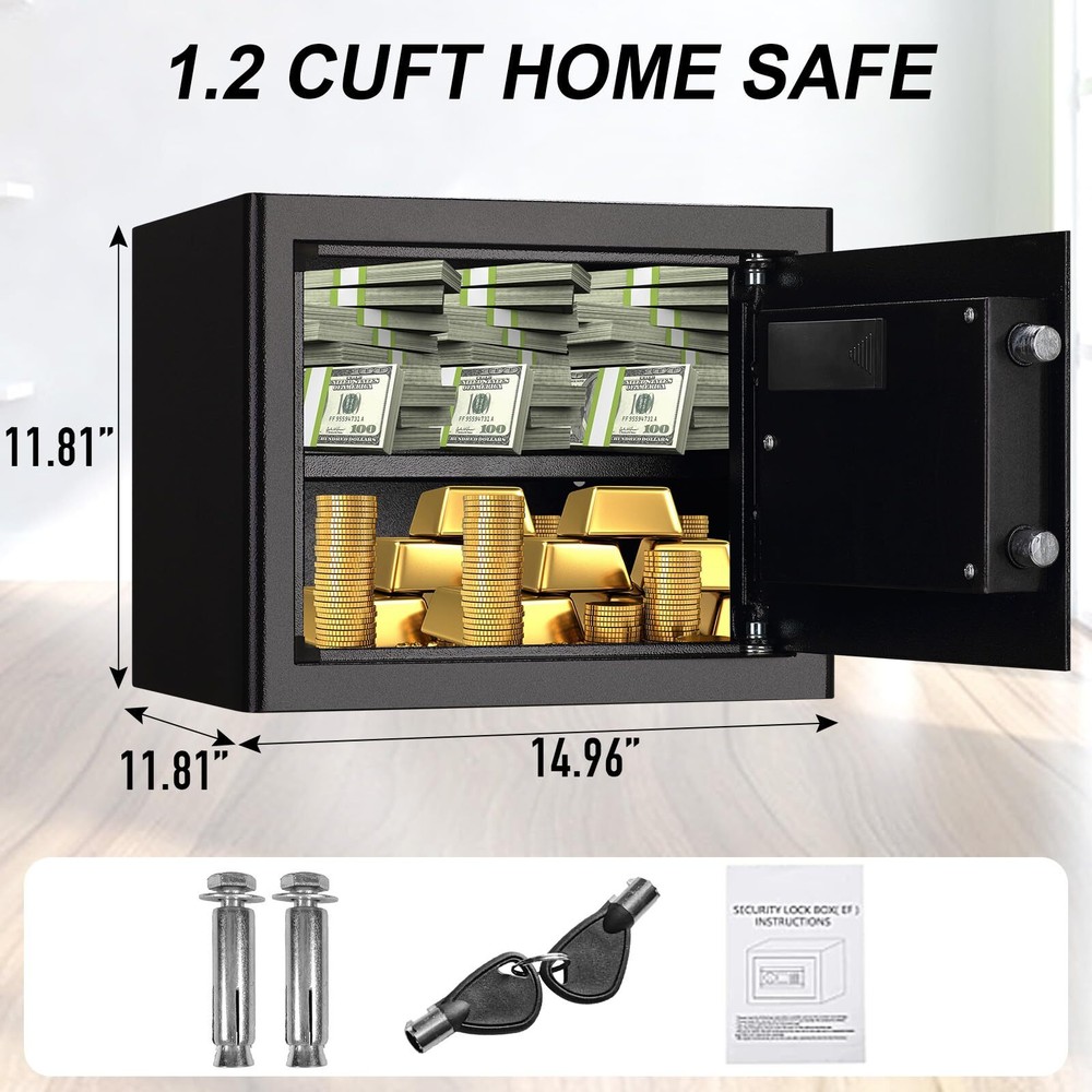 Fireproof Safe Box 1.2 Cuft Electronic Digital Security Box, Keypad Small Lock Box Cabinet Safes with Internal Light, Solid Alloy Steel Office Hotel Home Safe with 2 Passwords, Black ✅Stronger Material: safe box is made of the better solid steel, this home safe is built to last and can withstand harsh conditions without showing signs of wear and tear. This security safe has a pry-resistant steel door and concealed pry-resistant hinges to offer you complete peace of mind. It ensures that your cabinet safe is stronger and more durable. If necessary, you can fix it on the wall. ✅Reliable Locking System: Set 2 passwords of your own! The stronger solid steel structure ensures maximum security and prevents unauthorized access to your valuables, only use the key or the password you set, the door will open. ✅Better Configuration: security box has the newest humanize design. There is a carpet inside the safe, which can prevent your valuables from being worn out. In addition, with a built-in light that turns on automatically when you unlock the safe, you can easily find and retrieve your items, even in the dark. ✅Necessary Alarm System: home safe has a good alarm that goes off if an incorrect password is entered 3 times in a row. You can open the safe by key and remove the battery to stop the beeps. ✅Size and Package: Exterior Size: 14.96"*11.81"*11.81". Interior size: 14.76"*11.61"*11.61" (Please pay full attention to the dimension for this smart safe box before you buy it). This size is very suitable for use for hotel, home, office safe. Package includes: 1*cabinet safe, 2*keys, 2*mounting screws, 1*user manual and 1*external battery compartment. ❗If you have any questions about the product, please feel free to contact us, and we will do our best to solve the matter for you.❗ Shipping We offer FREE shipping on all orders! We ship within Three business days of payment, usually sooner. We use a selection of shipping services such as UPS, FedEx, USPS etc. We only ship to the lower 48 states, no APO/FPO addresses or PO Boxes allowed. Local pickups and combined shipping options are not provided at this time. Return You can return a product for up to 30 days from the date you purchased it. Any product you return must be in the same condition you received it and in the original packaging. Please keep the receipt. Payment We accept payment by any of the following methods: PayPal Please pay as soon as possible after winning an auction, as that will allow us to post your item to you sooner! Feedback Customer satisfaction is very important to us. If you have any problem with your order, please contact us and we will do our best to make you satisfied. Contact Us If you have any queries, please contact us via ebay. We usually respond within 24 hours on weekdays. Please visit our eBay store to check out other items for sale! Thank you for shopping at our store.