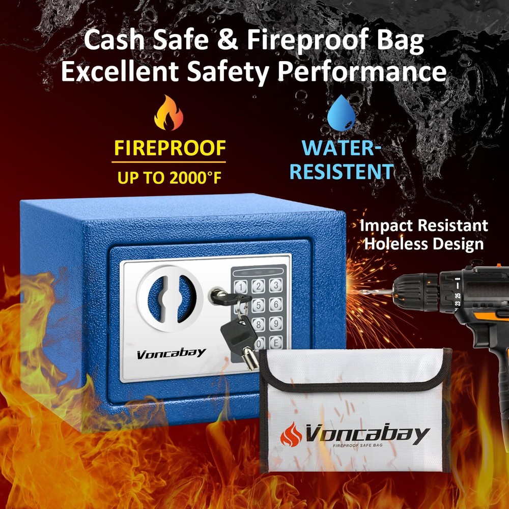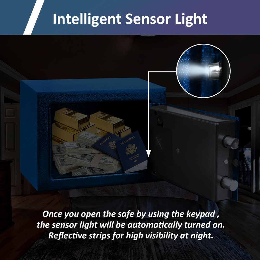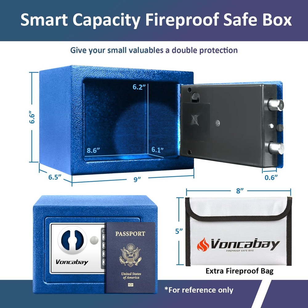 Money Safe Box for Home with Sensor Light & Fireproof Security Safe Box for Money Safe with Keys & Pass Code, Lock Box Fireproof Safe with Digital Keypad Blue [Security Safe Box with Intelligent Sensor Light]: Small Safe Box for Home automatically turns on the light after you open the safety box by Using Keypad, soft light makes it easy for you to get the items you need without hurting your eyes and it will turn off after 30 seconds. Additionally, our numeric keypad of Security Safe Box will remind you whether the password is correct with an indicator light and remind you battery is about to run out by lighting up a red light. [Cash Safe Box & Fireproof Bag - Excellent Safety Performance]: Made of reinforced alloy steel, our Lock Box Fireproof Safe without holes has two enhanced steel bolts, pry-resistant concealed hinges and a tamper-proof doors, which provides physical protection against forced entry. It also comes with a Waterproof and Fireproof Document Bag which is perfect to protect your small valuables. The combination of Steel Safes and Fireproof Waterproof Bags can give your valuables a double protection. [Easy to Set Up]: Only 4 STEPS to set a password for the Fireproof Box. Step 1, Remove the Override Key Cover and use the Override Key to open the safe; Step 2, Remove battery compartment cover of lock safe box and install the 4 x "AA" batteries in the correct directions; Step 3, Press the reset button; Step 4, Enter the new password in 15 seconds and end with "E". Press "C" to clear entry if wrong digit is entered. Please keep override keys in a safe place outside the safe with keypad. [2 Ways to Unlock the Money Safe Box]: Small Money Safe has 2 unlock ways: 1) insert the Emergency Backup Keys into the mini safe and turn left, then turn entry knob clockwise to open the personal safe box; 2) use the Numeric Keyboard to enter the password followed by "E", then turn the knob clockwise to open. Our security box offers Security Lockout System: if an incorrect password is entered three times in a row, the digital keypad will begin a five-minute security lockout period. [Smart Capacity Fireproof Safe Box ]: Exterior: 9 x 6.6 x 6.5 inches; Interior: 8.6 x 6.2 x 6.1 inches; Thickness of the latches are 0.6 inch. With only 0.23 Cubic Feet, our Mini Hidden Safe Box can be used as a hotel safe, a closet safe, a wall safe, a floor safe and a fireproof cash box, which can be placed in wardrobes, drawers, and bedside tables. Please Pay Attention to the Size of the Safe Before Purchasing. Shipping We offer FREE shipping on all orders! We ship within Three business days of payment, usually sooner. We use a selection of shipping services such as UPS, FedEx, USPS etc. We only ship to the lower 48 states, no APO/FPO addresses or PO Boxes allowed. Local pickups and combined shipping options are not provided at this time. Return You can return a product for up to 30 days from the date you purchased it. Any product you return must be in the same condition you received it and in the original packaging. Please keep the receipt. Payment We accept payment by any of the following methods: PayPal Please pay as soon as possible after winning an auction, as that will allow us to post your item to you sooner! Feedback Customer satisfaction is very important to us. If you have any problem with your order, please contact us and we will do our best to make you satisfied. Contact Us If you have any queries, please contact us via ebay. We usually respond within 24 hours on weekdays. Please visit our eBay store to check out other items for sale! Thank you for shopping at our store.