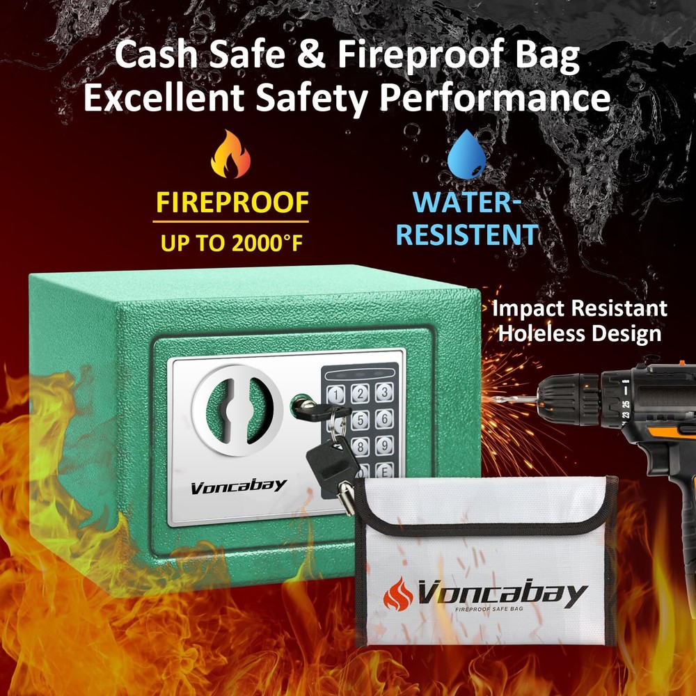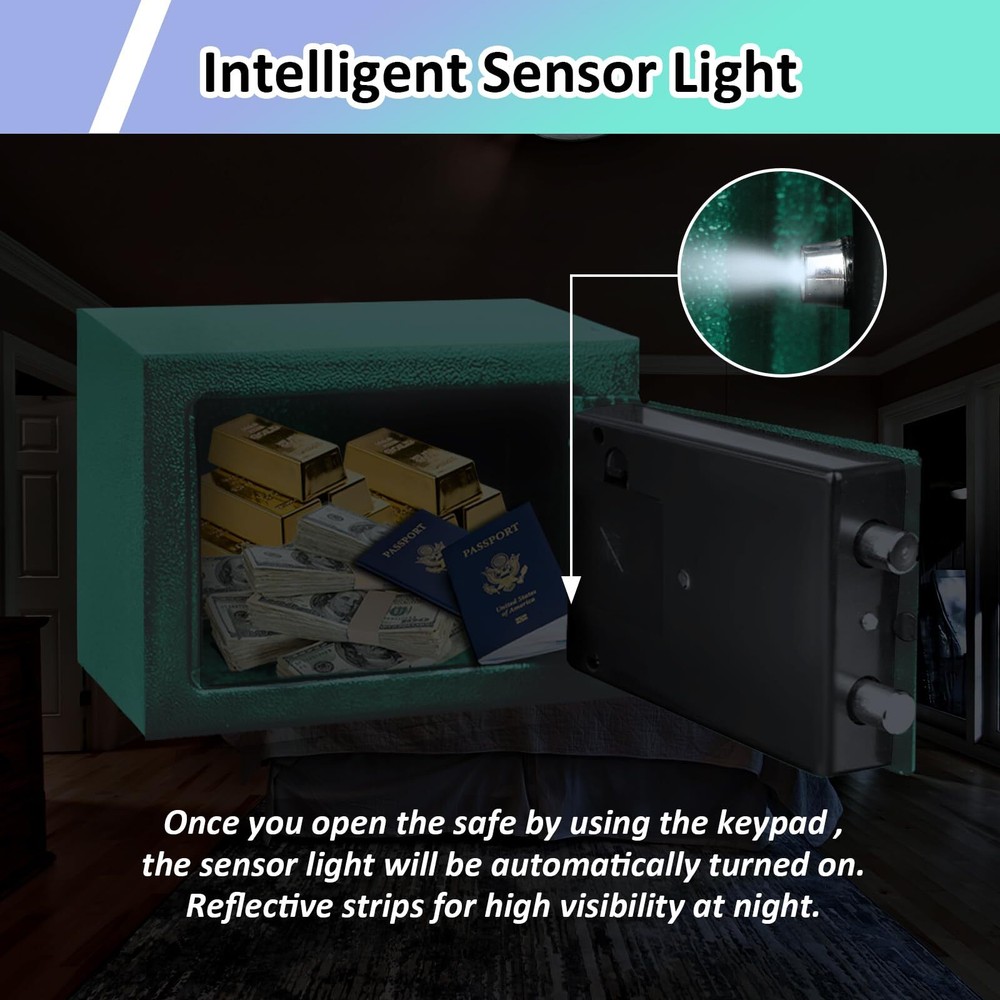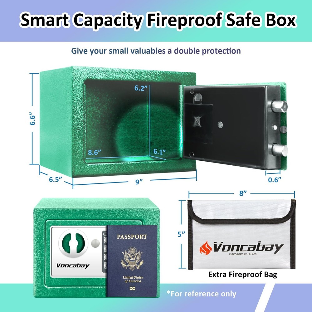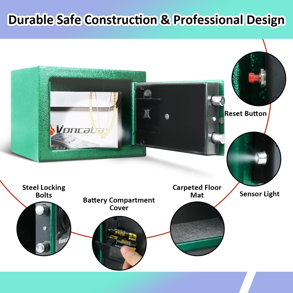 Money Safe Box for Home with Sensor Light & Fireproof Security Safe Box for Money Safe with Keys & Pass Code, Lock Box Fireproof Safe with Digital Keypad Green [Security Safe Box with Intelligent Sensor Light]: Small Safe Box for Home automatically turns on the light after you open the safety box by Using Keypad, soft light makes it easy for you to get the items you need without hurting your eyes and it will turn off after 30 seconds. Additionally, our numeric keypad of Security Safe Box will remind you whether the password is correct with an indicator light and remind you battery is about to run out by lighting up a red light. [Cash Safe Box & Fireproof Bag - Excellent Safety Performance]: Made of reinforced alloy steel, our Lock Box Fireproof Safe without holes has two enhanced steel bolts, pry-resistant concealed hinges and a tamper-proof doors, which provides physical protection against forced entry. It also comes with a Waterproof and Fireproof Document Bag which is perfect to protect your small valuables. The combination of Steel Safes and Fireproof Waterproof Bags can give your valuables a double protection. [Easy to Set Up]: Only 4 STEPS to set a password for the Fireproof Box. Step 1, Remove the Override Key Cover and use the Override Key to open the safe; Step 2, Remove battery compartment cover of lock safe box and install the 4 x "AA" batteries in the correct directions; Step 3, Press the reset button; Step 4, Enter the new password in 15 seconds and end with "E". Press "C" to clear entry if wrong digit is entered. Please keep override keys in a safe place outside the safe with keypad. [2 Ways to Unlock the Money Safe Box]: Small Money Safe has 2 unlock ways: 1) insert the Emergency Backup Keys into the mini safe and turn left, then turn entry knob clockwise to open the personal safe box; 2) use the Numeric Keyboard to enter the password followed by "E", then turn the knob clockwise to open. Our security box offers Security Lockout System: if an incorrect password is entered three times in a row, the digital keypad will begin a five-minute security lockout period. [Smart Capacity Fireproof Safe Box ]: Exterior: 9 x 6.6 x 6.5 inches; Interior: 8.6 x 6.2 x 6.1 inches; Thickness of the latches are 0.6 inch. With only 0.23 Cubic Feet, our Mini Hidden Safe Box can be used as a hotel safe, a closet safe, a wall safe, a floor safe and a fireproof cash box, which can be placed in wardrobes, drawers, and bedside tables. Please Pay Attention to the Size of the Safe Before Purchasing. Shipping We offer FREE shipping on all orders! We ship within Three business days of payment, usually sooner. We use a selection of shipping services such as UPS, FedEx, USPS etc. We only ship to the lower 48 states, no APO/FPO addresses or PO Boxes allowed. Local pickups and combined shipping options are not provided at this time. Return You can return a product for up to 30 days from the date you purchased it. Any product you return must be in the same condition you received it and in the original packaging. Please keep the receipt. Payment We accept payment by any of the following methods: PayPal Please pay as soon as possible after winning an auction, as that will allow us to post your item to you sooner! Feedback Customer satisfaction is very important to us. If you have any problem with your order, please contact us and we will do our best to make you satisfied. Contact Us If you have any queries, please contact us via ebay. We usually respond within 24 hours on weekdays. Please visit our eBay store to check out other items for sale! Thank you for shopping at our store.