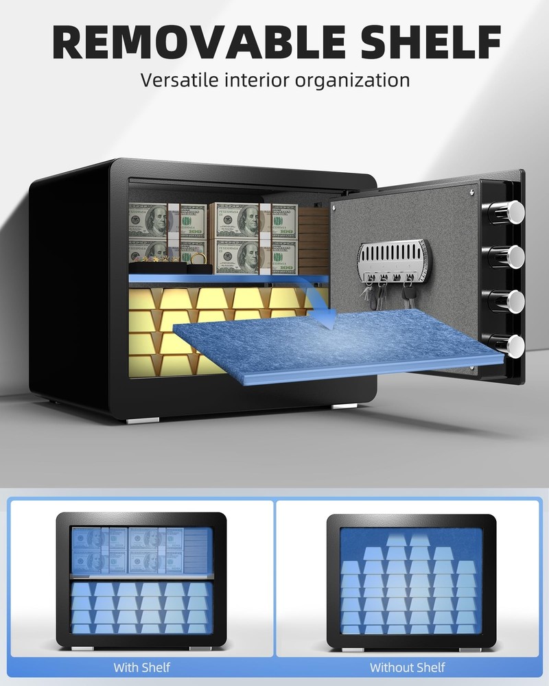 Safe Box, 1.4 Cubic Feet Home Safe with Fireproof Waterproof Bag, Security Safe Box for Money Cash Valuables, Digital Electronic Keypad, Dual Alarm System, Removable Shelf - D-35 UNMATCHED SECURITY PROTECTION - The safe box is crafted with cutting-edge one-piece bending and precision laser-cutting technology, pry-resistant door and 4 x 0.8inch live-locking bolts provide durable and reliable protection. Also, the advanced locking technology that resists both physical attacks and lock manipulation, our safe keeps your valuables secure. EXTRA FIREPROOF & WATERPROOF BAG - The fireproof & waterproof bag keeps all your irreplaceable documents, cash, and small valuables in one place, saving crucial time in emergency situations. Ideal for home, office or travel, the Fire Bag stands up against basic fire and water peril due to its fire resistant stitching and four-layer protection. DIGITAL LOCK WITH KEYPAD - This battery-powered digital locking system uses a programmable 1-8 digit code. Easy to unlock with either a passcode or a manual override key, offers seamless access when you need to. Our safe box locks you can trust. DUAL ALERT SYSTEM FOR PEACE OF MIND - With a dual alarm warning system, the home safe ensures your belongings are protected. Three incorrect password attempts or any forceful breach trigger a loud 70-decibel alarm, deterring intruders. VERSATILE INTERIOR ORGANIZATION - Our safe box provides ample space and customization with a removable shelf and built-in hooks for optimal organization. Plus, it features an integrated LED sensor light for effortless access to your belongings, even in the dark. We also enhances interior protection with a custom carpet interior to keep your important valuables protected from damage during storage. ELEGANT DESIGN LOCK PANEL - The home safe combined functionality and aesthetics with our patented panel design, ensuring your safe looks as good as it performs. Secure your world with safe. Shipping We offer FREE shipping on all orders! We ship within Three business days of payment, usually sooner. We use a selection of shipping services such as UPS, FedEx, USPS etc. We only ship to the lower 48 states, no APO/FPO addresses or PO Boxes allowed. Local pickups and combined shipping options are not provided at this time. Return You can return a product for up to 30 days from the date you purchased it. Any product you return must be in the same condition you received it and in the original packaging. Please keep the receipt. Payment We accept payment by any of the following methods: PayPal Please pay as soon as possible after winning an auction, as that will allow us to post your item to you sooner! Feedback Customer satisfaction is very important to us. If you have any problem with your order, please contact us and we will do our best to make you satisfied. Contact Us If you have any queries, please contact us via ebay. We usually respond within 24 hours on weekdays. Please visit our eBay store to check out other items for sale! Thank you for shopping at our store.