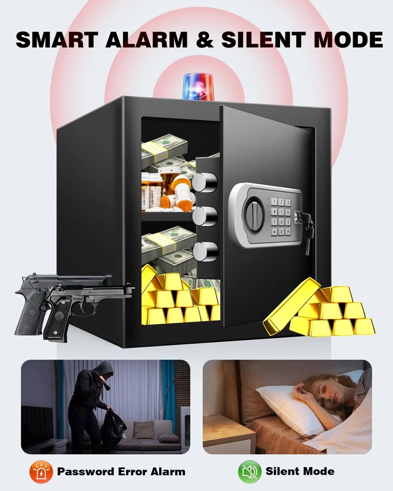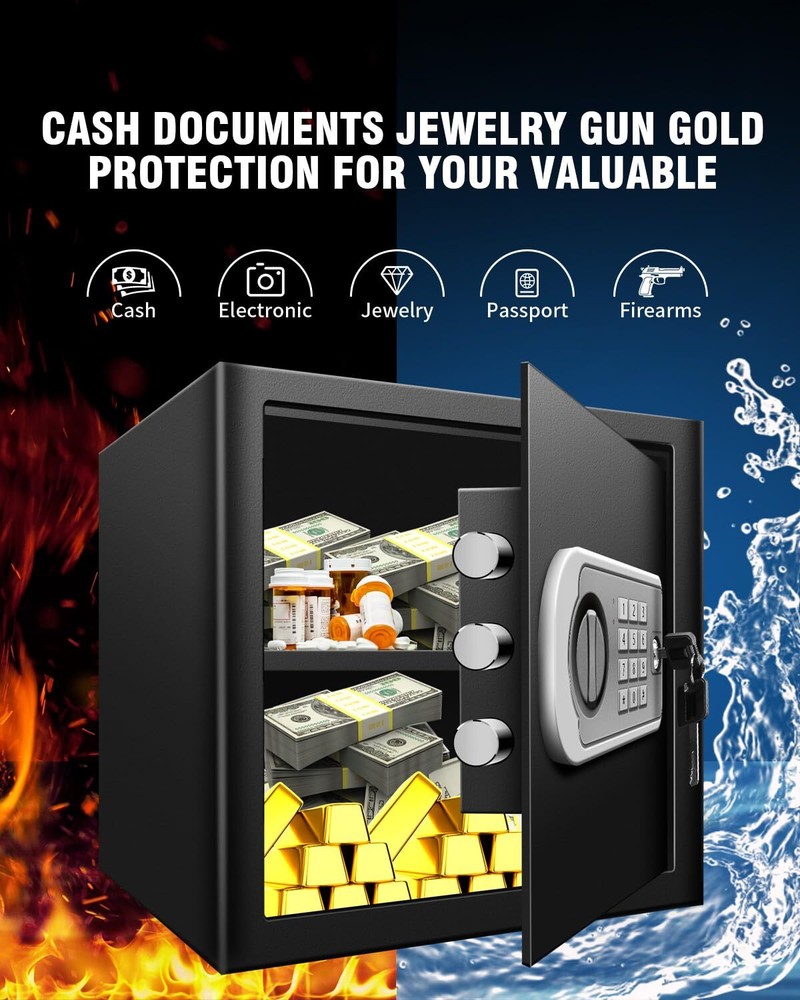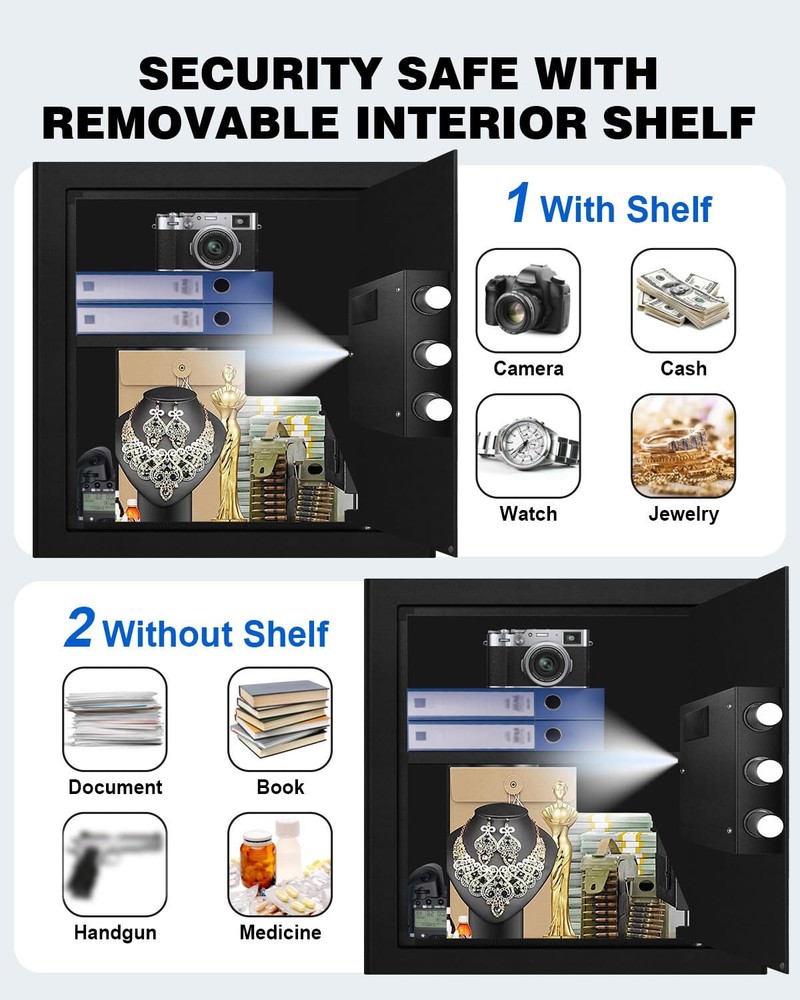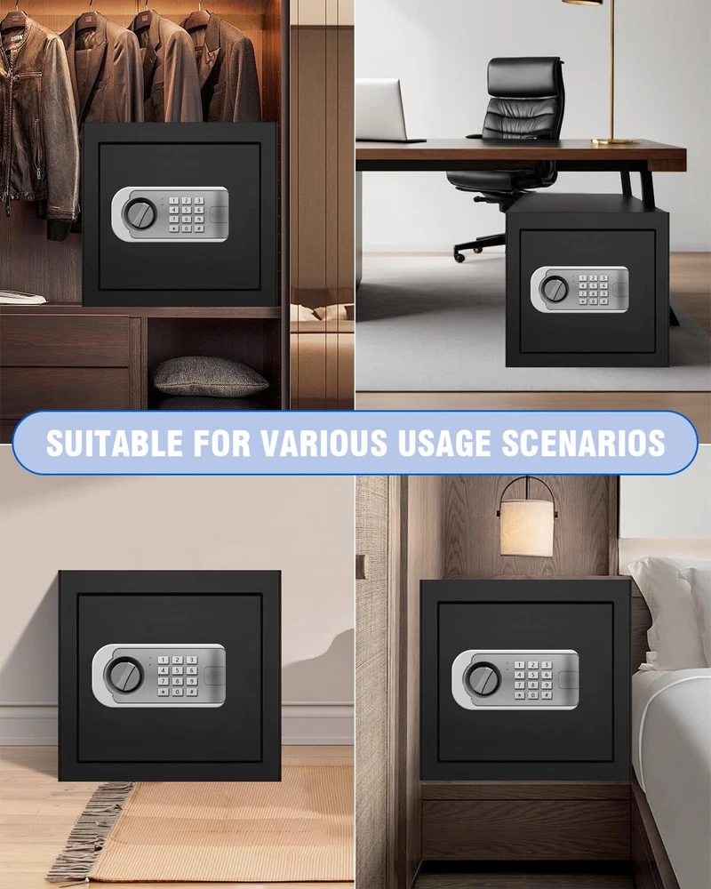 Safe Box Fireproof Waterproof, 1.6 Cu Ft Personal Safe with Digital Keypad, Safety Box for Home with Dual Alarm System for Money Cash Valuables Document, Keyboard Silent Mode, Black 【1.6 Cubic Safe Box】SIZE: 12.20* 11.81*14.57 inches.With its compact and spacious design, it comes with removable shelf, making it perfect for storing items around the home such as cash, medications, jewelry, sensitive documents, electronic storage drives, spare credit cards, and firearms. It can be easily placed in a closet, cabinet, shelf, drawer or nightstand as a hotel safe, closet safe, wall safe and dorm safe. Concealed and flexible (flexible and easy to hide), Ideal for home, office or travel. 【Smart LED Light & Keyboard Silent Mode 】①The interior LED light improves visibility so you can easily access your valuables in the dark. Also, the home safety box’s indicator light will remind you that the battery is about to run out by lighting up a red light. ②Optional silent mode, Press and hold *, then press 8 to freely turn on/off silent mode, protecting your family's sleep from being disturbed. 【3 Ways to Use】This safe box fireproof waterproof is designed with a combination lock digital keypad and a spare key, which is more flexible and convenient to use. One way is personal password code+ knob; the other way is emergency key + knob. When inserting the key into the keyhole, turn the emergency key counterclockwise, and then turn the knob clockwise to open the door. The design of the external battery box to prevent emergencies when the battery is exhausted and the key is not there. 【Anti-theft Alarm and Fixed Design】The home safes water and fireproof has a dual alarm system to prevent unauthorized entry. Entering the wrong combination three times in a row will activate the alarm system, and the fire proof safe for home documents lock will be locked and alarmed. It also has pre-drilled mounting holes and comes with expansion screws for mounting the safe to the wall, floor, or closet shelf to further prevent the risk of theft. 【Sturdy & High Security Performance】The fireproof safe is made of durable solid steel structure, 60mm thickened embedded door design enhances anti-pry ability, 30mm reinforced solid locking bolts effectively resist physical attacks, the advanced locking technology resists physical attacks and lock manipulation to ensure the safety of your valuables. This small home safe has been rigorously tested to prove its superior durability and material quality. Shipping We offer FREE shipping on all orders! We ship within Three business days of payment, usually sooner. We use a selection of shipping services such as UPS, FedEx, USPS etc. We only ship to the lower 48 states, no APO/FPO addresses or PO Boxes allowed. Local pickups and combined shipping options are not provided at this time. Return You can return a product for up to 30 days from the date you purchased it. Any product you return must be in the same condition you received it and in the original packaging. Please keep the receipt. Payment We accept payment by any of the following methods: PayPal Please pay as soon as possible after winning an auction, as that will allow us to post your item to you sooner! Feedback Customer satisfaction is very important to us. If you have any problem with your order, please contact us and we will do our best to make you satisfied. Contact Us If you have any queries, please contact us via ebay. We usually respond within 24 hours on weekdays. Please visit our eBay store to check out other items for sale! Thank you for shopping at our store.