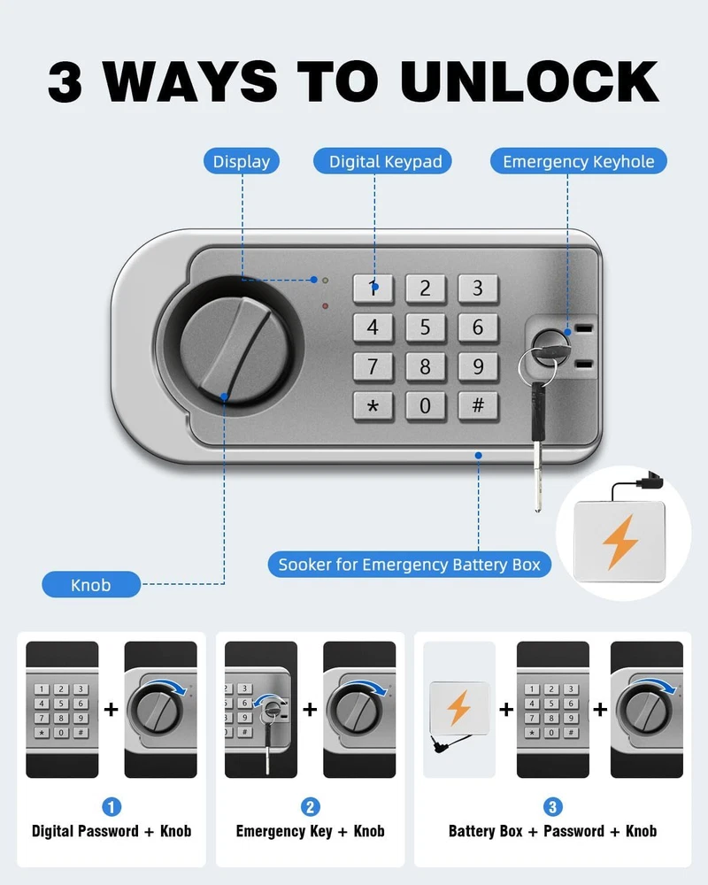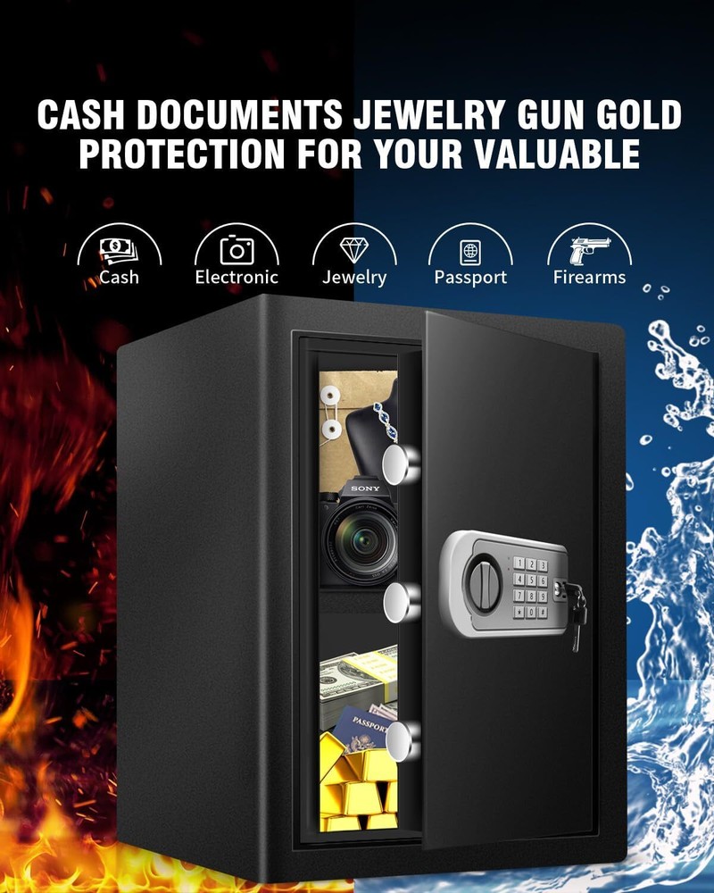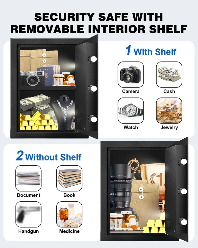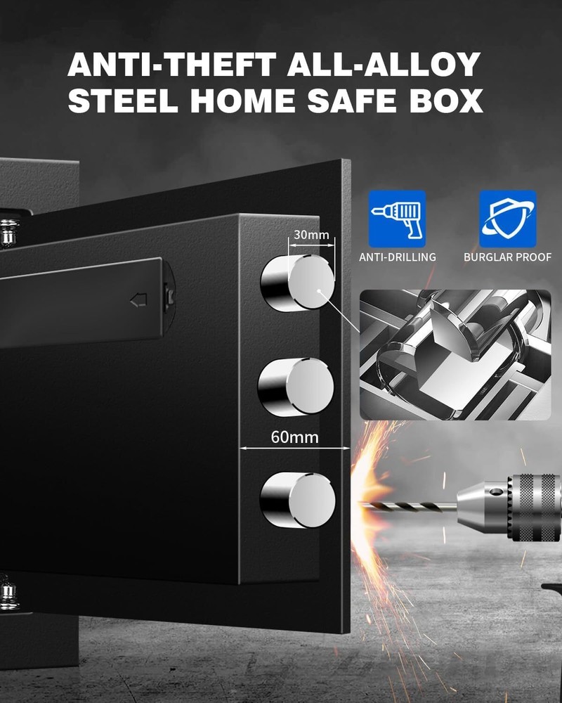 2.4 Cub Home Use Safe Box Fireproof Waterproof, Fire Proof Safe with Digital Keypad Sensor Light Key for Hotel Office Money Documents 【2.4 Cubic Safe Box】With its compact and spacious design, it comes with removable shelf, making it perfect for storing items around the home such as cash, medications, jewelry, sensitive documents, electronic storage drives, spare credit cards, and firearms. It can be easily placed in a closet, cabinet, shelf, drawer or nightstand as a hotel safe, closet safe, wall safe and dorm safe. Concealed and flexible (flexible and easy to hide), Ideal for home, office 【Smart LED Light & Keyboard Silent Mode 】①The interior LED light improves visibility so you can easily access your valuables in the dark. Also, the home safety box’s indicator light will remind you that the battery is about to run out by lighting up a red light. ②Optional silent mode, Press and hold *, then press 8 to freely turn on/off silent mode, protecting your family's sleep from being disturbed. 【3 Ways to Use】This safe box fireproof waterproof is designed with a combination lock digital keypad and a spare key, which is more flexible and convenient to use. One way is personal password code+ knob; the other way is emergency key + knob. When inserting the key into the keyhole, turn the emergency key counterclockwise, and then turn the knob clockwise to open the door. The design of the external battery box to prevent emergencies when the battery is exhausted and the key is not there 【Anti-theft Alarm and Fixed Design】The home safes water and fireproof has a dual alarm system to prevent unauthorized entry. Entering the wrong combination three times in a row will activate the alarm system, and the fire proof safe for home documents lock will be locked and alarmed. It also has pre-drilled mounting holes and comes with expansion screws for mounting the safe to the wall, floor, or closet shelf to further prevent the risk of theft. 【Sturdy & High Security Performance】The fireproof safe is made of durable solid steel structure, 60mm thickened embedded door design enhances anti-pry ability, 30mm reinforced solid locking bolts effectively resist physical attacks, the advanced locking technology resists physical attacks and lock manipulation to ensure the safety of your valuables. This small home safe has been rigorously tested to prove its superior durability and material quality Shipping We offer FREE shipping on all orders! We ship within Three business days of payment, usually sooner. We use a selection of shipping services such as UPS, FedEx, USPS etc. We only ship to the lower 48 states, no APO/FPO addresses or PO Boxes allowed. Local pickups and combined shipping options are not provided at this time. Return You can return a product for up to 30 days from the date you purchased it. Any product you return must be in the same condition you received it and in the original packaging. Please keep the receipt. Payment We accept payment by any of the following methods: PayPal Please pay as soon as possible after winning an auction, as that will allow us to post your item to you sooner! Feedback Customer satisfaction is very important to us. If you have any problem with your order, please contact us and we will do our best to make you satisfied. Contact Us If you have any queries, please contact us via ebay. We usually respond within 24 hours on weekdays. Please visit our eBay store to check out other items for sale! Thank you for shopping at our store.