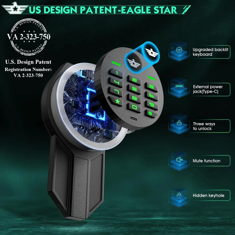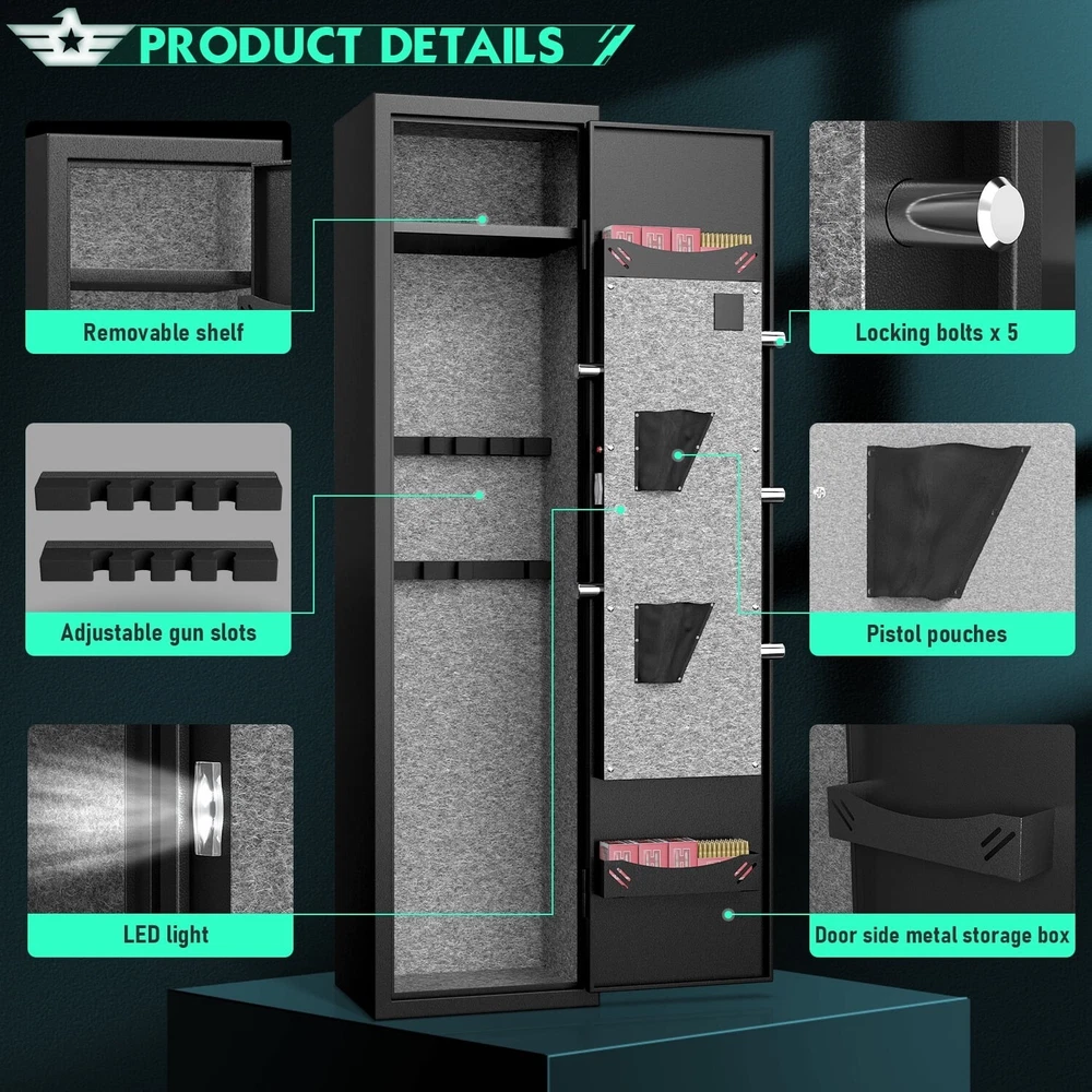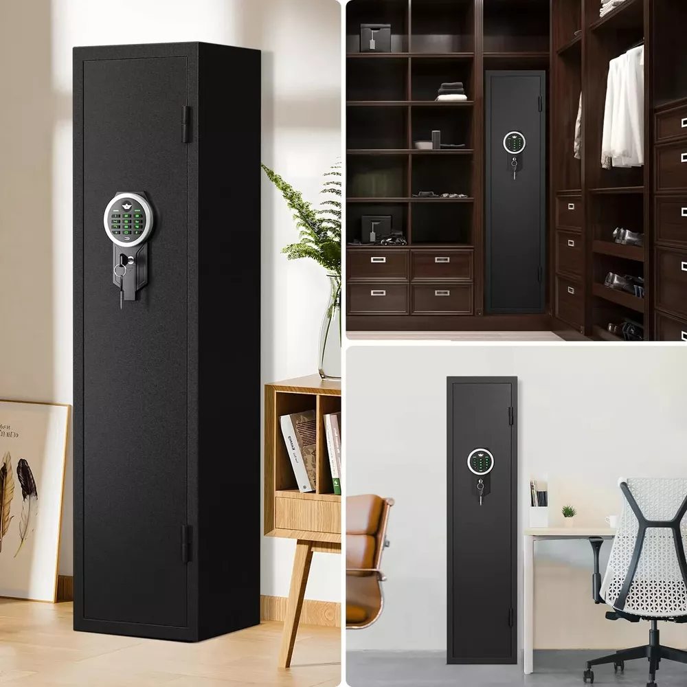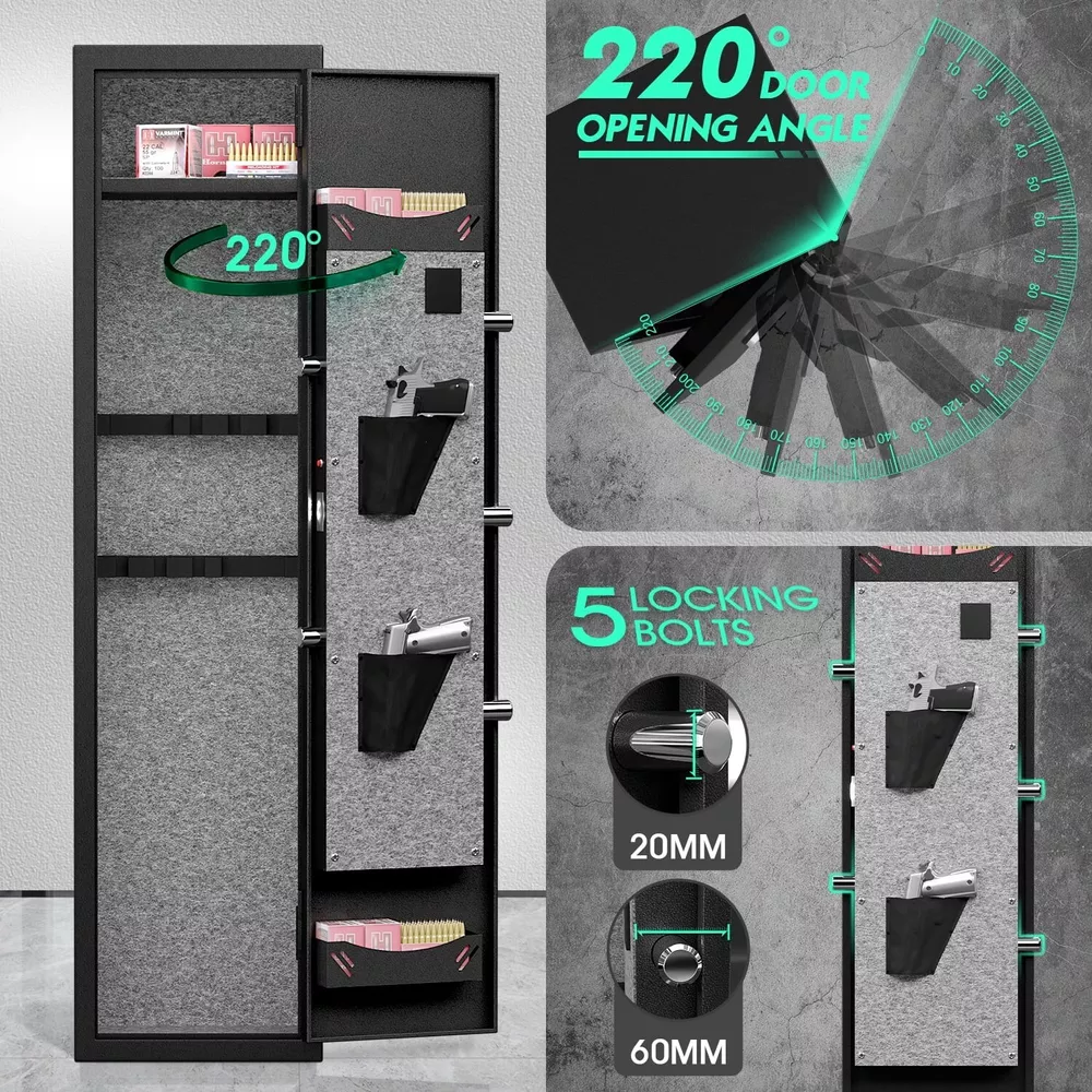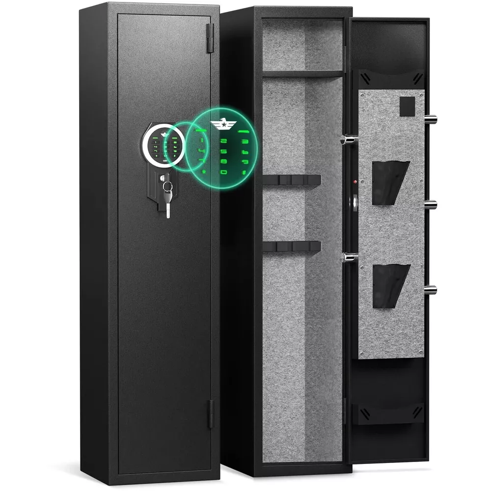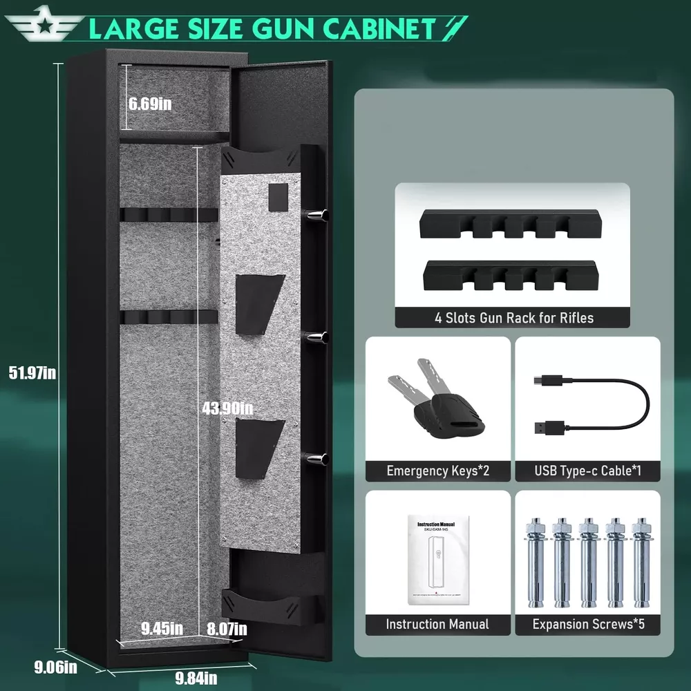 Fireproof Waterproof Gun Safe, Digital Quick Access - Brand New, Free Shipping About this item 【Quick Access Gun Safe for Shotguns】Developed and designed in the US, our gun safes feature 3D glowing digital buttons for faster unlocking which are zero errors, for quick access to firearms in an emergency. It can store 2 sets of digital passwords, and the code memory function ensures that your code will not be lost when the power is exhausted. Better protection for our property and privacy. 【Higher Level of Security Gun Safe Shotguns】The Kavey gun safe uses a total of 5 solid bolts in left and right. It made of low carbon alloy steel which is tamper-resistant and pry-proof. Unique anti-corrosion design to ensure long-term use. And the high-strength metal lock core ultimately prevents picking the lock. For added security you can bolt it to the ground, in closets or any other location, the holes are pre-drilled and expension screws are provided. 【Bigger and Deeper Shotgun Safe】Larger and deeper gun safe than similar products, can hold almost 3 long guns up to 51 inches long. The interior features a soft foam gun rack and carpeted floor to protect your gun. LED light provide lighting in the dark, allowing you to find your guns in the dark. External Dimensions: H51.97*D9.06*W9.84in. Internal dimensions: H50.59*D8.07*W9.45in. 【Anti-tampering Alarm System and Mute Function】 If the wrong password is entered 3 times in a row, the alarm will last for 30 seconds. Meanwhile, if the gun cabinet is moved violently, the vibration alarm will be triggered. The alarm sound up to 70 decibels, can be heard in every corner of your home. Unlike other safes, if you don't want the safe to make a sound, you can turn on the mute function. 【Adjustable Pistol Rack & More Storage Space】The gun safe has 2 gun racks. You can adjust the gun rack according to the length of the gun. 2 storage boxes and 2 pistol bags are added to the door for storing items such as pistols, cartridges and bullets. 220° Door opening angle make it faster and easier access to take the gun. 【Complete Accessories and 24/7 Customer Service】1 x 2-3 Gun Safe, 2 x Emergency Keys, 5 x Expansion Screws, 1 x Type-c Cable, 2 x Gun Racks, 1 x Instruction Manual. If there are any problems with the gun cabinet, please feel free to contact us, our experienced customer service team will respond within 24 hours and solve the problem in your way! If your key is lost and cannot open your safe, we will provide lifetime key matching service. Product details Kavey is dedicated to improve the safety technology. To provide more secure, more reliable products, we keep researching and developing on materials, safety technology. We only wish to present the best to customers, to protect your valuables. We are dedicated to providing the best quality, value and service to meet our customers’ needs for consumer products. Covered by Velvet: The long gun safe interior features a soft foam barrel holder and carpeted floor to protect your gun What's in the box? 1 x Gun Safe 2 x Spare Keys 5 x Expansion screws 1 x Emergency battery box 1 x Instruction Manual 【Quick Access Gun Safe for Shotguns】Developed and designed in the US, our gun safes feature 3D glowing digital buttons for faster unlocking which are zero errors, for quick access to firearms in an emergency. It can store 2 sets of digital passwords, and the code memory function ensures that your code will not be lost when the power is exhausted. Better protection for our property and privacy. 【Higher Level of Security Gun Safe Shotguns】The Kavey gun safe uses a total of 5 solid bolts in left and right. It made of low carbon alloy steel which is tamper-resistant and pry-proof. Unique anti-corrosion design to ensure long-term use. And the high-strength metal lock core ultimately prevents picking the lock. For added security you can bolt it to the ground, in closets or any other location, the holes are pre-drilled and expension screws are provided. 【Bigger and Deeper Shotgun Safe】Larger and deeper gun safe than similar products, can hold almost 3 long guns up to 51 inches long. The interior features a soft foam gun rack and carpeted floor to protect your gun. LED light provide lighting in the dark, allowing you to find your guns in the dark. External Dimensions: H51.97*D9.06*W9.84in. Internal dimensions: H50.59*D8.07*W9.45in. 【Anti-tampering Alarm System and Mute Function】 If the wrong password is entered 3 times in a row, the alarm will last for 30 seconds. Meanwhile, if the gun cabinet is moved violently, the vibration alarm will be triggered. The alarm sound up to 70 decibels, can be heard in every corner of your home. Unlike other safes, if you don't want the safe to make a sound, you can turn on the mute function. 【Adjustable Pistol Rack & More Storage Space】The gun safe has 2 gun racks. You can adjust the gun rack according to the length of the gun. 2 storage boxes and 2 pistol bags are added to the door for storing items such as pistols, cartridges and bullets. 220° Door opening angle make it faster and easier access to take the gun. 【Complete Accessories and 24/7 Customer Service】1 x 2-3 Gun Safe, 2 x Emergency Keys, 5 x Expansion Screws, 1 x Type-c Cable, 2 x Gun Racks, 1 x Instruction Manual. If there are any problems with the gun cabinet, please feel free to contact us, our experienced customer service team will respond within 24 hours and solve the problem in your way! If your key is lost and cannot open your safe, we will provide lifetime key matching service. Specifications Features Backlit Keypad, Removable Shelf, Gun Support Assembled Product Dimensions (L x W x H) 9.06 x 9.84 x 51.97 Inches