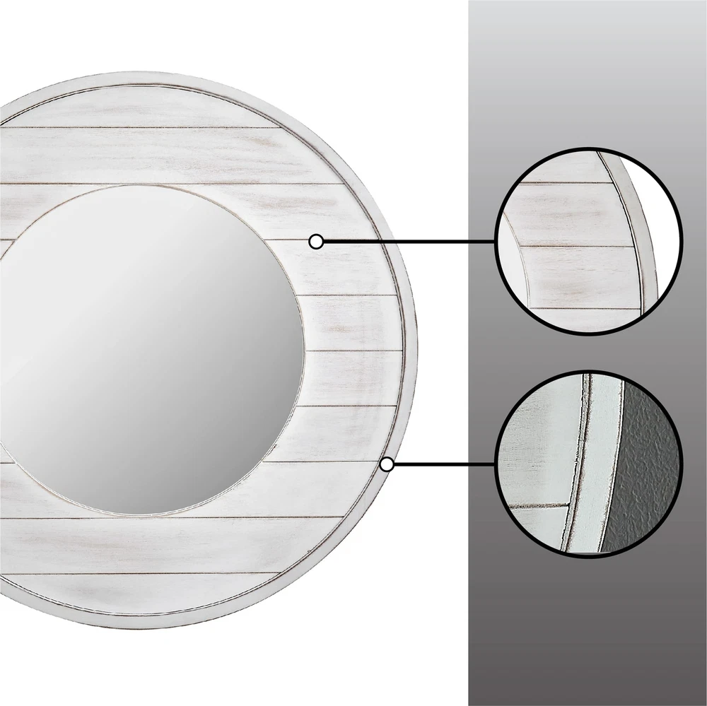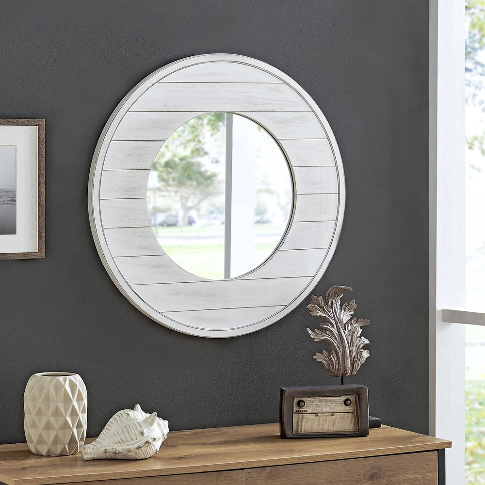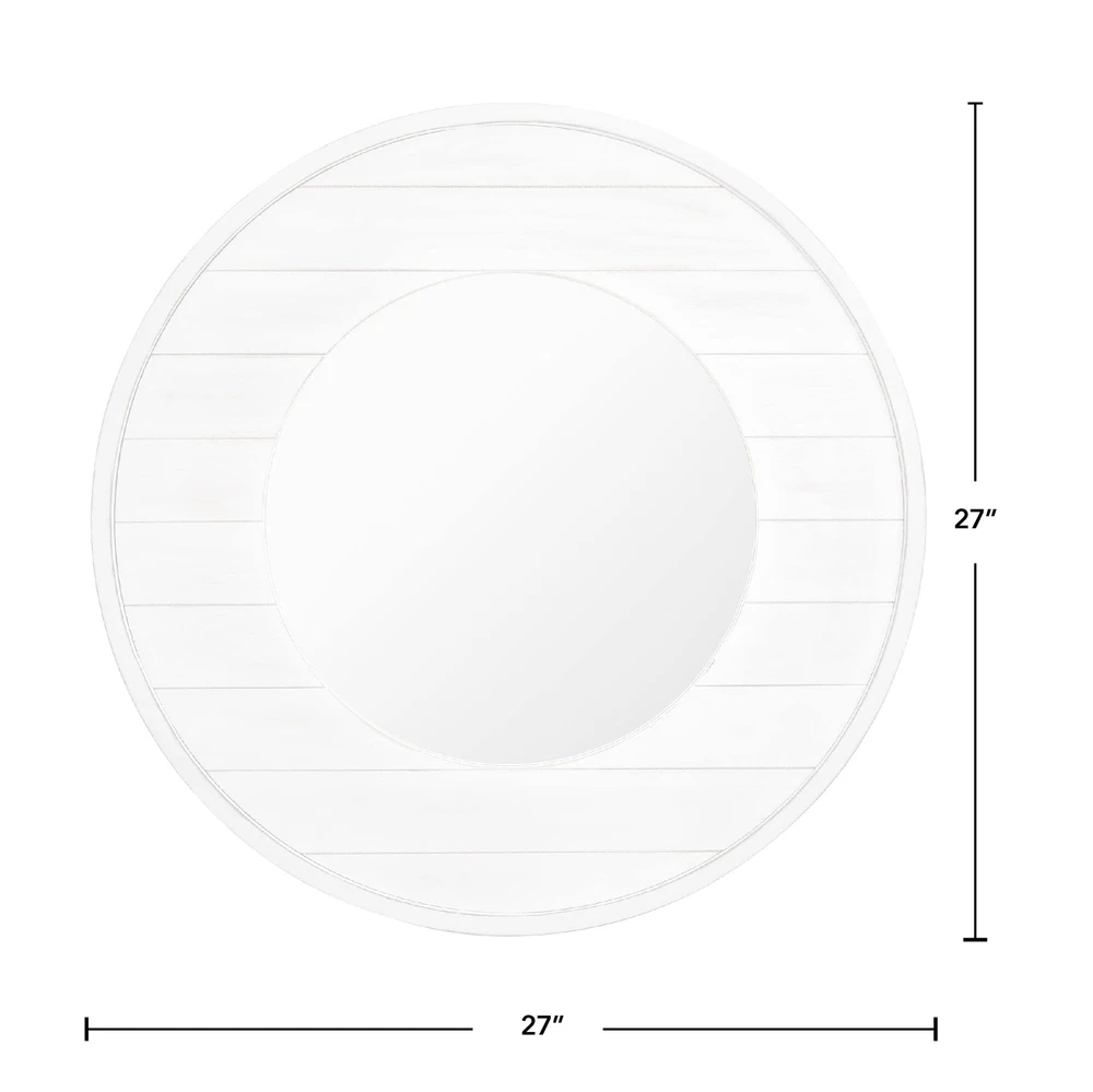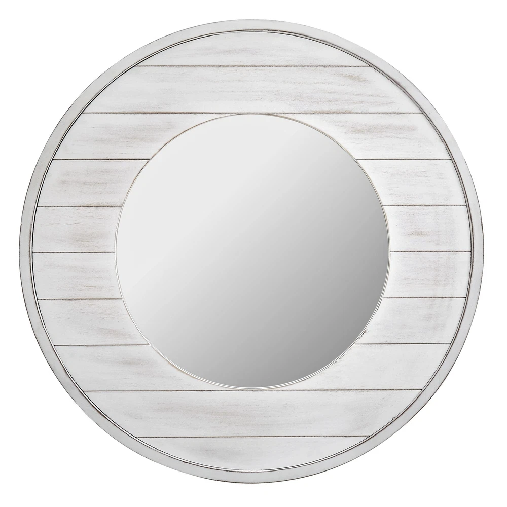 Nothing ties a room together better than a great mirror, and the one you choose to place in your home should reflect your personality and style. We hear you. Bring a cottage chic feel to any room with the Ellison Farmhouse Shiplap Mirror by FirsTime & Co. Whitewashed planks make up the 27” frame bordering the circular mirror. The natural feel of this reflective wall piece allows it to blend well with any décor, making it the perfect way to add shiplap style to any living space. Finding the right mirror to suit your style has never been easier thanks to our wide range of FirsTime & Co. home living products. SIZE MATTERS – Our FirsTime & Co. Ellison Farmhouse Shiplap Mirror has a 27" diameter and 0.5" depth, making it the perfect size for any living space. The size of the glass alone has a 16" diameter. IT’S IN THE DETAILS – This round mirror is crafted of solid wood with a whitewashed finish, complete with an aged plank design to give it a perfect coastal shiplap appeal. HANG IN THERE – This mirror is designed to be hung on the wall. Hanging hardware not included. THE PERFECT TOUCH – Our FirsTime & Co. Ellison Shiplap Mirror is a great accent piece to any coastal décor. FARMHOUSE STYLE - Whether moving into a new home or looking for a gift, make an accent statement in your entryway, kitchen, living room or bathroom with a stylish and decorative Farmhouse and Rustic piece from FirsTime & Co.