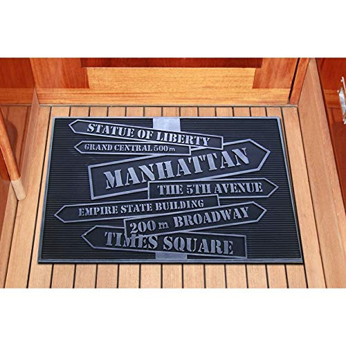 The First Impression New York Rubber Doormat lets everyone know that no matter where you live, your heart is in NYC. This black rubber mat features a ribbed background texture that traps dirt and debris. Arrows point to famous sites in New York. Dimensions: 30L x 18W x 0.7H in. Made from rubber. Black colored with street sign pattern. Helps to remove dirt and debris from shoes. Long-lasting and durable. Indoor or outdoor use.