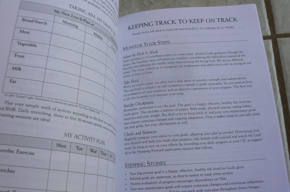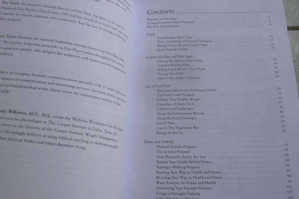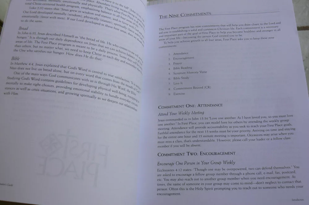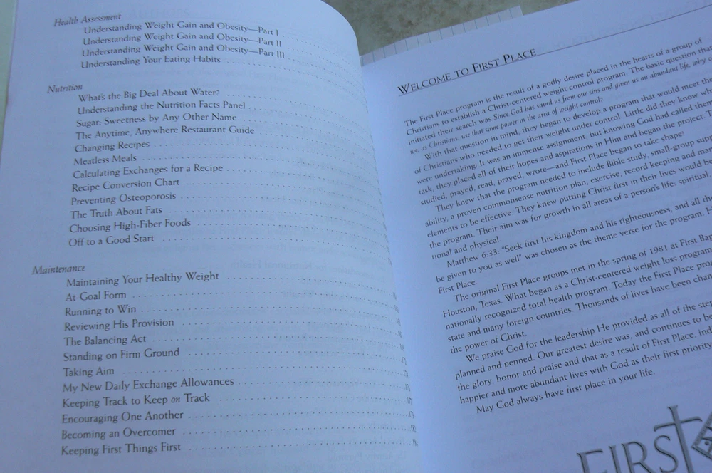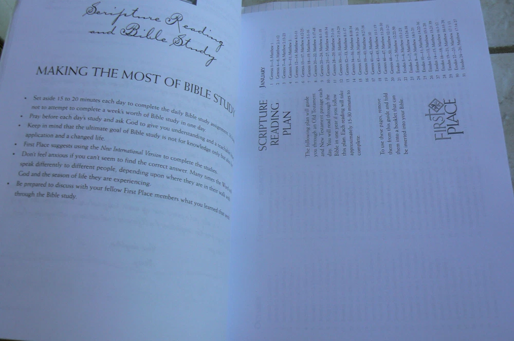This listing is for the 2001 MEMBER'S GUIDE for FIRST PLACE - The Bible-Based Weight-Loss Plan Christ-centered health program This 190-page softcover has four pages with writing on them in pen; on two other pages there are six numbers filled in some blanks. That's the only writing anywhere within the pages. You won't be disappointed! ~~~~~~~~ Please take a look at my other listings; I'm listing many school books (and others) and I'm happy to combine shipping whenever possible. Before you pay, put items in your cart, then "request total from seller". I will then weigh them together and send an invoice with a combined shipping price. All items coming from a smoke-free, pet-free home! Thanks so much for your time! . Before leaving your feedback, if for any reason you feel I did not deserve or earn 5 stars in each category, please let me have the opportunity to make it right. I want every transaction to be 5-star worthy! Thanks so much! :)