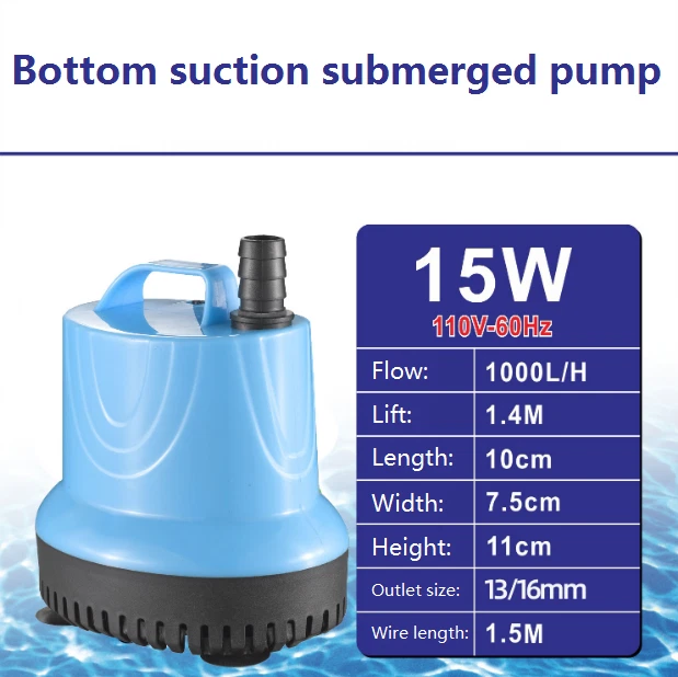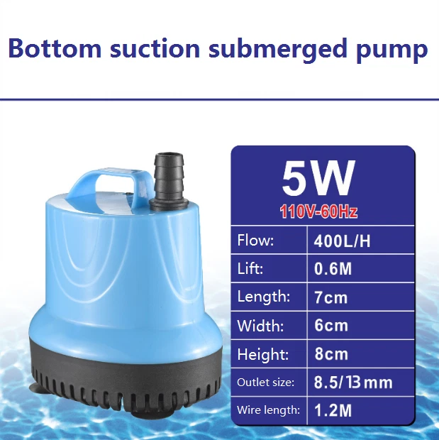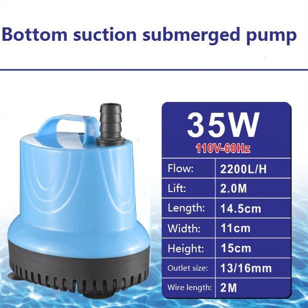 Bottom suction submerged pump Filter | add water | change water Silent design / strong suction / anti dry burning design / energy saving Scope of application: Aquarium, garden fountain, flowing water crafts, water-cooled air-conditioning fan, mechanical equipment cooling and other fields. Solve the problem of fish culture cleaning: Effectively clean up the fish feces at the bottom and solve the trouble of manual water change. Triple mute design: Internal rubber sealing, thickened cover protection, bottom Shockproof foot pad, silent work at night can make you sleep comfortably. Intelligent dry burning prevention: Intelligent temperature control chip, motor waterproof protection, high temperature automatic protection, sensitive to temperature and enable multiple protection. Product details: 1. Portable handle: Humanized design, streamlined handle, more convenient to use. 2. Detachable and replaceable water outlet: Suitable water pipes can be installed according to specific requirements. 3. Integrated suction cup: Strong suction cup, safe and stable, can be placed in any position in the fish tank without falling off. Quantity: 1pcs