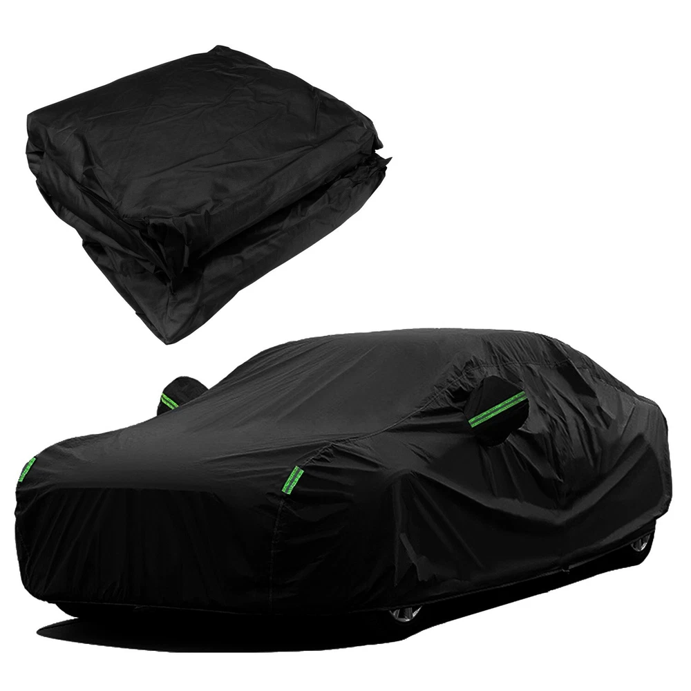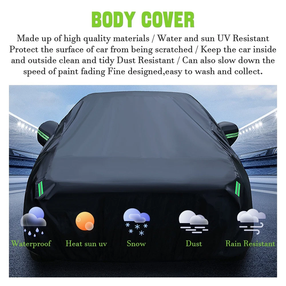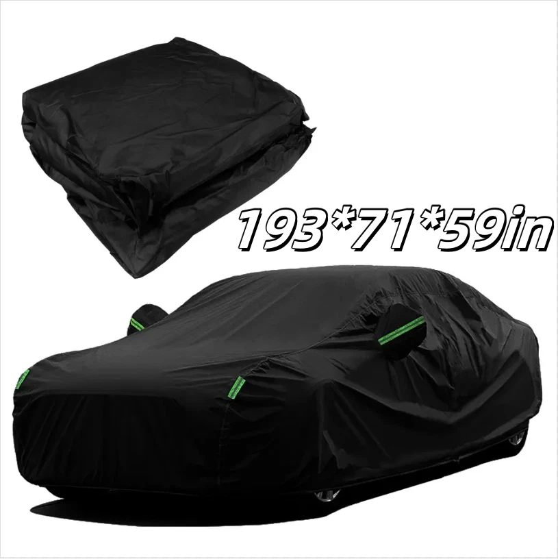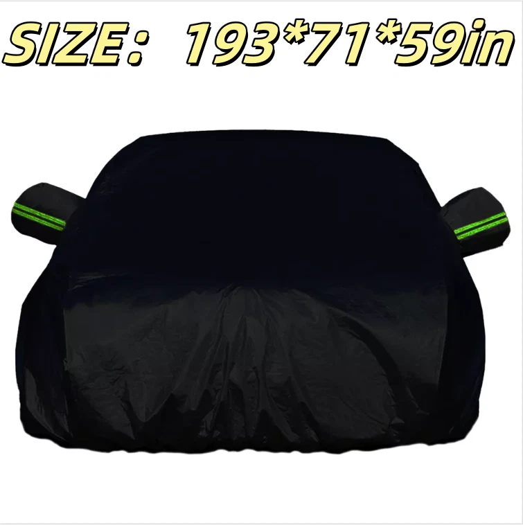 Feature: đăWeatherproof Full Protector Car Coveră Crafted from high density polyester taffeta with silver coating, the sturdy material is heat insulation, sun-proof, windproof, waterproof, hail-proof, snow-proof, dust-proof scratch resistant. đăReflective StripsăThe 6 fluorescent reflective strips will shine at night to remind others away from the car and help you find the car quickly.With ear design for covering car mirrors. đăWindproof & Anti-scratchăDouble thread sewing,not easy to tear off;Elastic band,Windproof is stronger. đăUniversal Car CoverăThis Car Cover size is 193" L X 71" W X 59" H,. please actually measure your car size before purchasing. đăEasy InstallationăEasy to put on and off, adjustable straps with durable buckle at the bottom to protect your car cover in heavy wind from blowing off. Specifications: Type: Full Car Cover Size: 193*71*59" Color: Black Material: 190T Polyester Taffeta Note: In Different Years, The Length Of The Car Is Different. Please Choose The Cover According To Your Car Length. Package include: 1 * Car Cover 1 * Storage Bag