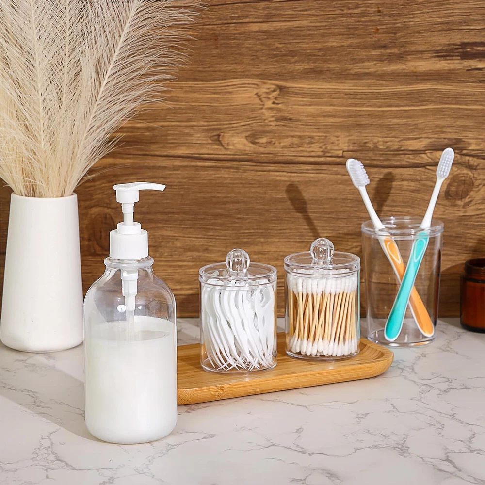 Fixwal 4-Piece Bathroom Soap Dispenser Set, Dispenser, Toothbrush Clear Product Details Number of Pieces: 4 Finish Type: Plastic Manufacturer: Momok Package Dimensions: 8.11 x 6.02 x 3.27 inches Item Weight: 13.1 ounces Country of Origin: China Finish types: Plastic Batteries required: No Material: Plastic Color: Clear Brand: Fixwal Style: Clear Included Components: Dispenser Plastic Clear Bathroom Accessory Set: The set contains 2pcs Qtip apothecary jars with clear lids, 1pcs 16oz soap dispenser, 1pcs toothbrush holder. 12pcs labels are send for free. Sustained and Safe: Made with BPA-free plastic our set is both sturdy and safe for everyday use. Keep your items dry and free from moisture, even in the bathroom. Clear Drip-Free Soap Dispenser: Our soap dispenser features a plastic pump that's easy to press and won't leak or rust. It's perfect for hand soap, dish soap, lotion, and more. Plus, it's reusable and refillable. Dust-Proof: Our bathroom storage jars come with a dust-proof plastic lid to keep your Qtips and cotton balls clean and dry. They're also great for storing other small items like jewelry, makeup, and office supplies. Organize Your Space: Keep your bathroom essentials in order with our 4pcs plastic clear bathroom accessories set, create a beautiful, rustic look that's perfect for farmhouse, boho, and western style decor.