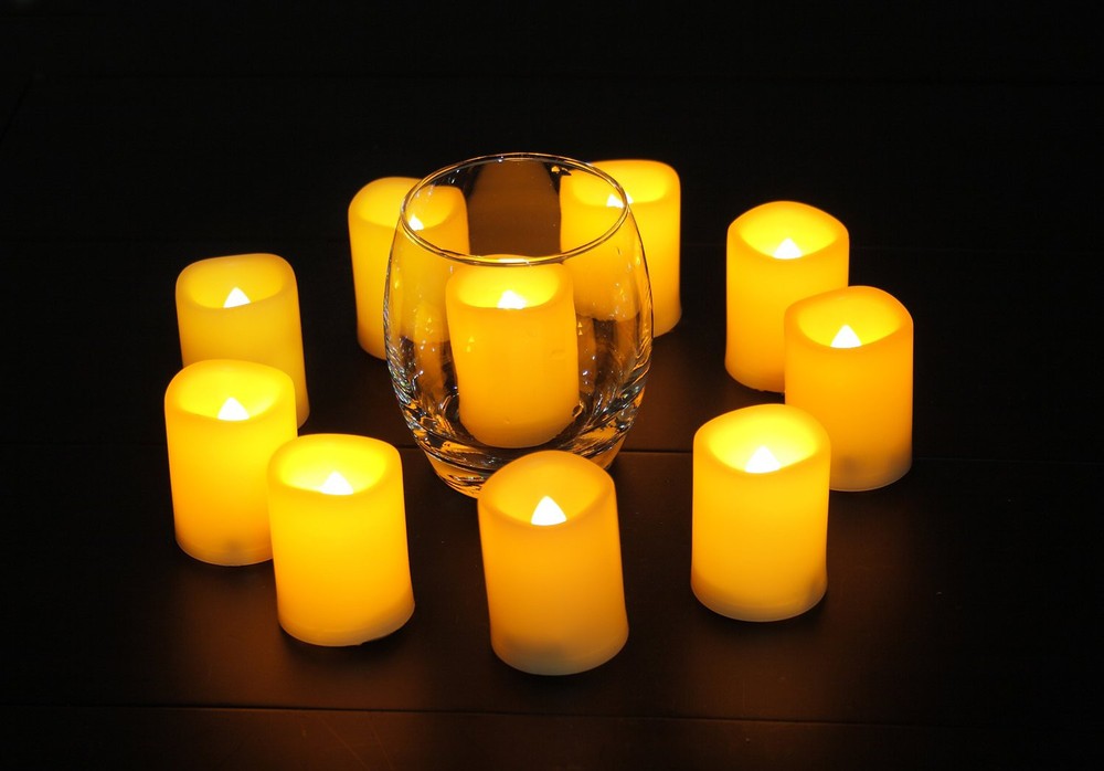 Decorating your world. Decorative LED votive candles and tea lights are ideal for home, kitchen, table, garden, kitchen, yard, holiday, seasonal, event, festival, winter, party, wedding, Valentine’s Day, Easter, Mother’s Day decorations. Battery powered flameless LED candle lights are your first choice of home decor. For example, you can use these electric candles to decorate your dining table on Thanksgiving or Christmas party on Xmas Day. Warm and romantic ambience. Flickering battery operated LED votive candles with warm white lights create a warm, peace and romantic atmosphere. In addition, a set of flameless electrical candles is a great gift choice in holiday season and parties, for example, these realistic battery candles with flicker are usually used as Thanksgiving, Christmas or New Year gifts or wedding party favors. Long lasting battery candles. 120+ glowing hours on one CR2032 button cell is among the longest battery life in the market. With the energy saving technology, the LED tealight /votive candles give off bright light on minimum battery consumption. No real wax votives and tea lights have such a long “burning” time. Realistic look and flicker. These top quality battery votive candles / tea lights are made of flickering LED bulb and plastic with real wax appearance. The small resin candles flicker like real candles and give off soft glowing light. Safe and eco-friendly. No risk of fire, no fume and no CO2 emissions. Battery powered LED candle lights are safe to use with, especially when you have kids, seniors and pets at home.