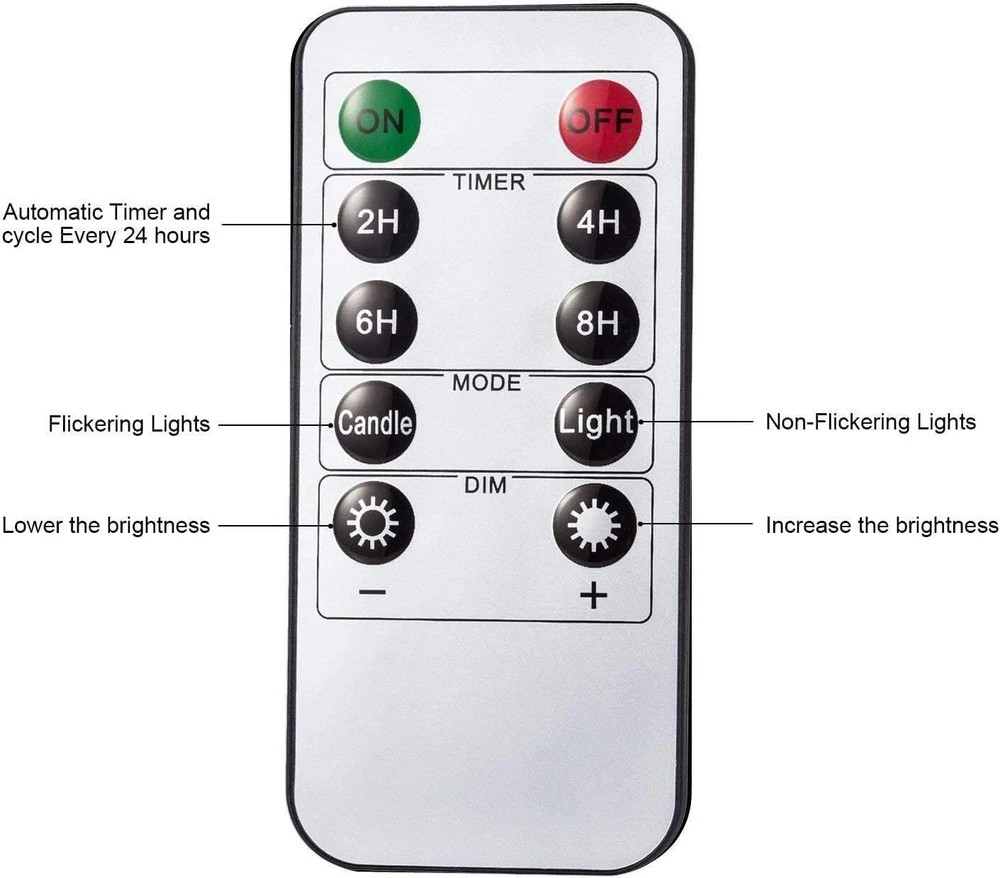 LED tea light with remote control Features: 1.Safe for usage in any setting or occasion, there is no flame or smoke. 2.The Tea light Candles is designed to flicker in a realistic way so that one can feel the atmosphere of an actual candle flame without any hazard or hassles. 3.These electronic tea lights can also be given away as gifts or party favors. 4.Very easy to use, these led tealights can be turned on and off by the flick of a switch. Specification: 1.Material: LED+PP. 2.Size: Diameter 3.7 cm / 1.45 inch + Height 3.6 cm/1.42 inch. 3.Battery: CR 2032 button cell. 4.Battery life: 180+hours. 5.Light color: warm white Package include: 12 X battery tea lights + remote control+ 50PCS Petals. Q&A: Q1: Does it come with a remote control? A: Yes, it is with a remote control, ON/OFF switch on the bottom. You can use the ON/OFF switch and remote control. Q2: Does it with timer function? A: Yes, it is with 2H,4H,6H,8H timer setting. Q3: Is it rechargeable? A: No, it is not rechargeable. It is with 240mAh high-capacity CR2032 batteries, if the battery runs out, you can replace the old one with a new CR2032 battery. Q4: Would these fit in votive candle holders? A: Yes! The base is exactly the same size as a votive candle. Attention: It is best to use "OFF" to turn off the led tea lights when you are not using it for a long time, rather than using a remote control to turn off the led tea lights. Because in the "ON" state, the tea lights still needs to use flow, and if you want to use it for a longer time, try to use the "OFF" state when not in use 💖Remote Control & Timer Function - Allows you to display candles in hard to reach places. You can choose between 2/4/6/8 hour timers as well as static blinking light options and brightness levels. The timer loops every 24 hours 💖Long Battery Life -These remote control candles feature 240mAh high-capacity CR2032 batteries, The led tea lights can last over 100 hours in non stop using ,it is longer than most of other brand tealight with remote in the market ,big capacity battery means saving your money 💖Create a Cozy Ambiance: Our warm white LED tea lights provide the perfect touch of mood lighting for any occasion. Use them in votive holders, glass cups, or on their own to set the scene for a romantic dinner, a festive party, or just a quiet night at home. 💖Flameless and Safe - Lifelike look while unscented, no drips, no smoke, no hazard, our candles safely go where traditional flame candles can’t, perfect for your home with kids and pets. 💖Widely used - Battery candles with remote and timer Ideal for home decor, wedding centerpieces, parties, Valentine's Day, Easter, Halloween, and Christmas. Undoubtedly they will add to the fun and goodness of any occasion, they are the perfect combination of convenience and durability.