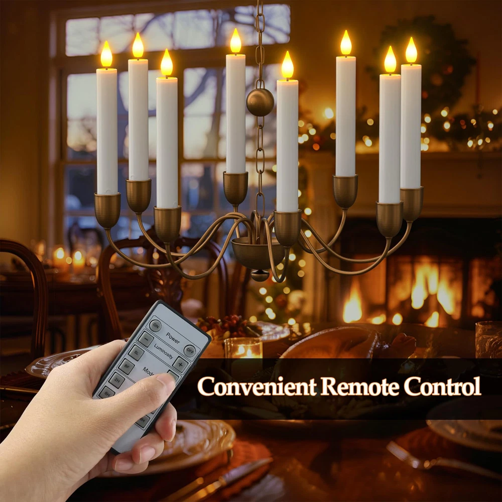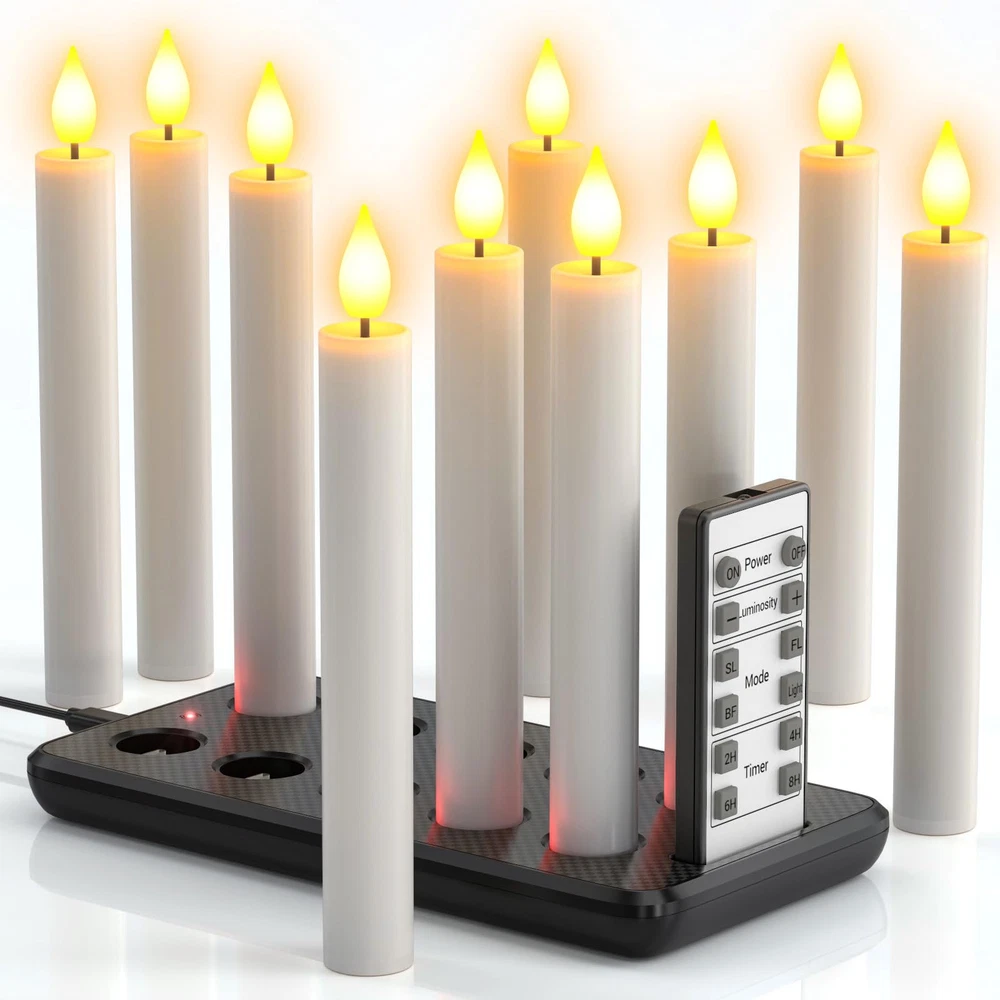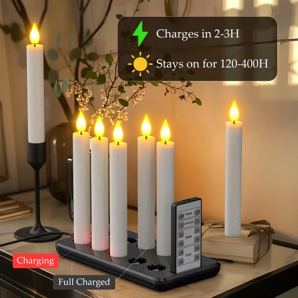 No Batteries or Future Expense Required - Rechargeable function eliminates the need for you to purchase additional batteries. Ideal for everyday home use as well as for wedding table decor. Good choice as Thanksgiving/Christmas gifts, show your best wishes for family & friends. with Convenient Charging Station - Simply laying your rechargeable flameless taper candles on the charging station. Fully charged in 2 hours, provides more than 200 hours of warm candlelight under the medium brightness, or longer if you dim the light via the remote! More than 20,000 hours of lifespan, durable to use! Fits Most Candle Sticks Holder Decor -【Candle Size: Height 6.7" x Diameter 0.78", makes it match with most candelabra (it can also stand alone).】Set them into your Halloween taper candle holders or placed them on the Thanksgiving centerpieces for tables or use them as Christmas window candles to to create festive atmosphere. Flameless Candles with Remote Control - Turn these taper candles ON via the bottom switch first, then you can adjust the light effect, flicker frequency, brightness with the remote - which is great if you put them up high or hang them on a chandelier/bookshelf for Halloween/Christmas Themed party. And you can also set a cycle timer for 2/4/6/8 hours. Versatile Decorative Rechargeable Candles - Elevate any space with the warm and enchanting glow of these rechargeable reusable taper candles. Classic white color shows the real taper candle appearance. Updated flickering effect as natural as breathing. Perfect for adorning homes, fireplace, tables, parties, weddings, bedrooms, and various events throughout the year. Flameless LED Taper Candles Set -【You Will Get: 10pcs Flameless Candles with Remote + 1*Charging Station + 1*USB Charging Cable. Designed box is nice as a gift.】Our flameless candles have been tested before sale. If any quality problems, please feel free to get in touch with our store customer service and we will offer you a satisfactory solution within 24 hours. Note: Please fully charge the battery for the first time. For each charge after that, deplete the battery completely before recharging to extend its lifespan.