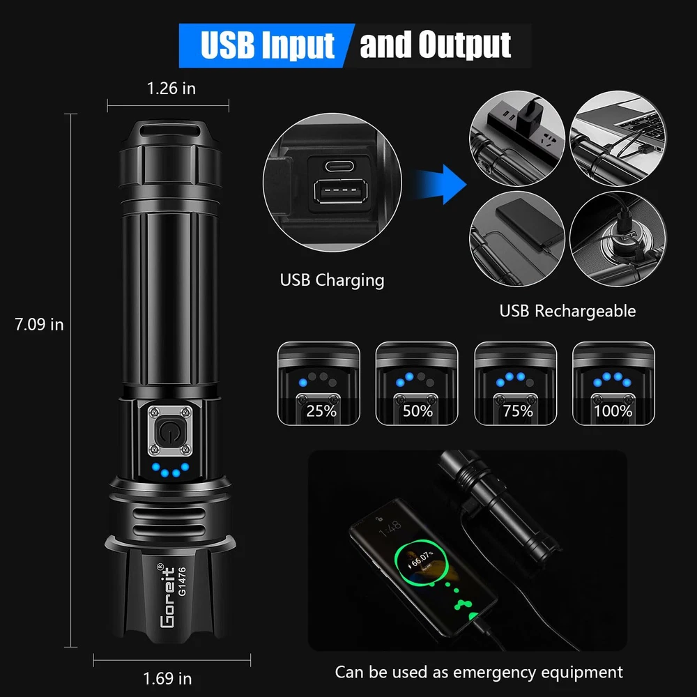 【990,000 LUMEN LED FLASHLIGHT】: flashlights high lumens utilizes upgraded XHP70.2 LED, which is stable and super bright and provides an incredibly powerful lighting, 10 times brighter than other normal led flashlights. A 120 square meter room can be illuminated without any problems, you can also focus on objects up to 1640FT away. This flashlights high lumens rechargeable is an ideal gift for mate, family, friends,colleagues, etc. 【USB RECHARGEABLE FLASHLIGHT & LONG WORKING TIME & POWER INDICATOR】: This rechargeable flashlight has been completely improved to shorten the charging time and extend the service life, which can provide up to 12 hours (Low mode) of powerful, non-diminishing brightness. Built-in USB charging interface, flash light can be charged through socket and laptop, convenient for indoor and outdoor charging. The LED display shows the power level exactly(25%, 50%, 75%, 100%). 【WATER RESISTANT & HEAVY DUTY FLASHLIGHT】: This IP67 waterproof flashlight is developed for rough handling and can withstand a fall of 5m or be temporarily submerged under water. This bright flashlight can even be frozen, run over by a truck, and it still works! Suitable for use in rain, snow, or emergency situations. The high powered flashlight made of aerospace grade aluminum can protect the convex lens from damage, and in emergencies it can also be used for Self-protection. 【ADJUSTABLE FOCUS & 5 LIGHT MODES】: This handheld flashlights has 5 lighting modes: High-Medium-Low-Strobe-SOS. You can turn off the rechargeable flashlights by long pressing the buttons for 3s in any mode. Depending on your needs, you can stretch the head of the flashlight to adjust the focus, freely choose the spotlight for remote viewing and the floodlight for large-area lighting. It is ideal for camping, hiking, climing, running, night walking, emergencies or the general household use. 【EXCEPTIONAL VALUE & BUY WITH CONFIDENCE】: Package contents: 1x super bright flashlight rechargeable with charging cable, 3x AAA Alkaline battery, 1x flashlight holster, 1x gift box and user manual. We have carefully checked all items before shipping and make sure the product is working properly, if you have any questions please contact our great customer service for a best solution within 24 hours.