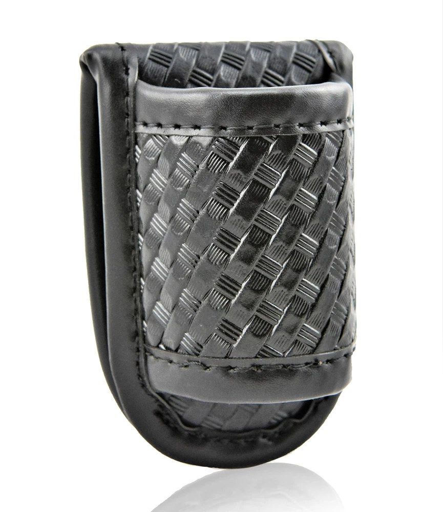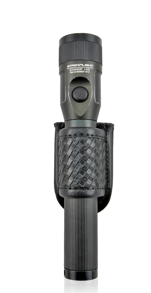 Flashlight Holder- Basketweave Duty Belt Flashlight Holster Fits both 2" (50mm) and 2.25"(58mm) duty belts. Holster accommodates most 1 inch diameter (standard size) flashlights, and all flashlight lengths. Opening for flashlight is 2.5 cm wide by 4 cm long as measured from the interior. Designed to provide a secure fit and will stretch slightly to accommodate most flashlights. Made with high-quality synthetic leather material and workmanship for heavy duty use, protection, and versatility. High-density foam core center 4-part laminate. Outer shell is fade and scratch resistant.