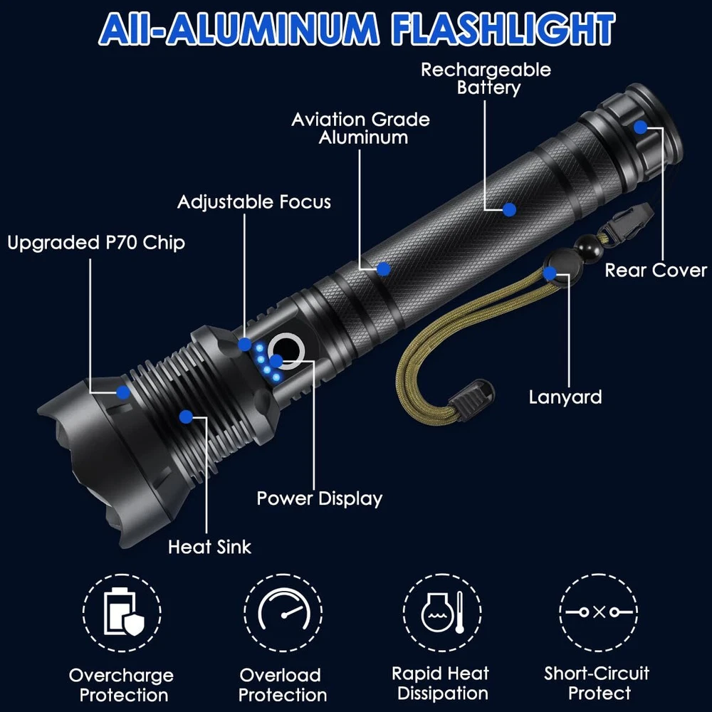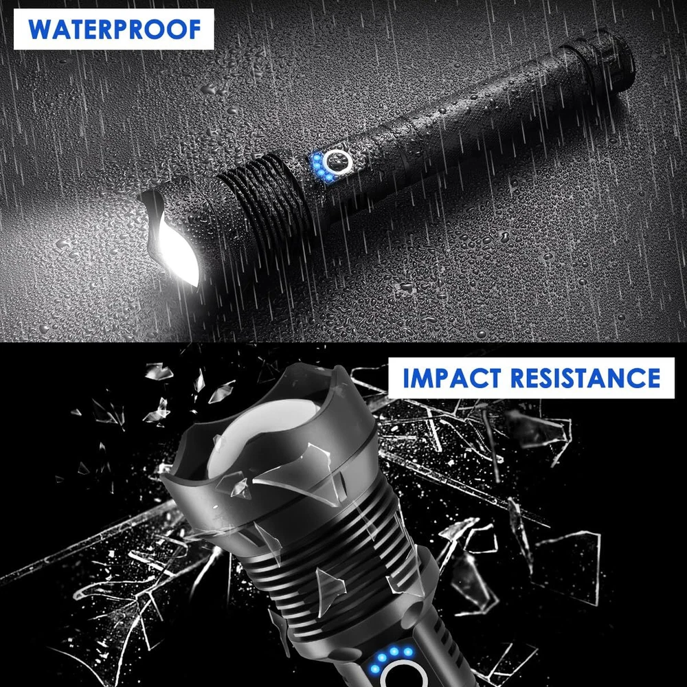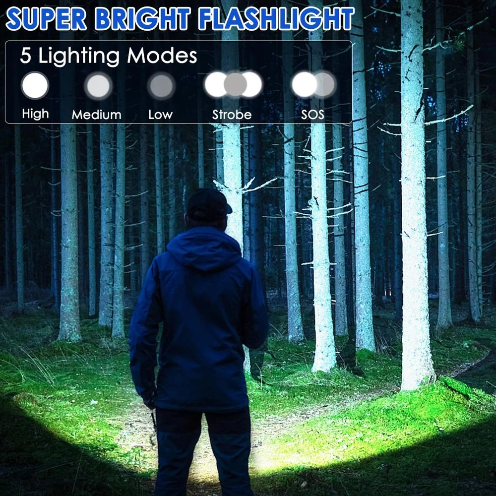 Flashlights High Lumen: The rechargeable flashlight is equipped with an upgraded LED chip which can emit a super bright beam, and the illuminates a length of up to 2,000ft distance and Illuminates an area of up to 1500ft. whether it's for home, camping, hiking or emergency, a super bright flashlight is indispensable for you. 5 Lighting Modes & Adjustable Focus: Multifunctional tactical flashlight has 5 main modes: high/medium/low/strobe/SOS. Adjustable Tactical Flashlight allows you to change the size of the beam by switching the focal length and freely switch between far and near light. Rechargeable & Power Display: Large rechargeable flashlight is powered by two high-capacity rechargeable batteries, which can provide up to 6-16h of illumination. The tactical flashlight also comes with a power display function, easily see power level (25%/50%/75%/100%), you can know the battery life at any time. High-Quality Material: Tactical flashlight is made of fine aluminum with good heat dissipation and impact resistance, the sealed design of the tactical flashlight makes it have good waterproof performance, and can be used in rain, snow and other inclement weather, with head cusp design, tactical flashlight can be used as safety hammer. Support Service: We have One-Year product replacement policy for any led flashlight quality problems. Just click “Get Help With Order”under your order ID, our support team will solve your problems within 24 hours. Comes with a beautiful colourful box packaging, making it the wonderful choice for your partner, family and friends.