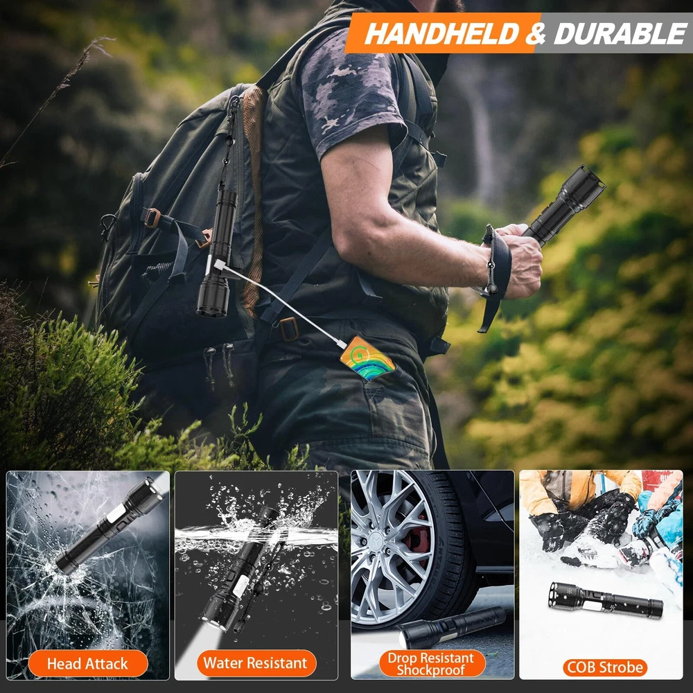 Flashlights High Lumens Rechargeable- 100,000LM Super Bright LED Tactical Magnetic Flashlight,Powerful Flash Light with 5 Modes for Emergency,Camping 【SUPER BRIGHT & LONG RANGE】This high lumens tactical flashlight is equipped with an innovative longbeam LED, more concentrated and focused beam compared to traditional rechargeable LED flashlight, brighter than the headlight of car. The max brightness is up to 100000 lumens, irradiation distance is up to 3280ft(1500m), and the service life is up to 90,000 hours. 【MAGNETIC FLASHLIGHT & INVINCIBLE DUR-ABLE】Bulit-in stong magnetic base,make your hands free. magnetic LED flashlight high lumens is made of military grade aluminum alloy, which has the functions of waterproof, dur-able, efficient heat dissipation, anti-drop. High powered work flashlights can be used for hunting, camping, caving, fishling, biking, night hiking, search and rescue. 【TYPE-C FAST CHARGE & POWER BANK】Fast charge in just 3 hours with any USB port. You can easily know how much battery left by this high lumens rechargeable flashlight power display. High-performance rechargeable flashlight can be used as a backup mobile power source for your phone and other devices, giving you peace of mind even if your phone is running out of power. 【8 MODES & TELESCOPIC ZOOM】 This Rechargeable magnetic led flashlights have 8 lighting modes: High /Low / Strobe / SOS (emergency)/COB High/COB Low/COB Red light/COB Red strobe light. This high lumen tactical flashlight adjust the diameter of the light using the top, easily change between floodlight and spotlight. Tips: Press 2 second to turn off the LED flashlight at any mode, no need to cycle through all mode. 【What You Will Get】 1pc Rechargeable Tactical Flashlights, 1pc 5000 M-a-h Rechargeable Ba-tt-ery, 1pc USB Type-C Cables, 1pc 3AAA Ba-tt-ery Holder, 1pc Ba-tt-ery Tube, 1pc Lanyards (Hand Straps), 1pc User Manual, and our worry-free 24-month warranty and friendly customer service.