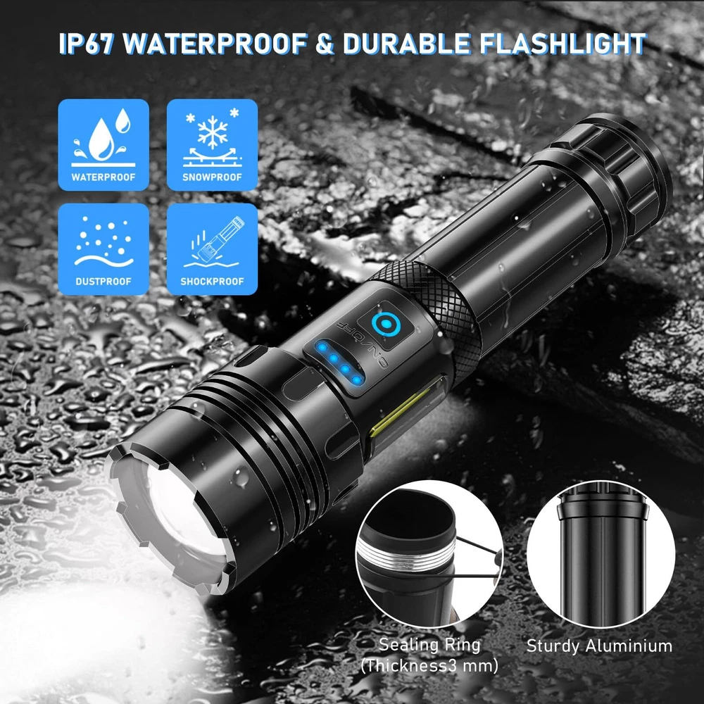 【SUPER BRIGHT LED FLASHLIGHT】: U1670 new flashlights high lumens is equipped with an upgraded XHP70.2 chip, which has a powerful output of 990,000 lumens, Instantly making the night you face into daylight. It projects an ultra-wide beam that illuminate areas up to 2160 square ft, easily lighting up your entire backyard. It can even illuminate objects 3,937 ft away. You can also adjust the focus range from spotlight to floodlight by stretching the head of the rechargeable flashlights. 【Upgraded 7 LIGHTING MODES FLASH LIGHT】: Unlike the common 5 modes flashlight rechargeable in the market, U1670 can be used for more occasions. Why? As the bright flashlight is equipped with a main led light and a COB side light, offering 2 lighting choices. The main led light includes 3 modes: High, Medium, Strobe. The COB side light has 4 modes: High, Medium, Red Light, Red Strobe. How to switch to COB light? Very easy: just press the button twice quickly no matter the main light is on or off. 【USB RECHARGEABLE & POWER INDICATOR】: The linterna recargable comes with rechargeable battery that provides up to 12 hours of runtime, with built-in short-circuit protection to extend battery life to 50,000 hours. The flashlights high lumens rechargeable also features a USB output for charging other electronic devices in an emergency. The power indicator also monitors the remaining power in real time, so you don't have to worry about suddenly running out of power. 【PREMIUM QUALITY MATERIAL & IP67 WATERPROOF】: Flash lights battery powered is made of high quality aircraft-grade alloy with an anodised anti-abrasive coating to ensure its durability and extreme impact resistance. It even can withstand being run over by a full-size truck, and still remain intact. With multiple waterproof and sealing treatments, dustproof and waterproof performance can reach the IP67 level. It can easily cope with extremely harsh environments such as heavy rains and sandstorms. 【2 PACK GREAT VALUE FLASHLIGHT KIT】:You will get:2* Powerful Flashlights, 2* Rechargeable Battery, 6* AAA Battery(with 2* White Battery Tubes, 2* AAA Battery Holder), 2* USB-C Cable, 1* Instruction manual, the Value Pack can meet your different needs. Moreover, also focuses on product quality, each handheld flashlight is subject to strict quality inspection. If you meet any problem, please feel free to contact our customer support team, we will provide you with the best solution.