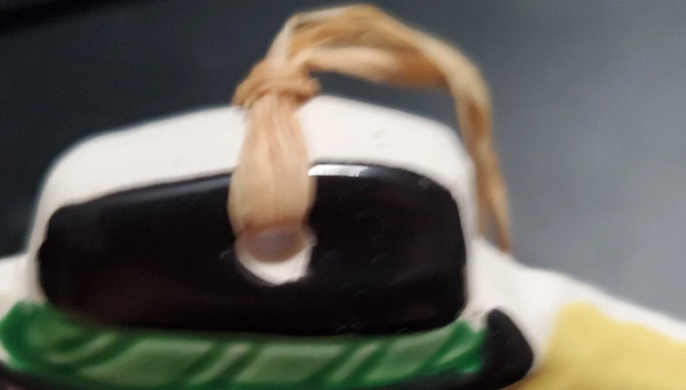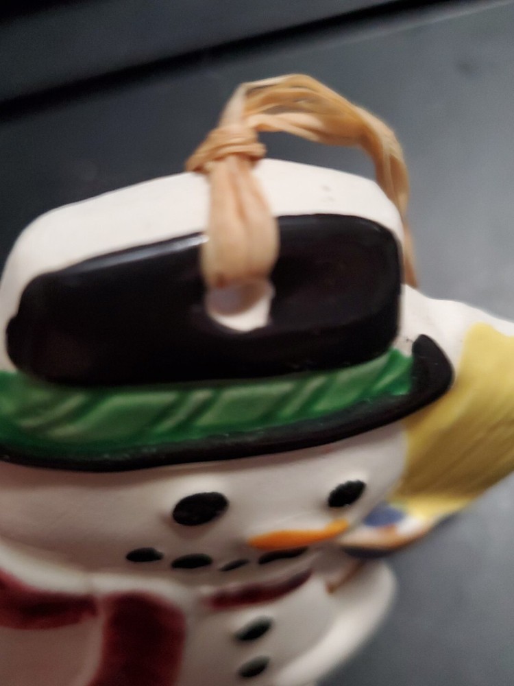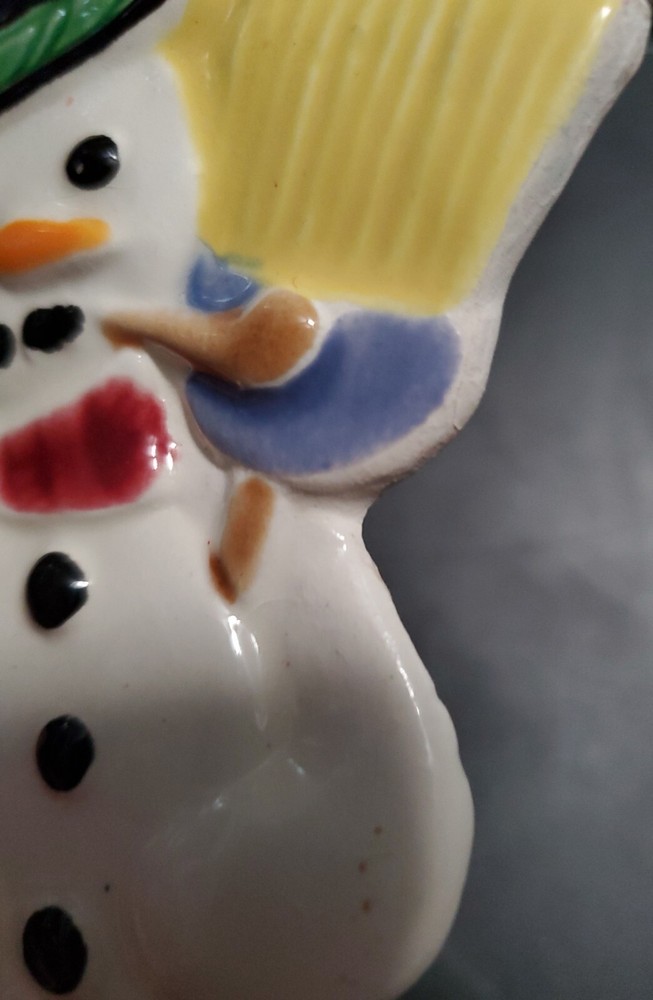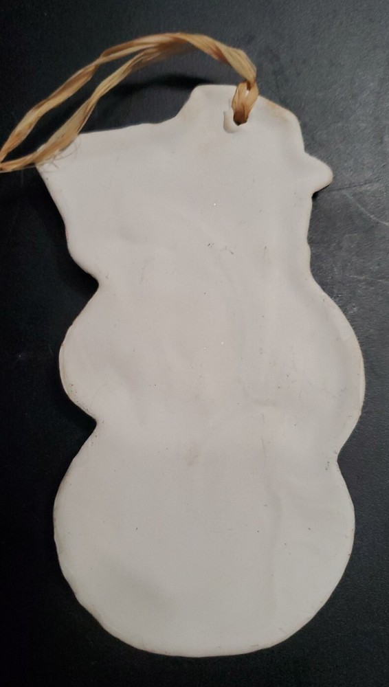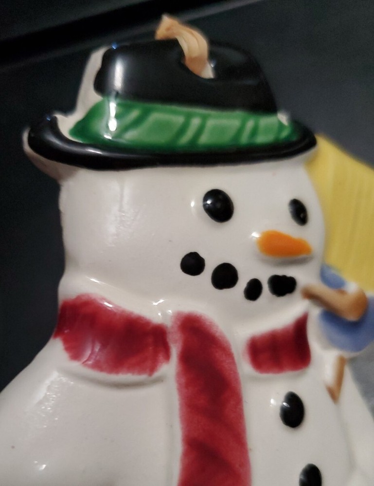 Flat ceramic glazed snowman ornament. All the props that Frosty had, corn cob pipe and all. Glossy finished at 6 inches in height