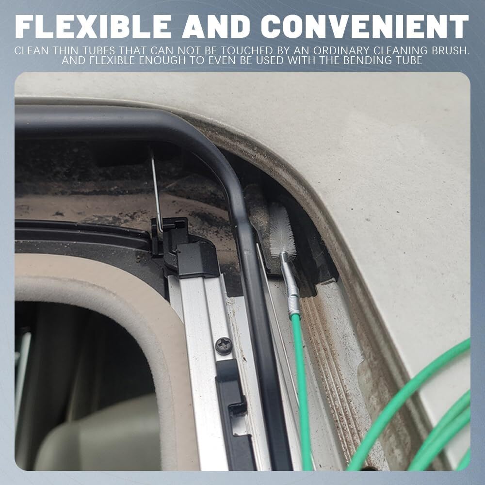 About this item [Nylon rotating bristles]: One end of the windshield cleaning tool is designed as a tubular brush, made of nylon material. The soft bristles can gently brush away sediment without scratching the rubber skylight hose, ensuring a more thorough cleaning of the pipeline. [Pull ring design]: One end of the car pipe cleaner features a hand pull ring, allowing for easy stretching and more convenient cleaning. This design helps prevent the car vent cleaner from falling into small pipes, making it easily retrievable and ensuring smooth use. [Flexible and easy to use]: The car cleaning brush has a length of 6.56FT/2M. The long strip design makes it highly flexible, allowing it to reach deep into bent hoses and tight spaces for thorough cleaning and effective clog removal. [Multiple uses]: This car detailing cleaning brush is versatile, suitable for cleaning car sunroofs, fuel tank drain holes, car wipers, skylight drain pipes, door drain holes, and more. It can also be used for cleaning refrigerator drain pipes, fish tanks, water pump accessories, and glass tubes, meeting a variety of needs. [Convenient tool]: The car cleaner brush can be easily rinsed with water after use, allowing for long-term reuse. It is compact and lightweight, making it easy to store and carry, which adds to its convenience. Dimensions: 9.53 x 5.16 x 0.63 inches.