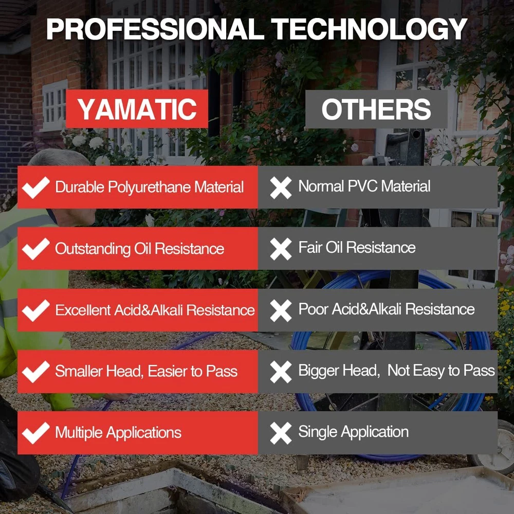 [Scrub Away Grease] 150 FT sewer jetter up to 4000 PSI working pressure & 10000 PSI burst pressure. Cleans household sewer drains, landscape drains, septic field lines, and more. Scrub away grease, sanitary paper, septic sludge, yard debris, ice, and other clogs. With M22-14mm adapters, it's a great for high pressure washer hose. [Easier to through] High-quality polyurethane jackets produce lower friction which avoids the layer being damaged due to friction in the bend, and easier to slide through tricky corners in the sewer. [Acid and Alkali Resistance] OEM standard quality polyurethane inner and outer pipe, performance better corrosion-resistant and could adapt to different acid and alkali environments. Improve better wear-resistant, oil-resistant and 3X longer service life than a normal plastic sewer jetter hose. [Flexible Than Others] Flexible sewer jetter hose and smaller turning radius for easier insertion in more types of drains. Ideal for cleaning around the corner, with a shorter but strengthen head and a flexible hose body, helps you unclog above 2.75" ID narrow and curved main drains, landscaping drains, or curved sewer and scrub the sides of dirty pipes and flush out the blockage in the sewer. [ECO-Material] pressure washer Hoses comply with environmentally-friendly RoHS standard and are made of recyclable material to protect your and earth clean. If you need any help, please feel free to us at any time, we're online 7x24.