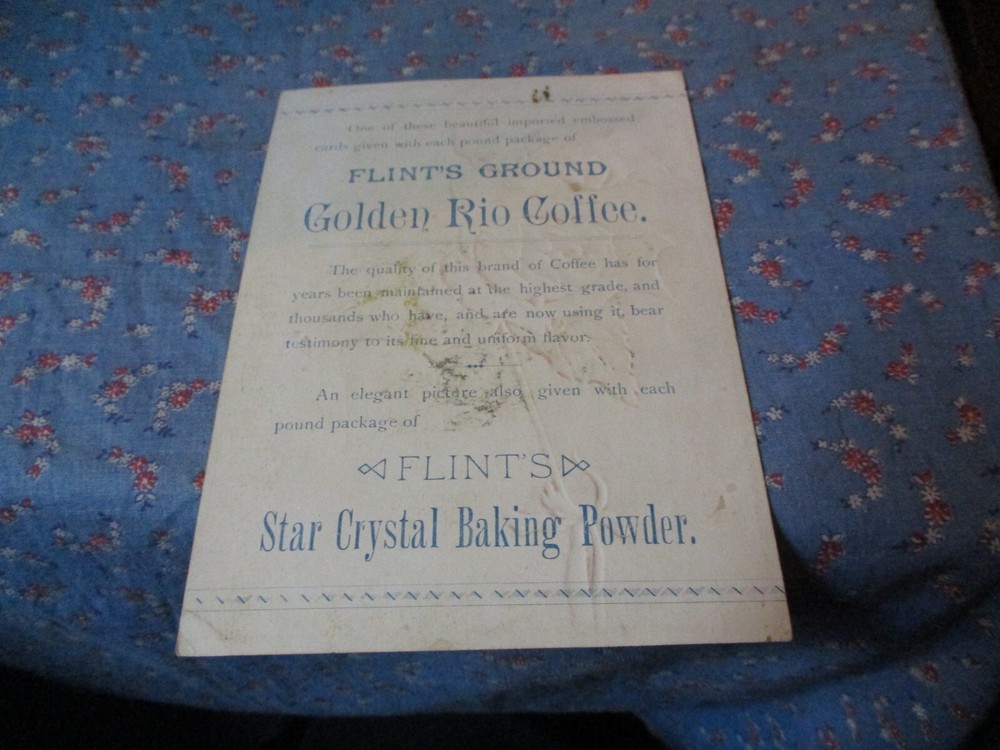 Type of Advertising:Trade CardSize:6 3/8 x 4 5/8 InchesBrand:Flint's Ground Golden Rio Coffee Star Crystal Baking PowderColor:Multi-colorSeller Notes:“Please look over the photos provided for more information about this item.”