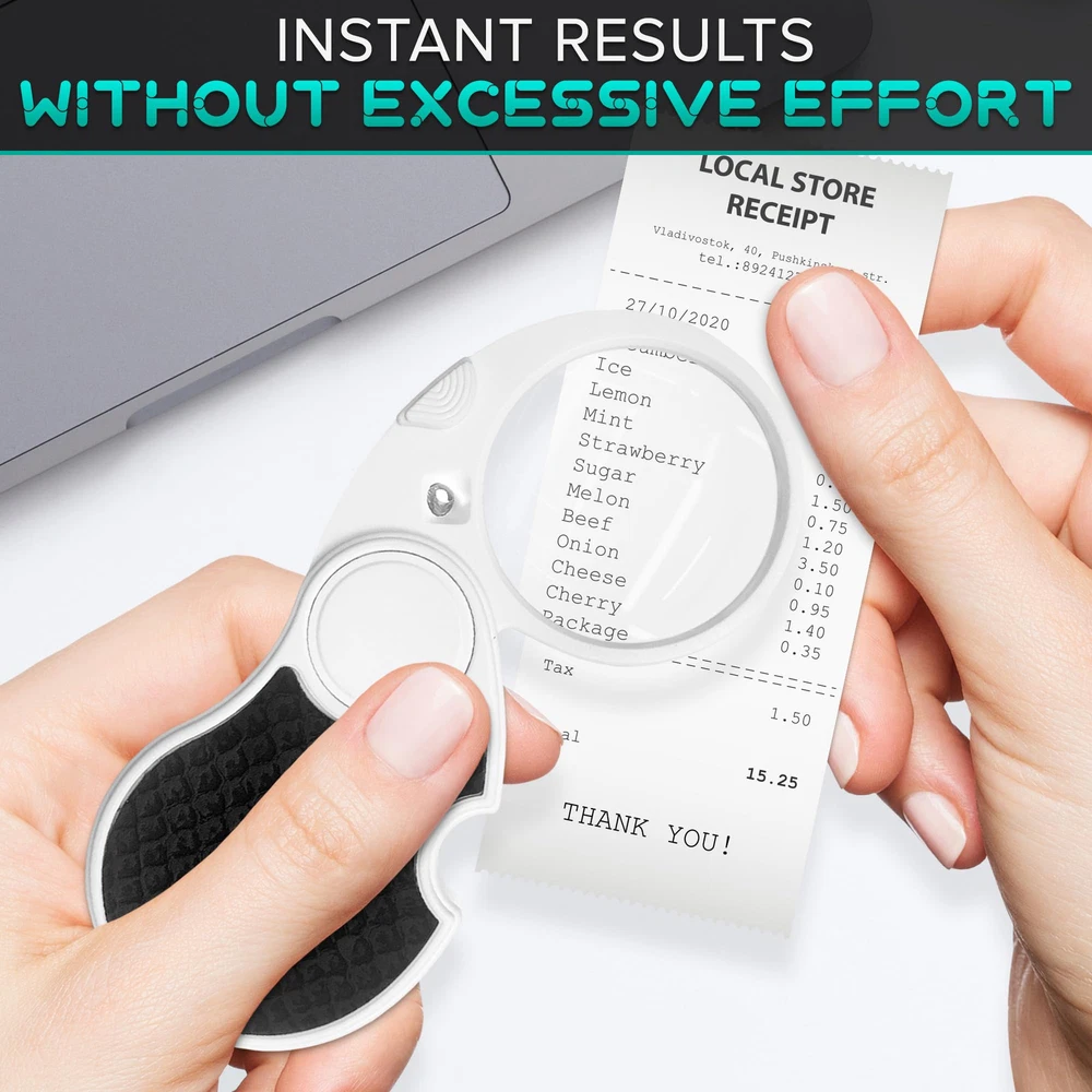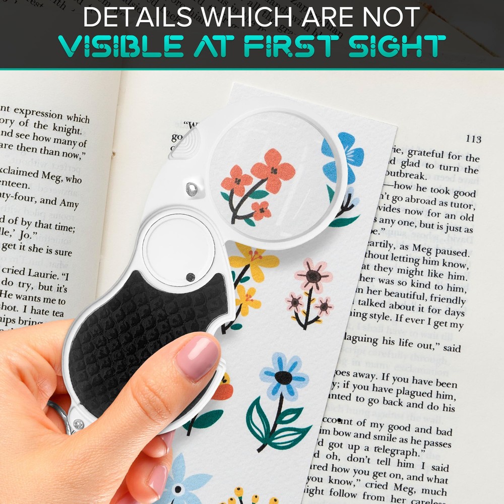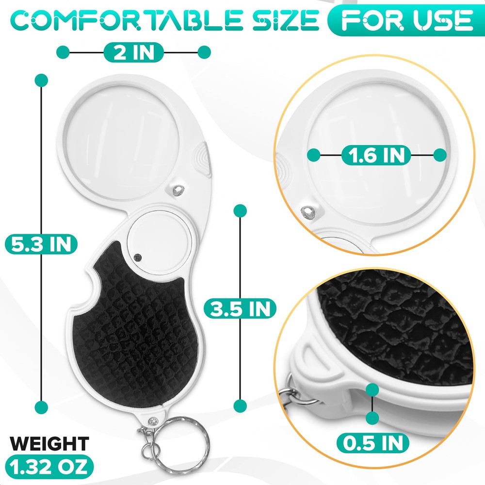 ❗ IMPORTANT ❗ Battery NOT INCLUDE. Premium Quality Magnifying Glass for Reading: Our handheld magnifying glass with light is made of premium quality material. The folding case of this folding glass always protects the glass lens well. Simply put the magnifying glass in your pocket or bag without worrying about scratches or damage. High Definition Optical Lens: The 5X lens of our pocket magnifying glass with light has high transparency and small dispersion coefficient, and the image clarity is good in the entire field of view. Our pocket magnifier with light protects your vision double-layer lenses, does not hurt the eyes. Size of Small Magnifying Glass with Lid: The size of our folding pocket magnifier is compactable, which is hold by all ages of humans. When the magnifying glass is unfold the length is 5.3 inches, the height is 0.5 inches and the width is 2 inches. When the reading magnifier for books is fold its size is 2*3.42 inches. Functional Design of Mini Magnifying Glass: Our pocket folding magnifying glass with black acrylic non-slip handle, neat and beautiful. Each lighted handheld magnifier adorned with mini keychain, which can be put into the wallet, shirt and pants pocket, flip head magnifier with a built-in folding case which can protects the lens from dust and damage. Ideal Gift Magnifying Glasses: People can use this folding led magnifier to work with tiny projects like circuitry, jewelry, embroidery, and more, you can actually use this magnifying glass with light for reading instead of regular reading glasses for people who hate wearing glasses.