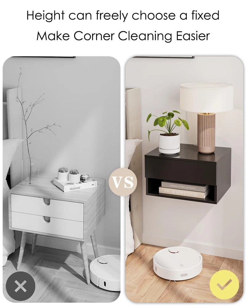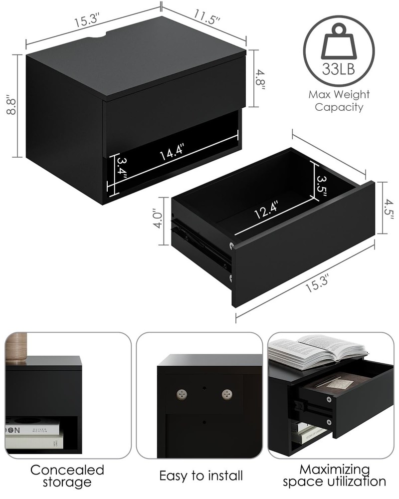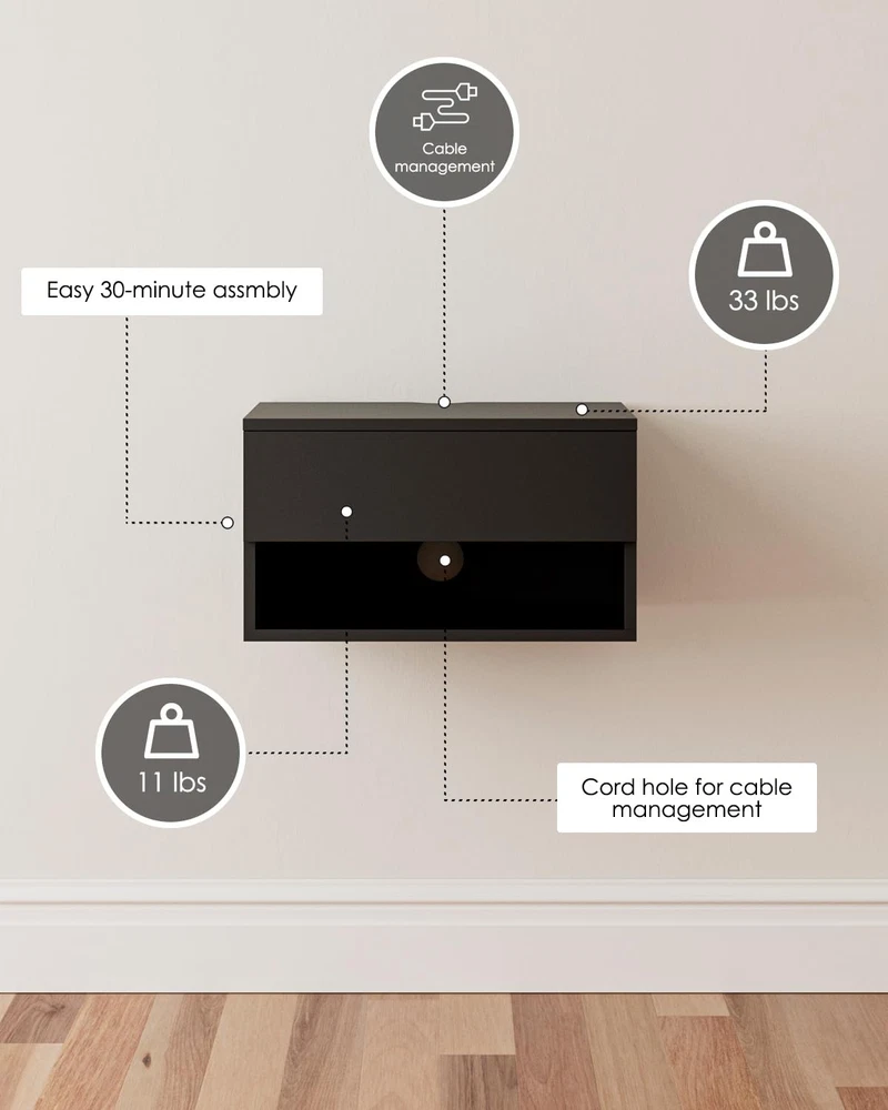 Floating Nightstand, Small Modern Floating Nightstand with Drawer, Floating Shelves for Bedroom, Bathroom, White Stripe Modern Convenient Design: floating nightstand is a space saving modern piece with both closed and open storage. Get ready to take your bedroom's convenience level up a notch with this wall mount nightstand. The light and simple lines of the white nightstand with its neutral and natural tones makes it a perfect element to blend well with any furniture. White nightstand is the ideal companion for your modern bedroom. Storage Space Saving: The hanging design gives you the flexibility to place it at any height and saves valuable floor space. Wall-mounted design keeps your floorspace clear, making your bedroom look more spacious and less cluttered. It provides a cozy atmosphere and fulfills all your functional needs for the perfect side table. Large Storage Capacity: The nightstands with both a drawer and an open compartment, it holds all your typical bedside essentials like books, magazines and glasses. The wide top is perfect for displaying a lamp, clock, potted plant or photo frame to offer warmth and personalized decoration. With its simple style, this night stand is just what your home decor needs. Multiple Uses Applications: closed front drawer and open cubby make this piece a perfect storage element to add to your living room or on each side of your bed. It is perfect to be used as vanity table , entryway wall cabinet or a nightstand in bedroom. Whether plays a role as a decor or holds life necessities, it always help a lot. This floating shelf with drawer makes for the perfect nightstand for all of your bedside needs. Easy to Assemble: The floating bedside table comes with detailed instructions and all necessary parts in the package. Create the bedroom of your dreams with this wonderfully unique floating drawer shelf. You can easily install this floating night stand, and quickly clean and use. Please feel free to if you have any questions on Nightstand. Modern Convenient Design: floating nightstand is a space saving modern piece with both closed and open storage. Get ready to take your bedroom's convenience level up a notch with this wall mount nightstand. The light and simple lines of the white nightstand with its neutral and natural tones makes it a perfect element to blend well with any furniture. White nightstand is the ideal companion for your modern bedroom. Storage Space Saving: The hanging design gives you the flexibility to place it at any height and saves valuable floor space. Wall-mounted design keeps your floorspace clear, making your bedroom look more spacious and less cluttered. It provides a cozy atmosphere and fulfills all your functional needs for the perfect side table. Large Storage Capacity: The nightstands with both a drawer and an open compartment, it holds all your typical bedside essentials like books, magazines and glasses. The wide top is perfect for displaying a lamp, clock, potted plant or photo frame to offer warmth and personalized decoration. With its simple style, this night stand is just what your home decor needs. Multiple Uses Applications: closed front drawer and open cubby make this piece a perfect storage element to add to your living room or on each side of your bed. It is perfect to be used as vanity table , entryway wall cabinet or a nightstand in bedroom. Whether plays a role as a decor or holds life necessities, it always help a lot. This floating shelf with drawer makes for the perfect nightstand for all of your bedside needs. Easy to Assemble: The floating bedside table comes with detailed instructions and all necessary parts in the package. Create the bedroom of your dreams with this wonderfully unique floating drawer shelf. You can easily install this floating night stand, and quickly clean and use. Please feel free to if you have any questions on Nightstand.