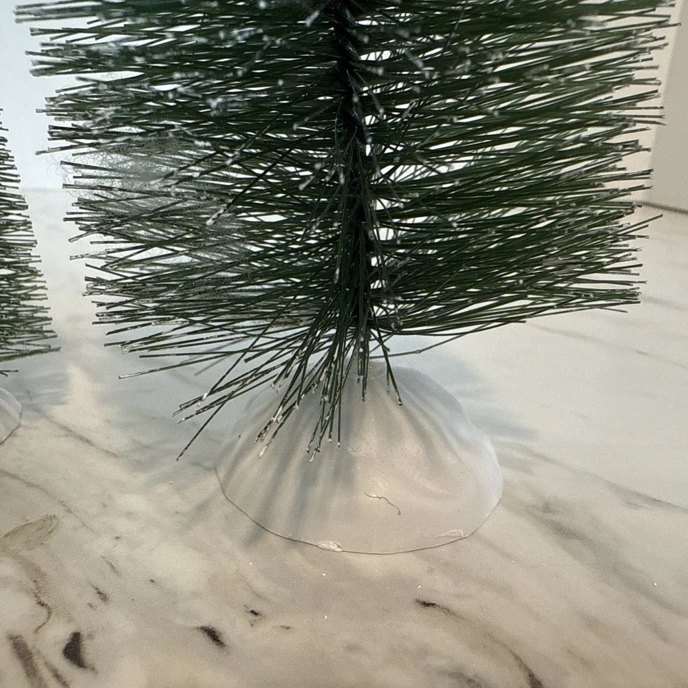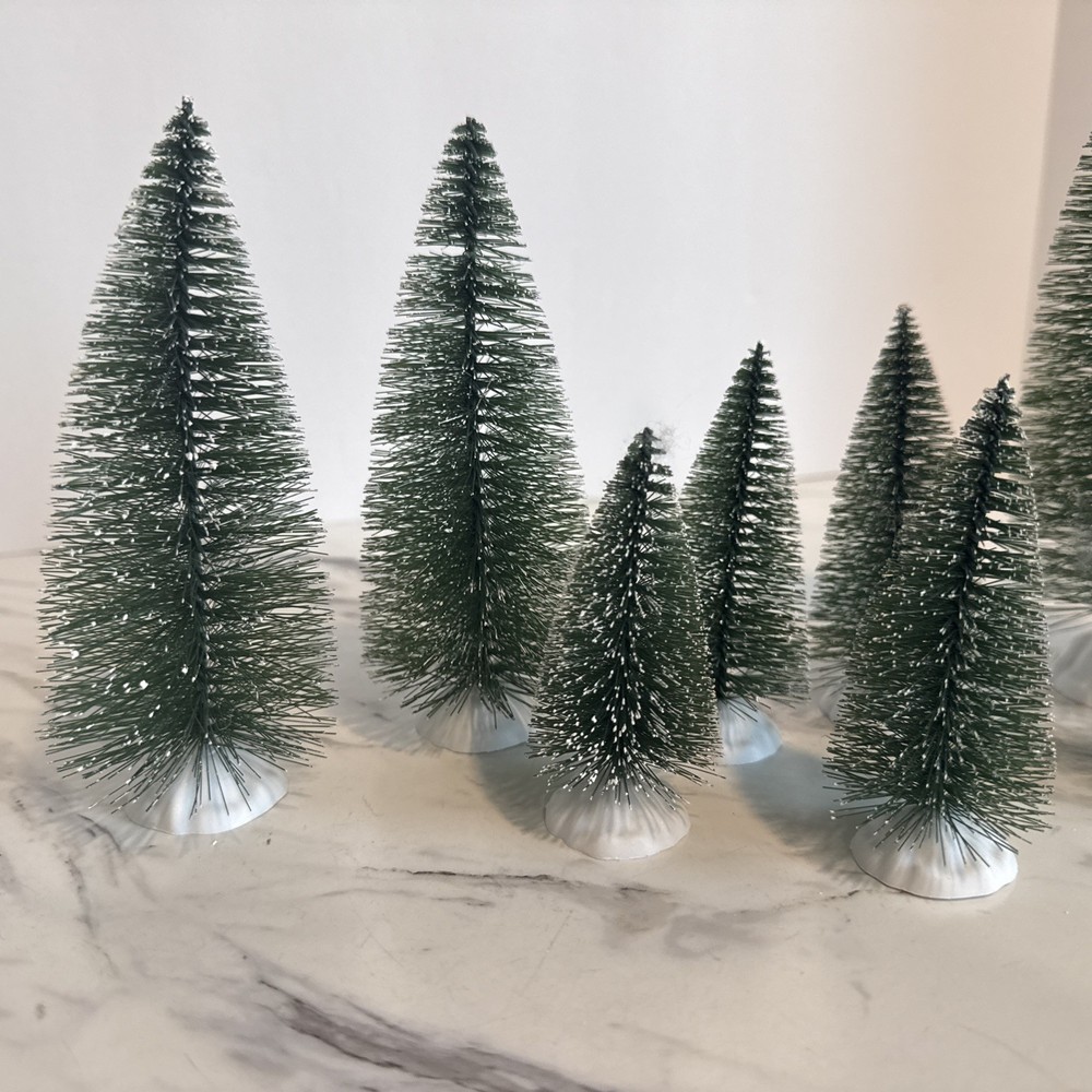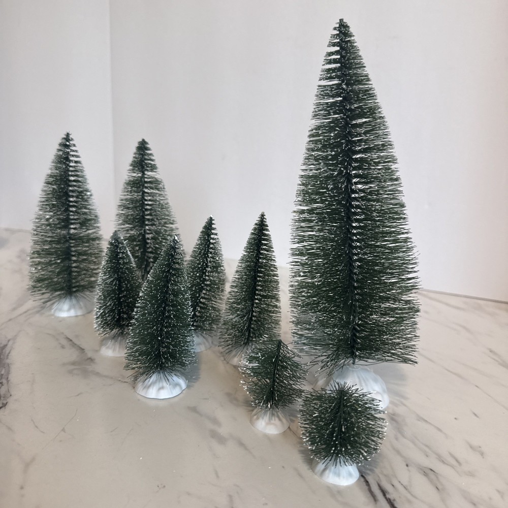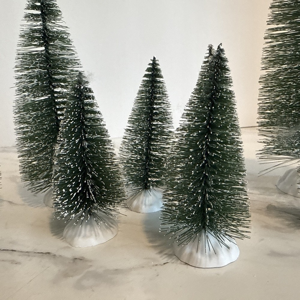 Bottle Brush Trees Christmas Village Flocked Lot of 9 Various Sizes Plastic Base Pre-Owned in very good condition. Made of wire brush, and bendable. The bases are white plastic. Thank you for looking and supporting my small business!