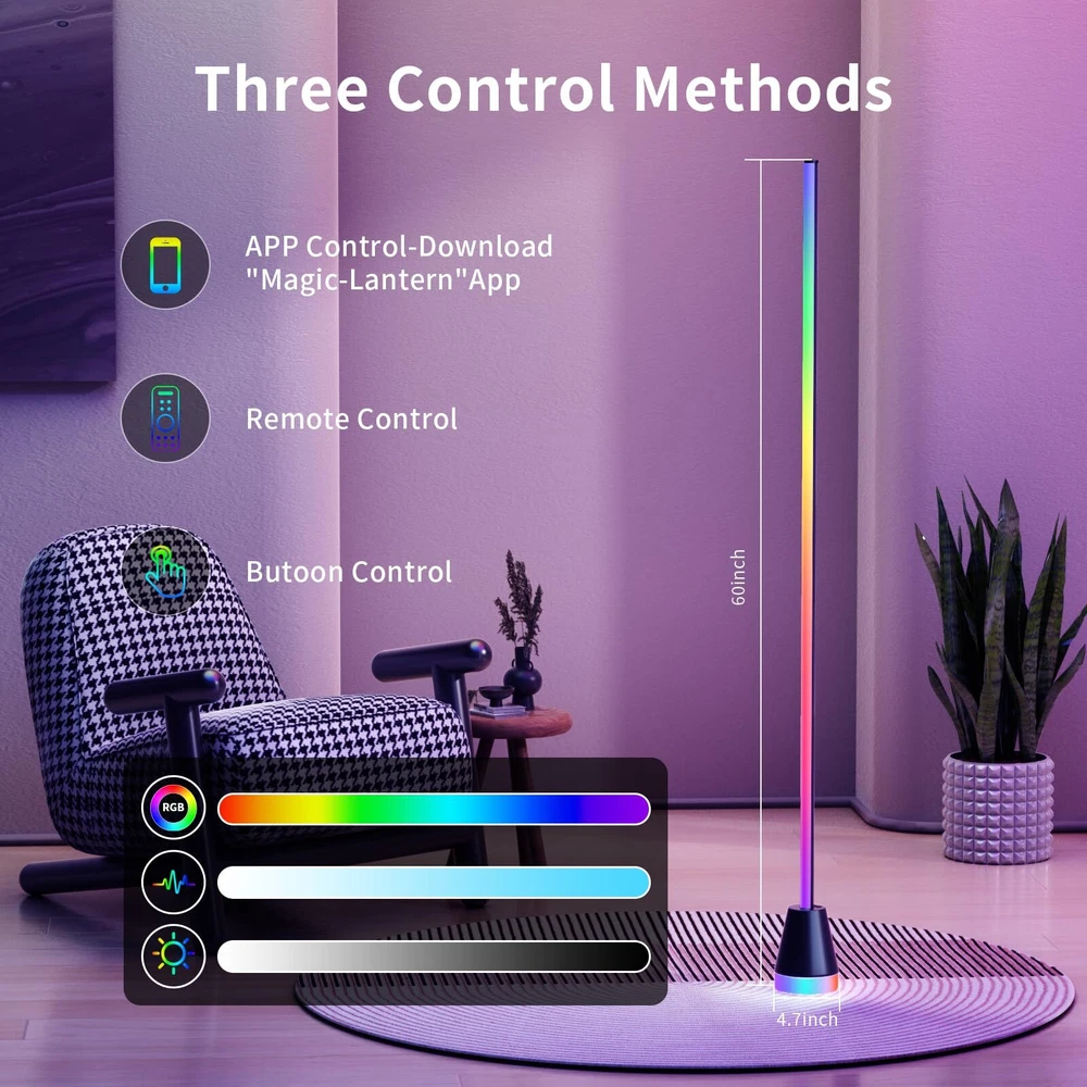 Luminous Base Design: Different from other floor lamps, corner lamp base can emit the same light according to the color of the light strip, which can illuminate a larger area. Create a more vivid atmosphere Smooth Lighting Effects: The lighting effect of this Christmas decorations is as smooth as flowing water, with no dark areas and lamp beads shadows, which makes the light projected on the wall more clearer and brighter Three Control Methods: You can use the remote, base buttons, or the "Magic-Lantern" APP to control this standing lamp. The APP allows you to select colors, adjust brightness and speed, set timers, and use multiple scene modes and music modes 16 Million Color Options and 213+ Scene Modes: You can choose the color and mode you want on the "Magic-Lantern" APP. DIY your ideal color to match your current mood and scene, making your life more vivid Music Rhythm Mode: The corner floor lamp has a built-in microphone, and the light will flash according to the volume, so you can intuitively feel the change of rhythm. Enhance your audio-visual entertainment experience Easy to install: Insert the three lamp tubes into the slots, tighten the 3 screws on the tube, and then plug in the power supply to enjoy the wonderful atmosphere brought by this Christmas decor. The whole install process will not exceed 3 minutes