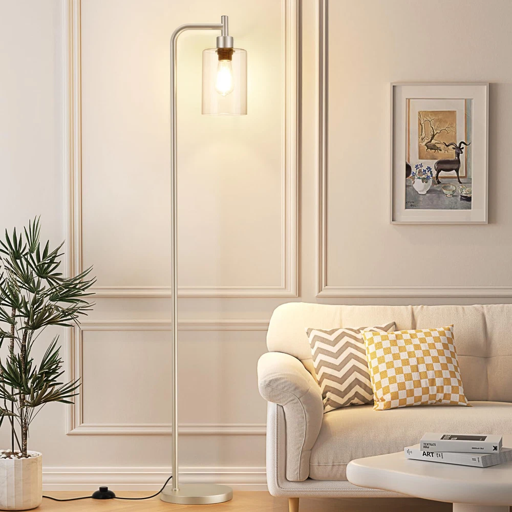 【Gold Floor Lamp with Modern Design】 - 64.5" floor lamp design style is simple and modern, and can match different styles of furniture you want. Tall lamp will transform your home decor into a rustic and farmhouse atmosphere. Gold standing lamp can fit perfectly in your living room, bedroom, corner or office and take up very little room and has a classy, look to it. Floor lamps for living room bright lighting both blends in and provides unassuming accent to the space. 【Replaceable LED Bulb】- Modern floor lamp with 3000K/6W LED bulb provides warm white light to create a comfortable atmosphere for your home. It's also brighter than those ordinary lamps and can light up a larger space in your home. This light bulb is replaceable and can be changed to the type you want according to your preferences. We have already provided you with a ST58 bulb, so you don't need to buy any more. 【Heavy Base, Safe to Use】- Industrial floor lamp has a highly stable base and lamp pole and can stand firmly on the floor, which prevents the elderly, children and pets from being overturned. The standing light is equipped with a rust-resistant gold metal body and a sturdy clear glass shade, which makes it look gorgeous and expensive. Based on the moderate weight of pole lamp, you can easily place it anywhere you want. 【Foot Pedal Switch, Liberate Your Hands】- In order to bring more convenience to your daily life, we specially chose the foot switch design for floor lamp. The on/off switch is a push button that sits on the floor so you could press it with your foot easily. With the simple flick of a switch, you can get lighting or not. Easy to operate, greatly liberate your hands! 【Easy to Assemble】 - This living room lamp can be easily assembled without tools, as all the detachable components are included in the package. In just a few minutes, you can the instructions to put all parts of the tall lamp together. Instructions are included in the package, and assembly are attached to the product page.