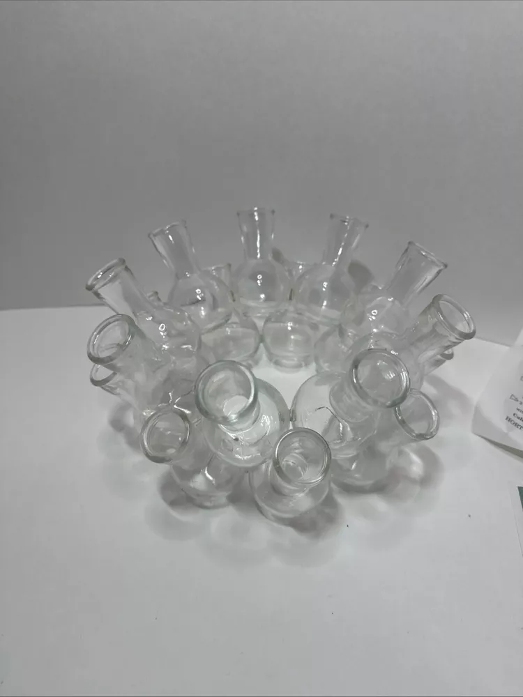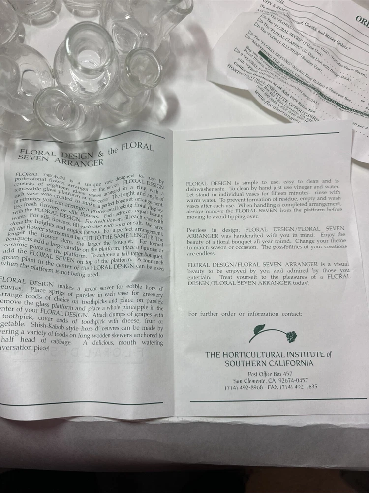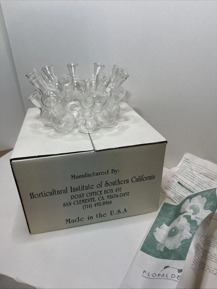 The Floral Design Set Horticultural Institute Glass Vase Arrange Propagation Station is a plant rearing set made of clear glass, round in shape, and manufactured in the United States. It is a product designed for plant care and soil accessories, specifically for seed starting accessories. The set is branded by the Horticultural Institute of Southern California.