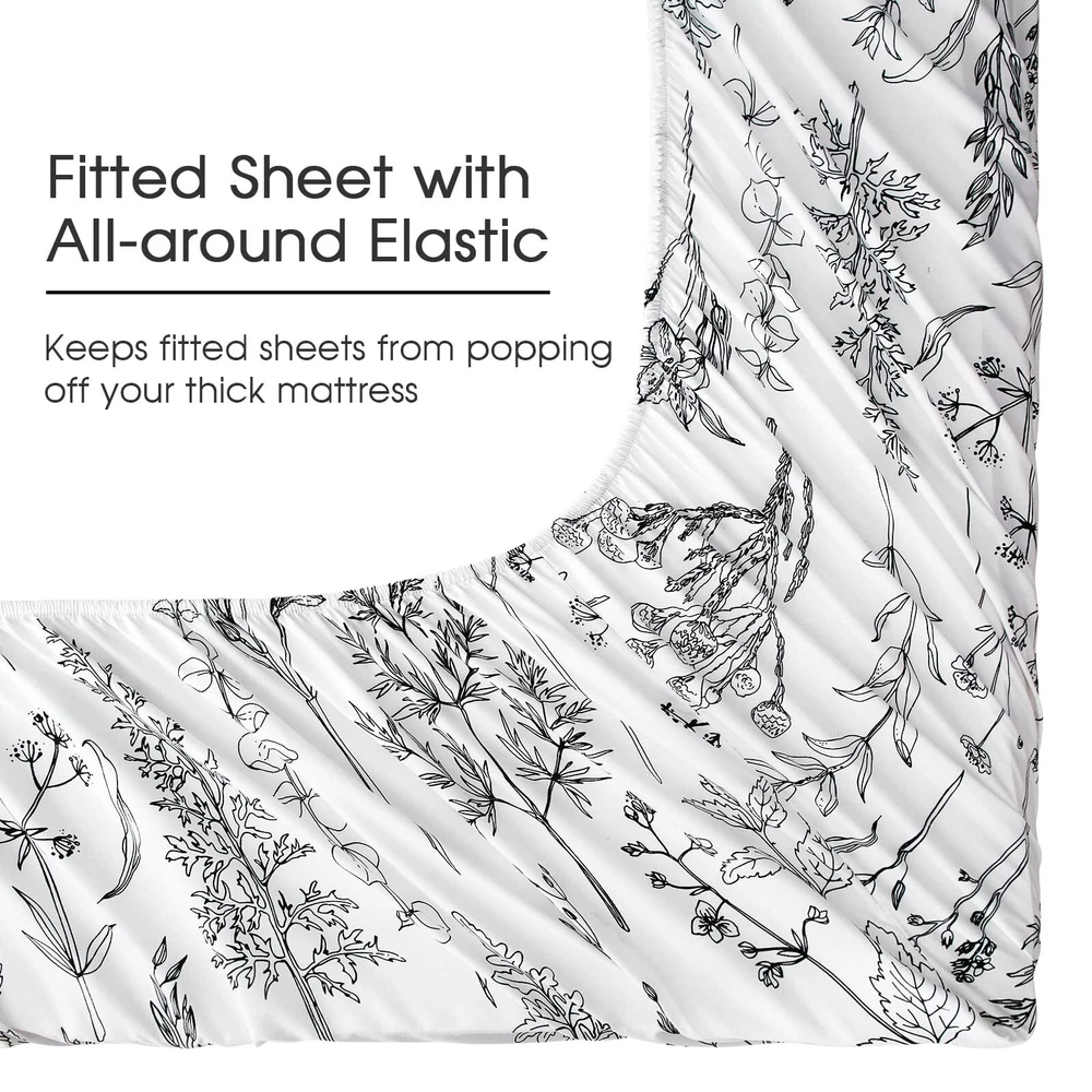 Drape your bed with luxury floral-printed sheet set 1800 Thread Count Microfiber Sheet Set - Made from premiun microfiber fabric, this white and black floral sheets is soft and smooth to touch, with no fade and wrinkle. Size Dimensions - 4 pieces queen pattern sheet , includes 1 flat sheet (90"x102"),1 fitted sheet (60"x80") and 2 pillowcases (20"x30"). our fitted sheet can stretch to fit the mattress up to 18"inches, and it will not move around. Standard 100 by OEKO-Tex : All our microfiber bedding are Oeko-Tex Certified, a worldwide independent testing and certification system that can ensure our sheet set follows strict manufacturing guidelines. Easy Care and Durable: Machine washable on gentle cycle, wash this queen sheets set before first use can add softness, tumble dry low.
