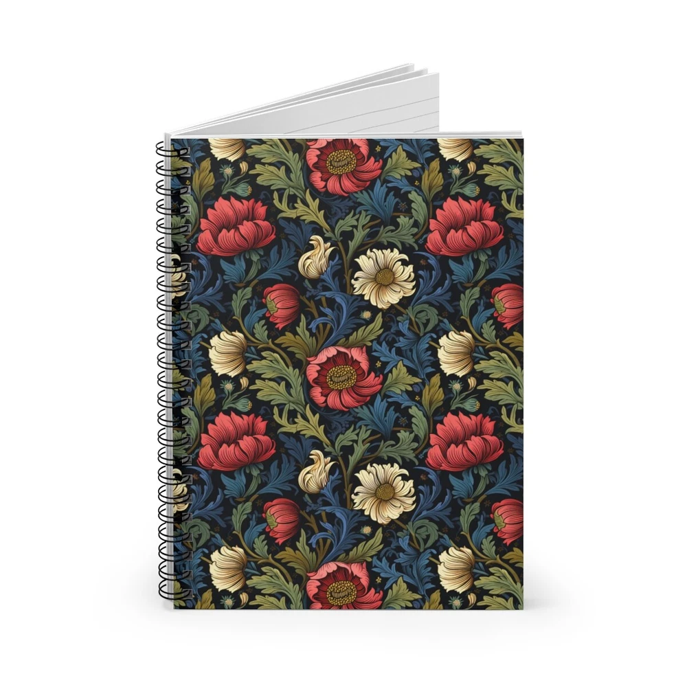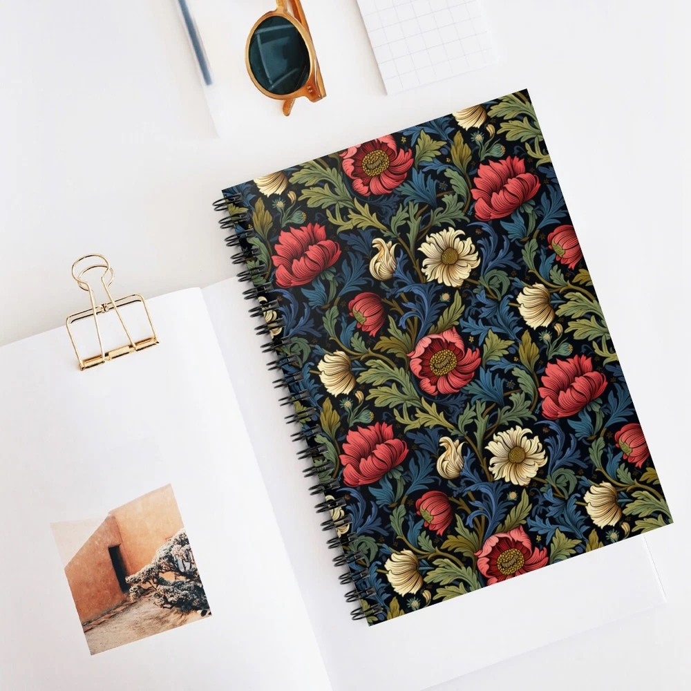 Introducing our exquisite floral themed spiral sketchbook, inspired by the iconic William Morris style flowers. This stunning blank notebook exudes elegance with its intricate botanical motifs and vibrant color palette. Let your creative ideas bloom as you flip through its high-quality, blank pages, perfect for sketching, doodling, or journaling. Whether used as a personal diary, travel companion, or artist's muse, this floral themed spiral sketchbook is sure to inspire and delight. Embrace the beauty of nature and indulge in the artistic allure of blooming flowers with this enchanting masterpiece. - Ruled line paper - The durable printed cover - Dark grey back cover - 118 ruled line pages (59 sheets) - Front cover print - Height, in 7.99 - Length, in 5.98 - Depth, in 0.59