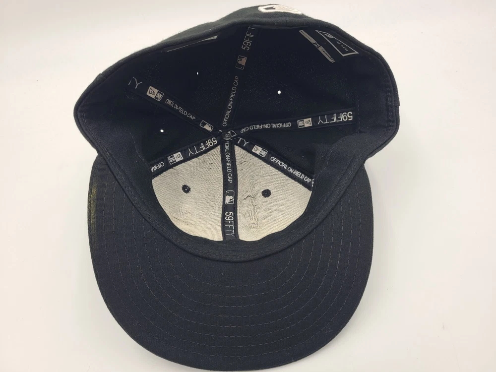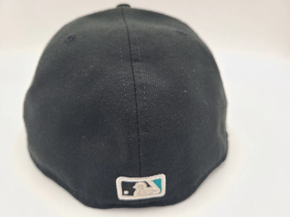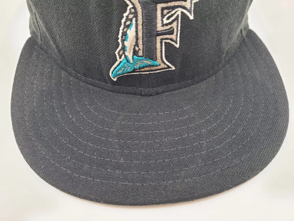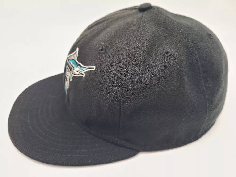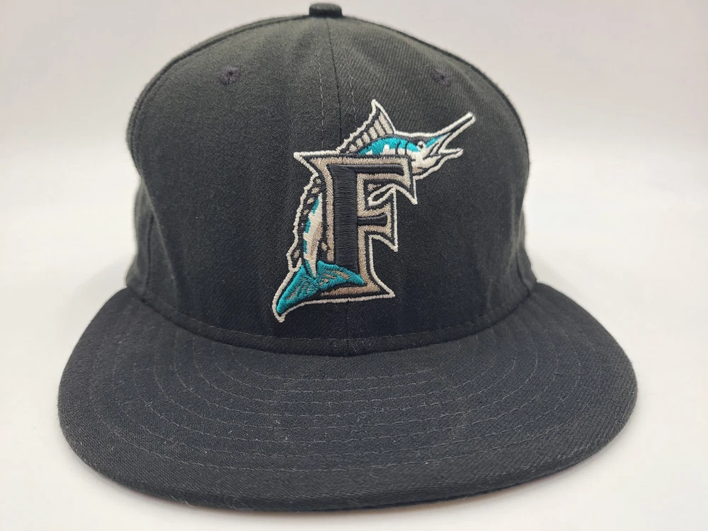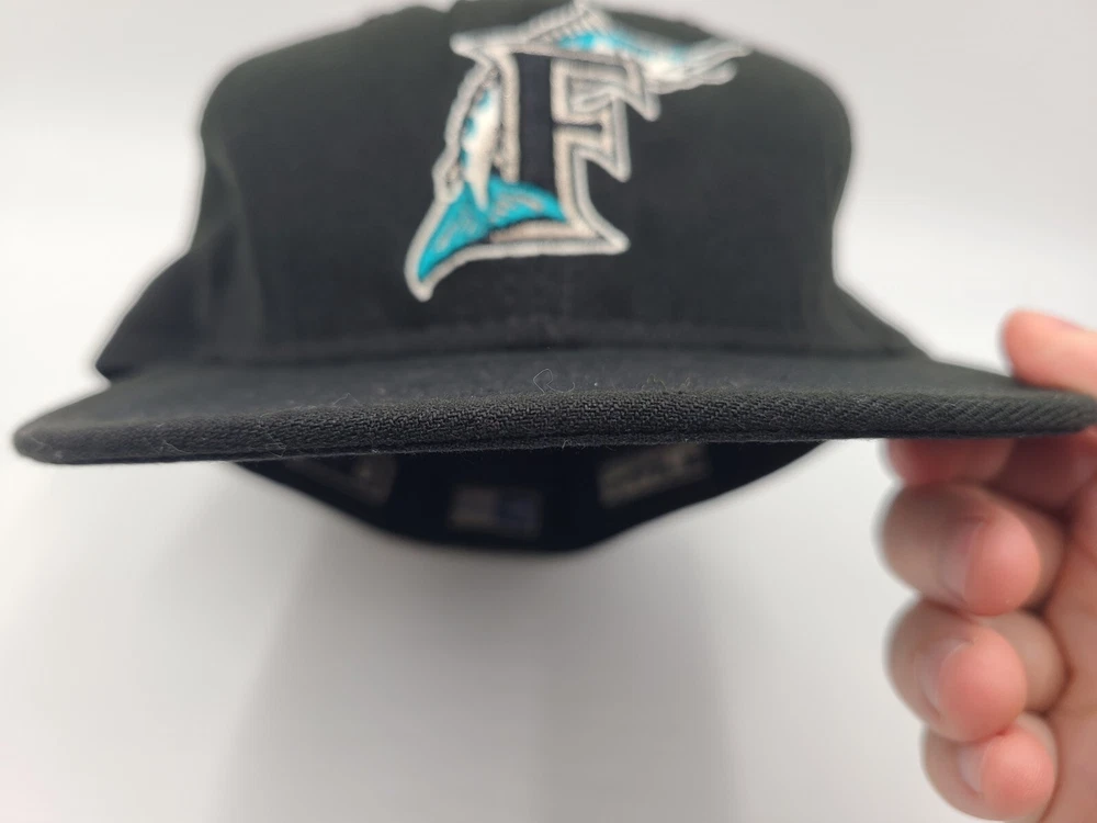 The brim is slightly misshapen as seen in photos. Also has a mark left over from the sticker on the brim and stains underneath the brim. Florida Marlins New Era 59Fifty Fitted 8 Hat Cap Miami Men MLB Baseball Black. EACH ADDITIONAL HAT PURCHASED IS ONLY $1 ADDED SHIPPING!
