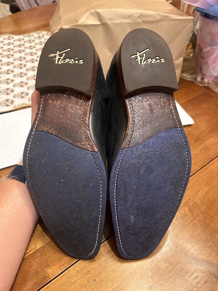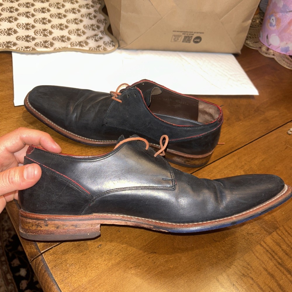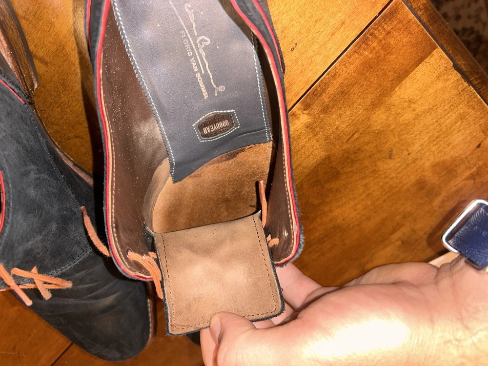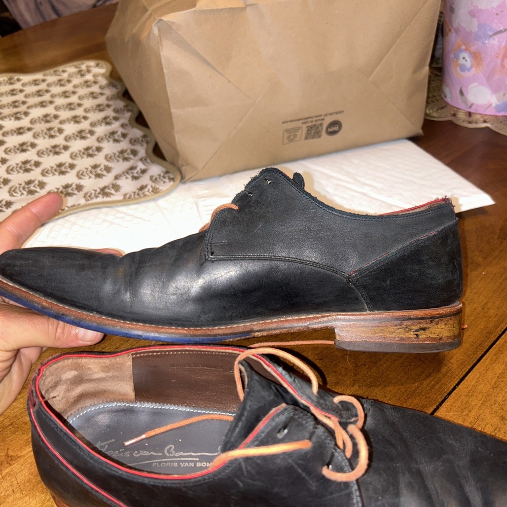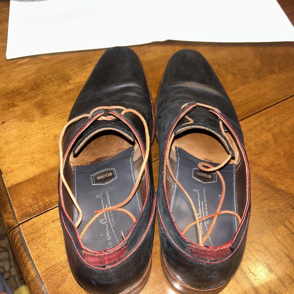 Well kept black/very very dark navy, with red accent, orange laces, and brown soles with black accent. These are handmade leather shoes and very well made at that. They are heavy in a good way when it comes to custom high quality leather shoes this is what you’re looking for. The color pattern and light wear makes these shoes better. They give off seasoned formal with a very light casual (I know how to have a good time better than anyone, while remaining the man and respected vibes). I guarantee you the previous owner was an absolute legend. Give ‘em a polish and shine and you will be thrilled. (Most other ones they do that, the pictures I took are as I got them). I’ll polish them for you if you’d like just let me know. These are great, will last another 40 years, and they are some damn cool shoes. If they fit me I wouldn’t have gotten this far in the description. Sold from a seller who will ensure you are happy. Floris Van Bommel - vintage leather dress shoes - Black/dark navy with red accent dress shoes - genuine leather handmade dress shoes. Original Goodyear welting