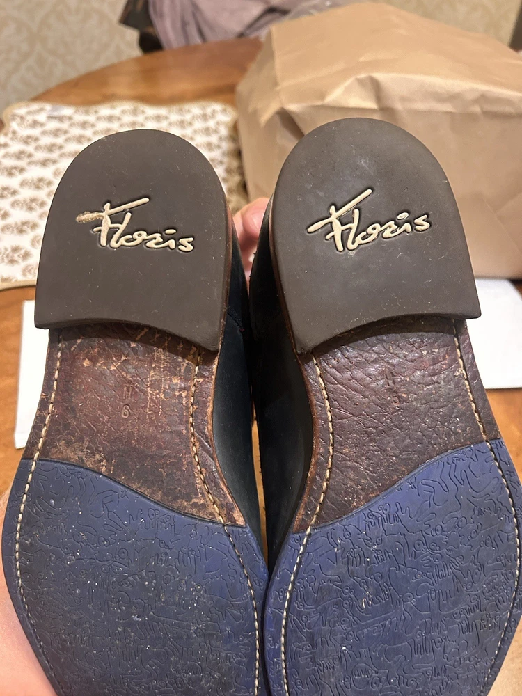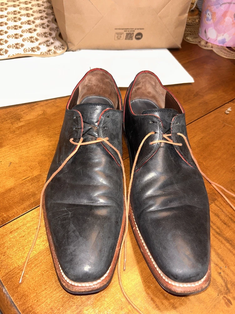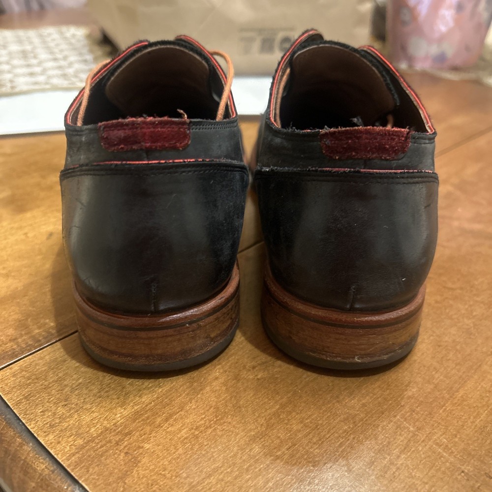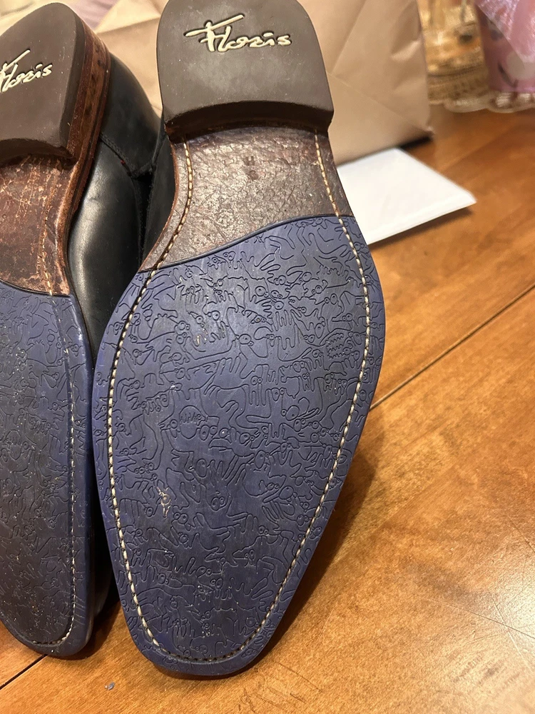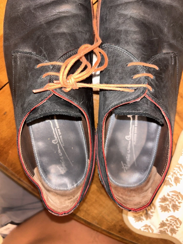 Well kept black/very very dark navy, with red accent, orange laces, and brown soles with black accent. These are handmade leather shoes and very well made at that. They are heavy in a good way when it comes to custom high quality leather shoes this is what you’re looking for. The color pattern and light wear makes these shoes better. They give off seasoned formal with a very light casual (I know how to have a good time better than anyone, while remaining the man and respected vibes). I guarantee you the previous owner was an absolute legend. Give ‘em a polish and shine and you will be thrilled. (Most other ones they do that, the pictures I took are as I got them). I’ll polish them for you if you’d like just let me know. These are great, will last another 40 years, and they are some damn cool shoes. If they fit me I wouldn’t have gotten this far in the description. Sold from a seller who will ensure you are happy. Floris Van Bommel - vintage leather dress shoes - Black/dark navy with red accent dress shoes - genuine leather handmade dress shoes. Original Goodyear welting