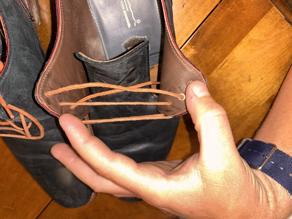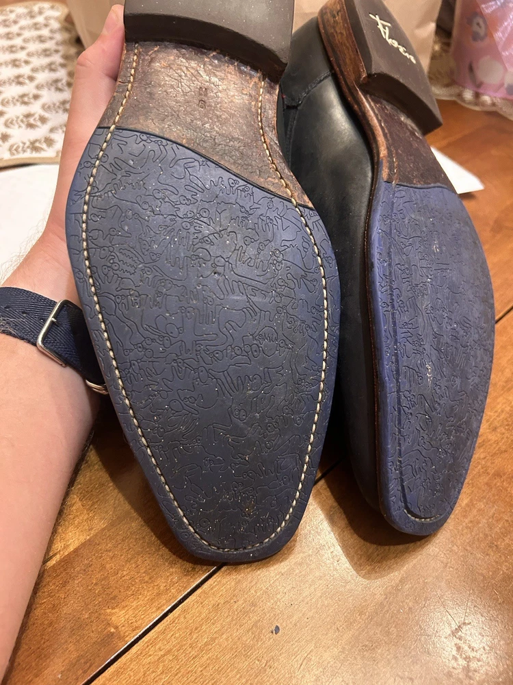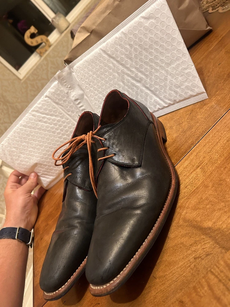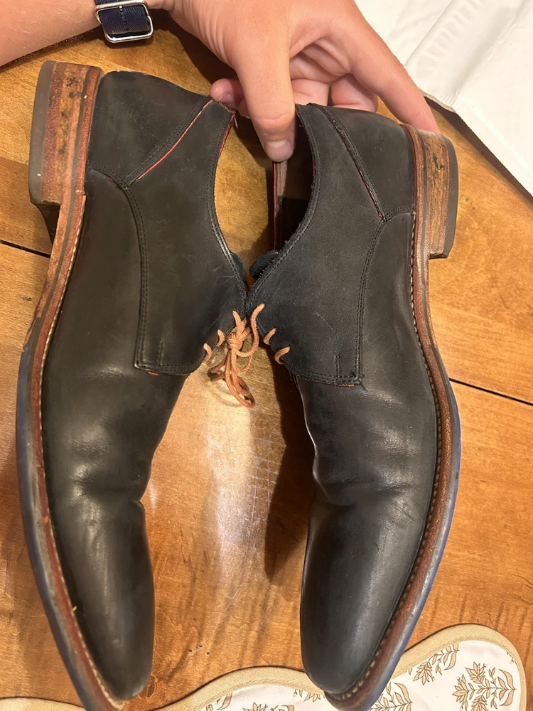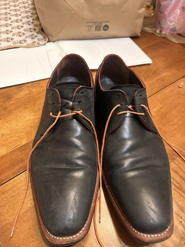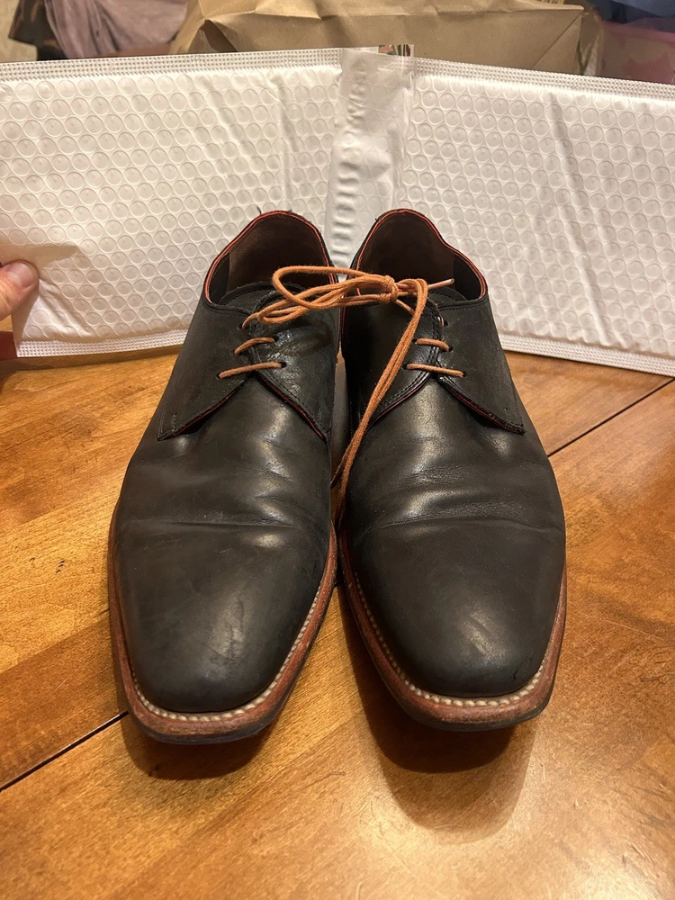 Well kept black/very very dark navy, with red accent, orange laces, and brown soles with black accent. These are handmade leather shoes and very well made at that. They are heavy in a good way when it comes to custom high quality leather shoes this is what you’re looking for. The color pattern and light wear makes these shoes better. They give off seasoned formal with a very light casual (I know how to have a good time better than anyone, while remaining the man and respected vibes). I guarantee you the previous owner was an absolute legend. Give ‘em a polish and shine and you will be thrilled. (Most other ones they do that, the pictures I took are as I got them). I’ll polish them for you if you’d like just let me know. These are great, will last another 40 years, and they are some damn cool shoes. If they fit me I wouldn’t have gotten this far in the description. Sold from a seller who will ensure you are happy. Floris Van Bommel - vintage leather dress shoes - Black/dark navy with red accent dress shoes - genuine leather handmade dress shoes. Original Goodyear welting
