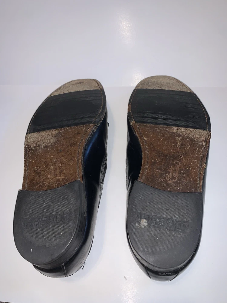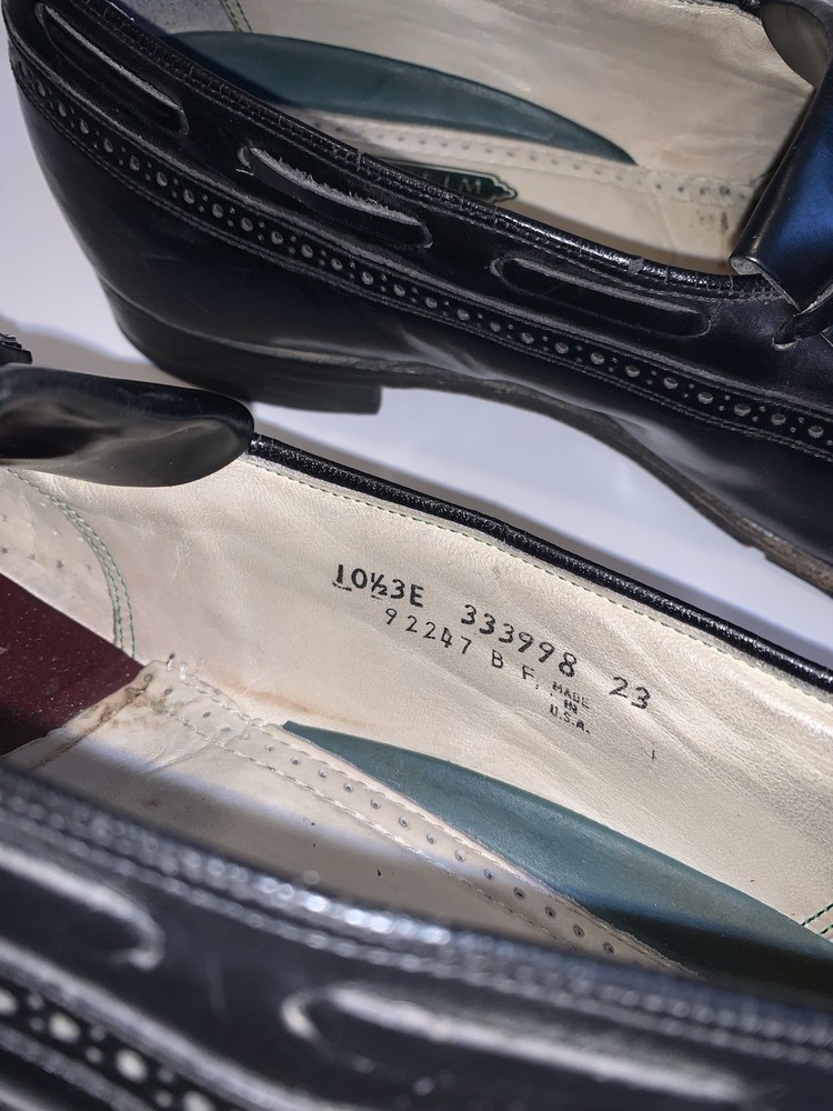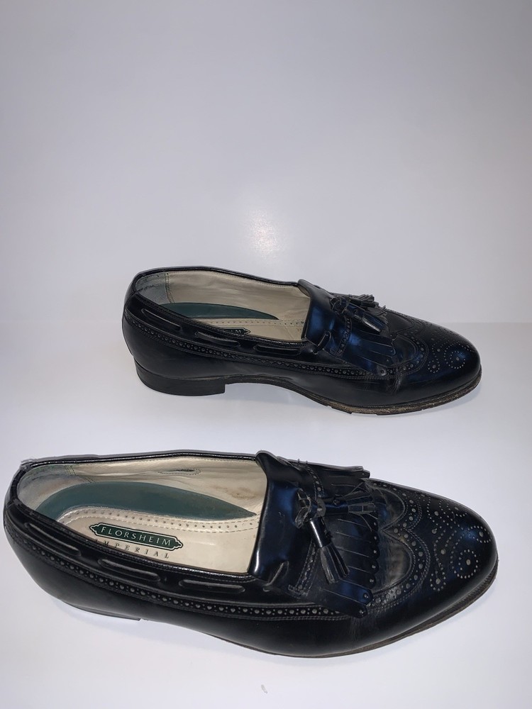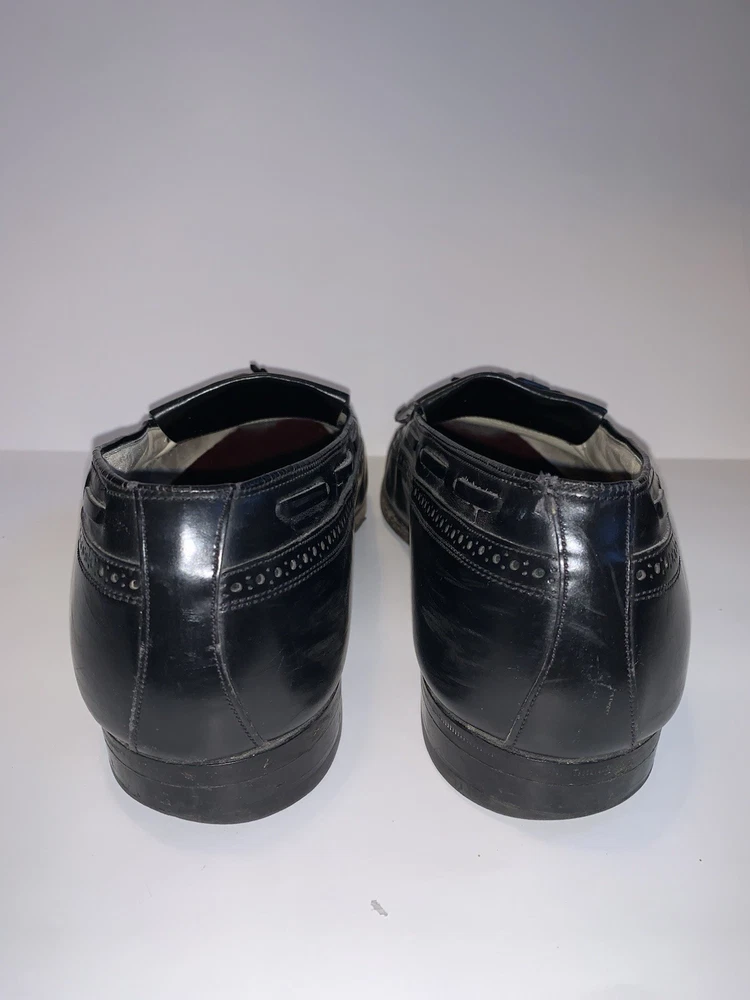 The Florsheim Imperial Comfortech Men's Tassel Loafers in size 10.5 3E are classic black wingtip leather shoes with an almond toe shape and tasseled accents. These slip-on loafers are vintage and feature a wingtip design, making them a stylish and sophisticated choice for any man's dress collection. Crafted in the USA with high-quality leather, these shoes are perfect for the summer, fall, and spring seasons, adding a touch of timeless elegance to any outfit.